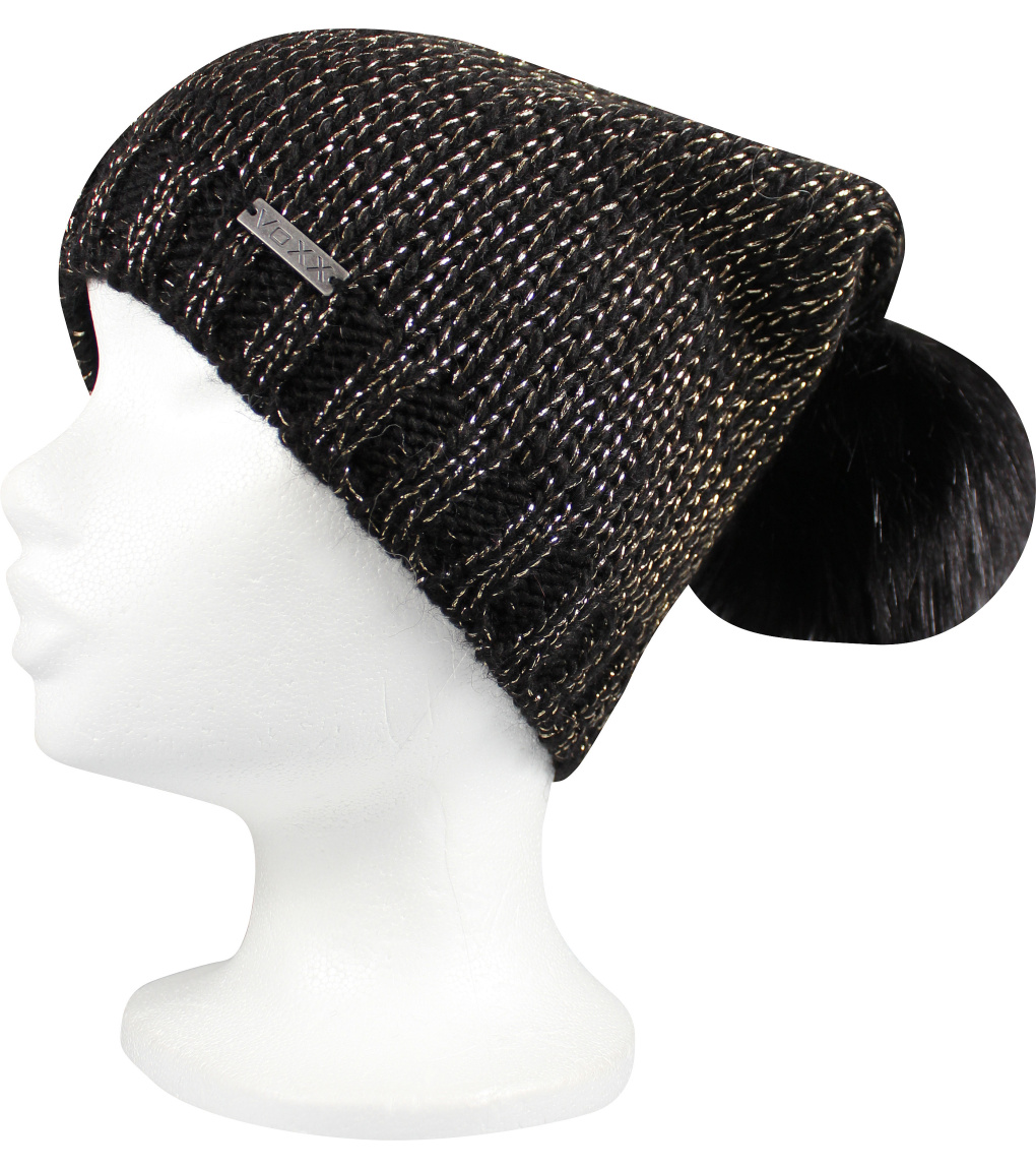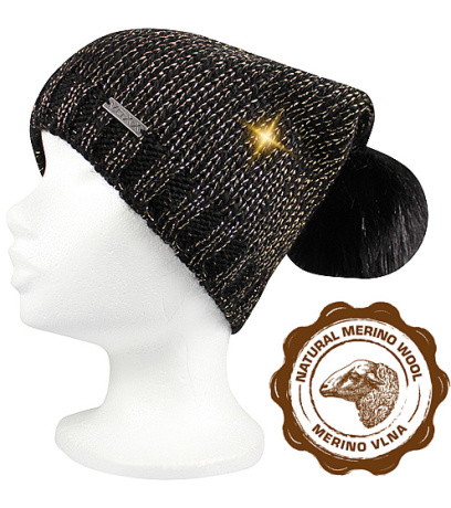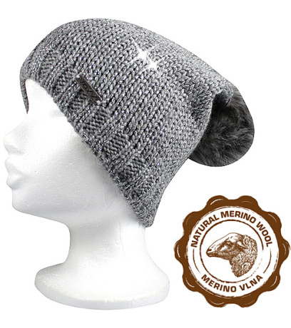 Dzianinowa czapka damska wykonana z wełny merino i włókien LUREX, wewnątrz mikropolar.