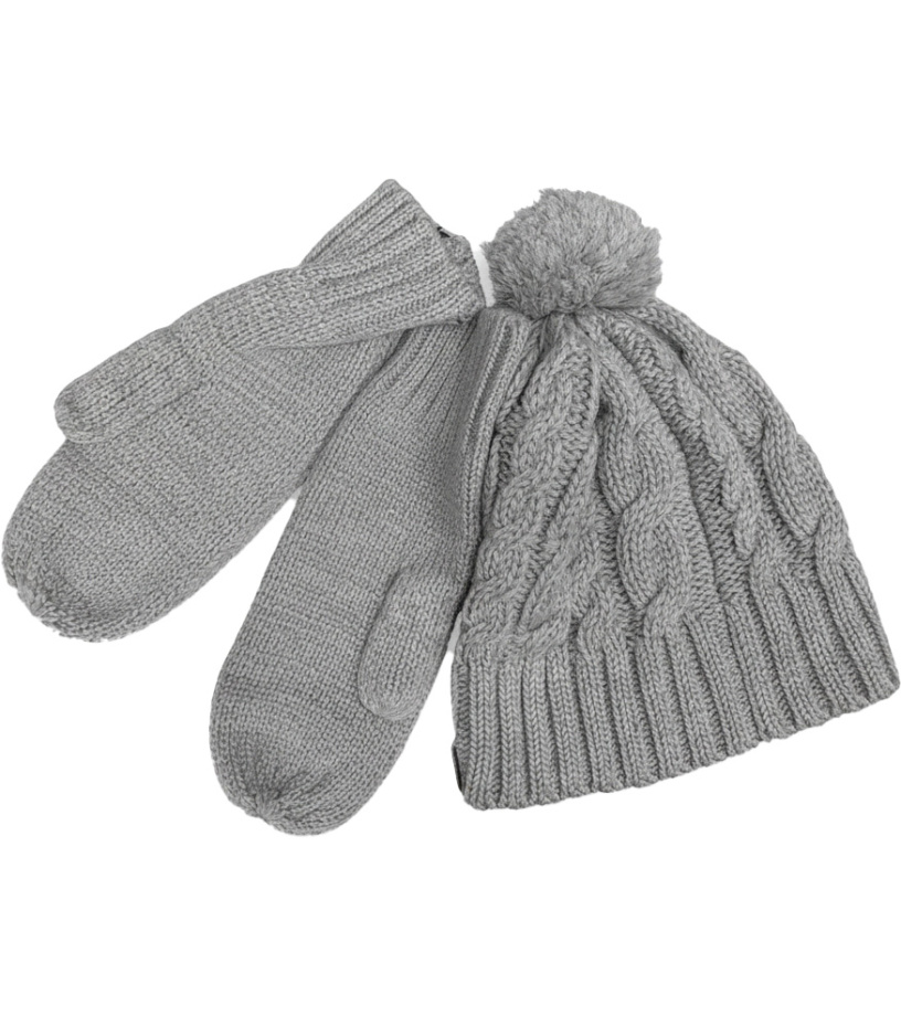 Stylowy zimowy komplet czapka i rękawiczki w neutralnym szarym kolorze. Dzianinowa czapka z charakterystycznym warkoczowym wzorem i miękkim pomponem na wierzchu nadaje nowoczesny i ciepły wygląd. Proste rękawiczki są przyjemne w dotyku i zapewniają komfort nawet w chłodne dni. Komplet idealnie nadaje się do noszenia na co dzień zimą, można go łatwo łączyć z płaszczem i kurtką sportową, zapewniając niezawodną ochronę przed zimnem.