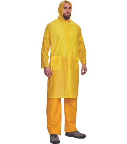 Wodoodporny płaszcz przeciwdeszczowy z kapturem. Lekki materiał wykonany ze zmiękczonego PVC bez siatki tekstylnej. Przedłużona długość za kolana. Wszystkie szwy łączące są uszczelnione. Dwie przednie kieszenie kryte klapkami przeciwko przenikaniu wody. Dolną część rękawów można regulować za pomocą zatrzasku. Wentylacja na plecach i pod pachami.