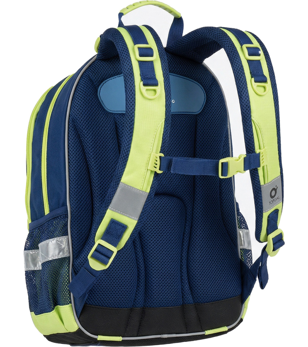 Wyściełane oparcie z oddychającego materiału oraz miękko wyściełane, regulowane szelki zapewniają maksymalny komfort. Dodatkowo, pas piersiowy zapewnia lepsze dopasowanie do pleców, a elementy odblaskowe zwiększają bezpieczeństwo dziecka. Praktyczny uchwyt górny umożliwia łatwe przenoszenie lub zawieszenie.