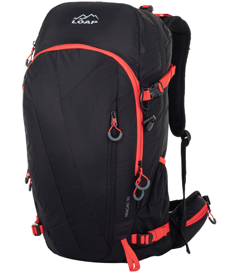 Średniej wielkości plecak turystyczny Loap ARAGAC 30 ze zintegrowaną osłoną przeciwdeszczową ma pojemność 30 litrów i nośność 9 kilogramów. Solidny system nośny SBS gwarantuje wygodne noszenie i niezawodnie chroni zawartość plecaka. Plecak wykonany jest z bardzo wytrzymałego i mocnego materiału Rip Stop, który zapobiega przetarciom. Obszerny jednokomorowy plecak ładowany jest od góry. Ma pięć kieszeni zewnętrznych i jedną kieszeń wewnętrzną z miejscem na worek hydro. Szelki mają anatomiczny kształt. Pas biodrowy, boczne paski kompresyjne i regulowany pas piersiowy odciążą plecy. Na plecaku znajdują się także praktyczne uchwyty na inny sprzęt.