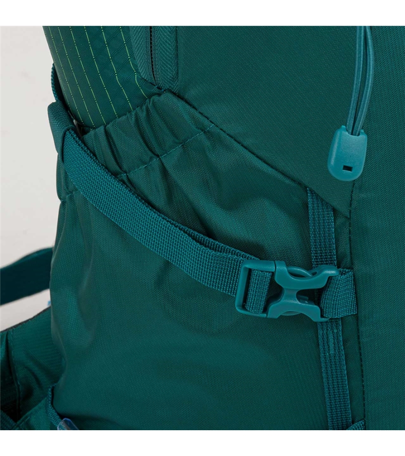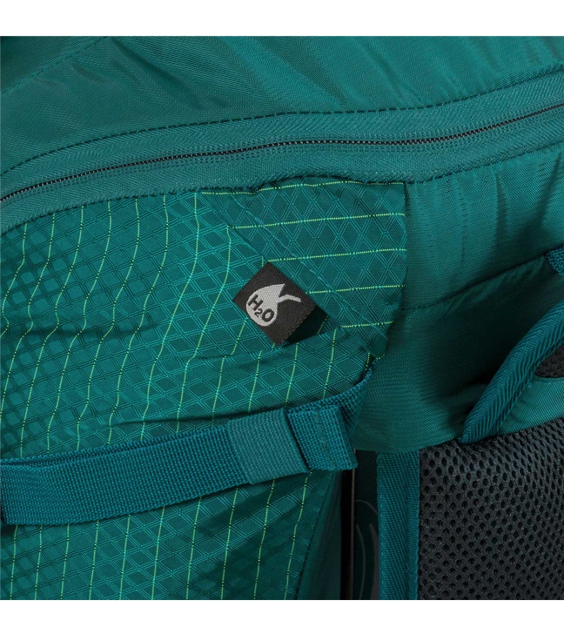 Plecak ma kieszenie przednie i boczne, kieszenie zapinane na zamek w pasie biodrowym, oczka na czekan i zaczep do kijka. Wewnątrz znajduje się kieszeń na worek na wodę oraz otwór na rurkę.