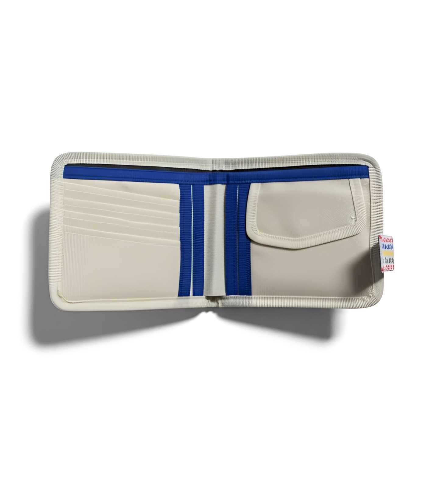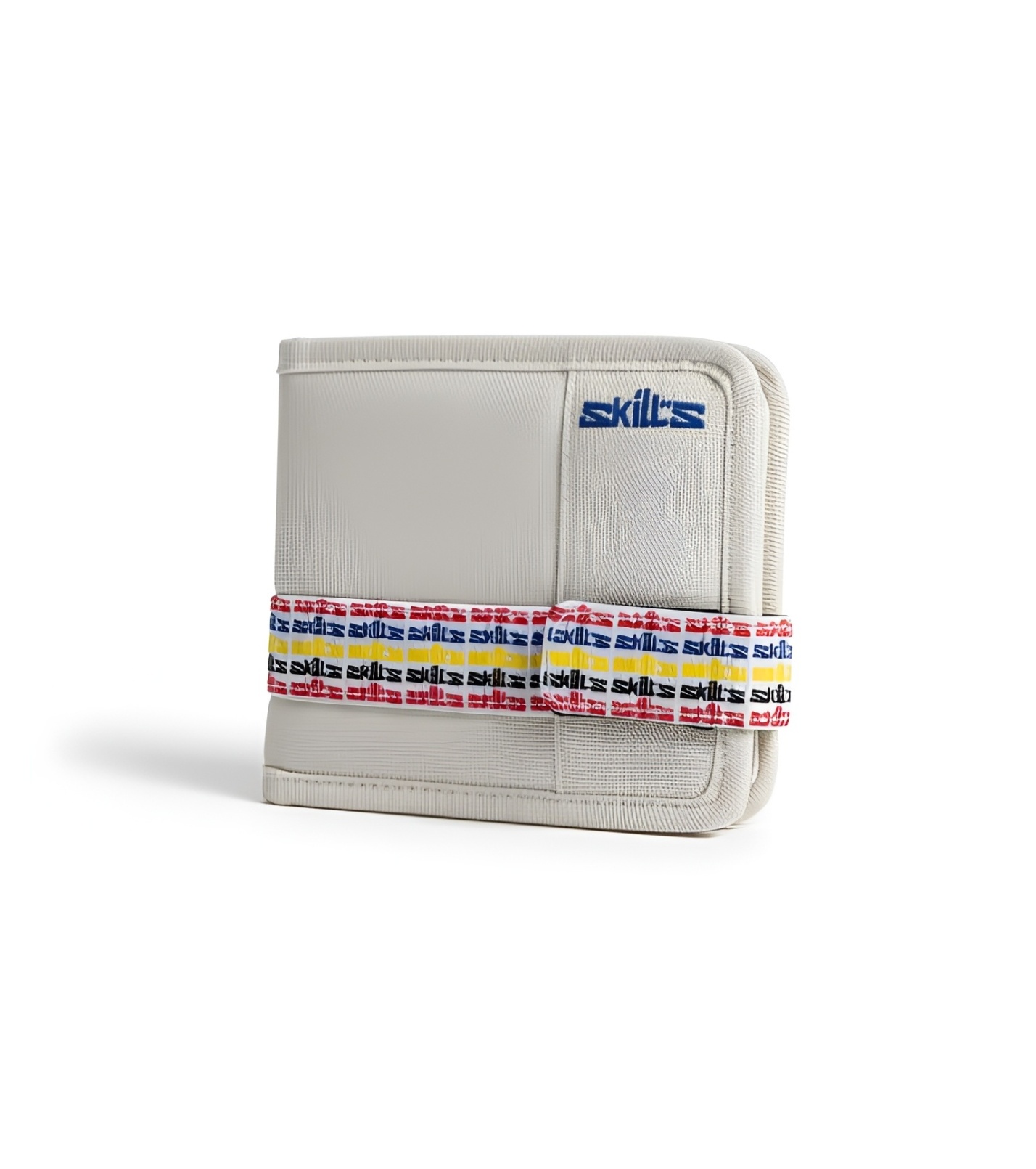 Minimalistyczny portfel z kolorowym napisem Skill's. Wewnątrz posiada 4 przegródki na karty, 1 na banknoty i 1 zapinaną na zatrzask kieszonkę na drobne.
