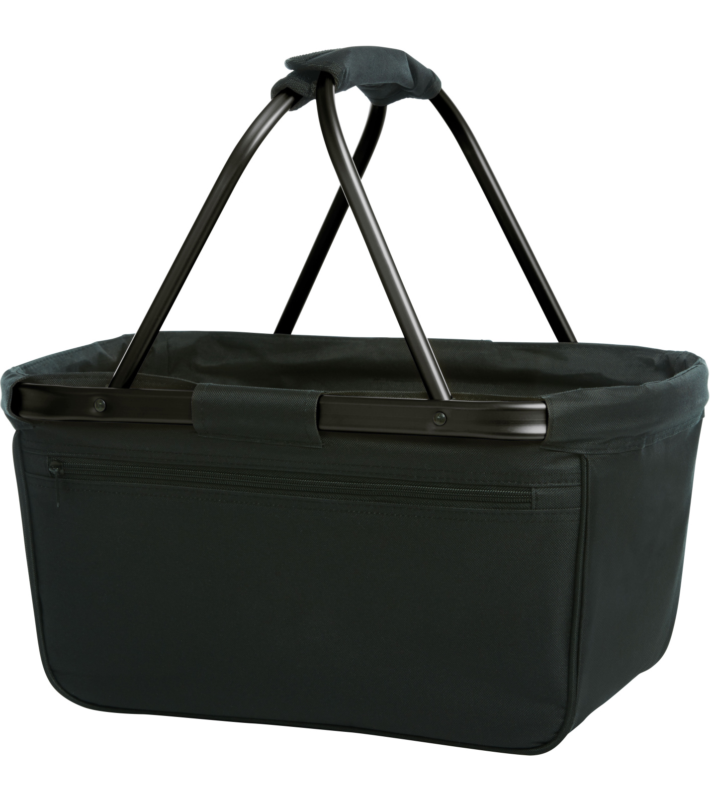 Ładnie zaprojektowany kosz na zakupy z aluminiową ramą i przednią kieszenią na zamek