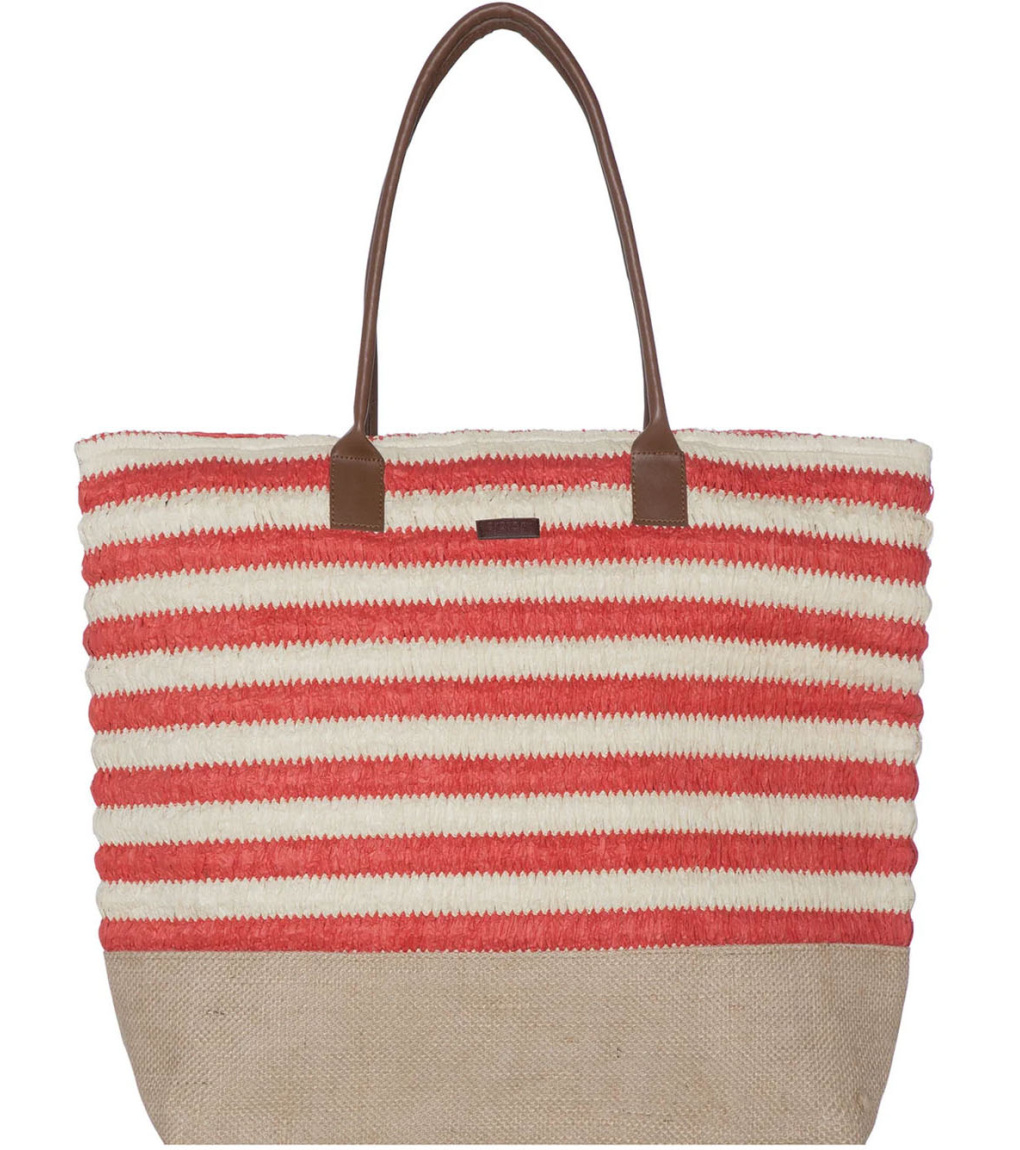 Ta wspaniała torebka wykonana jest z naturalnych materiałów. Pasiasta górna część wykonana jest w 100% ze słomy papierowej, a dolna z juty.