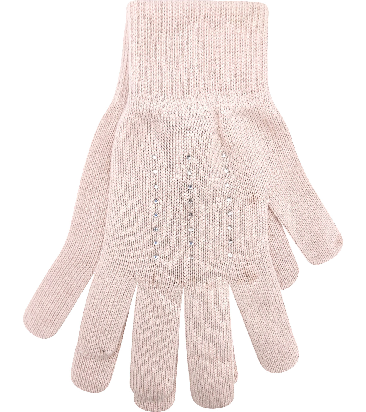Damskie rękawiczki wykonane z cienkiej dzianiny z domieszką bawełny, ozdobione kamieniami Swarovskiego.