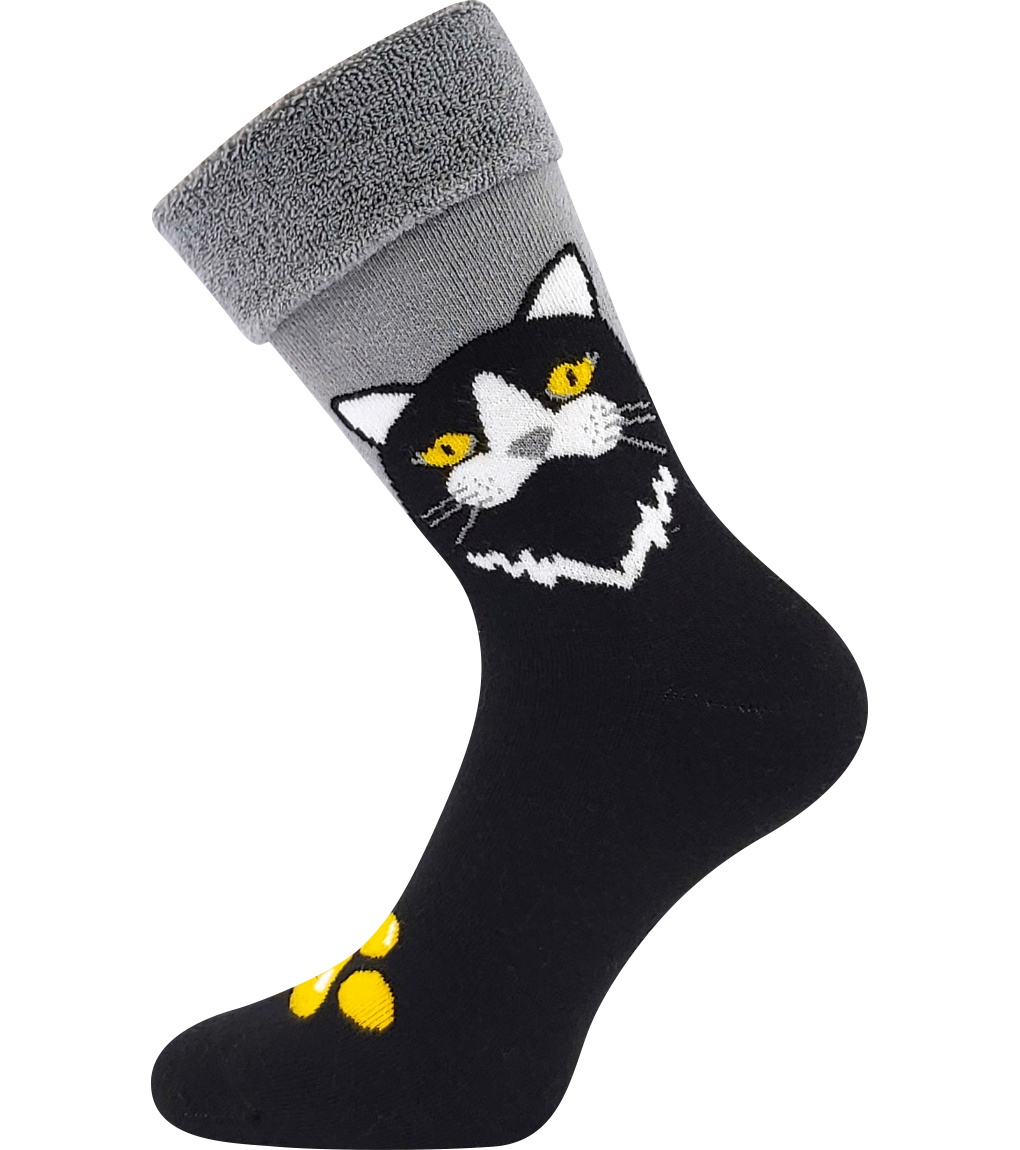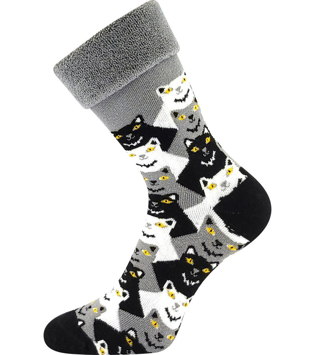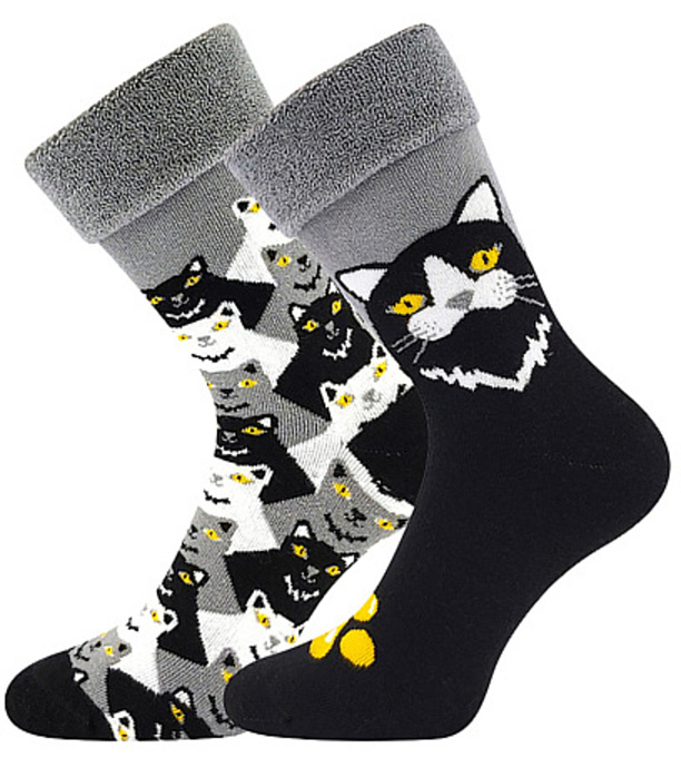 Damskie grube skarpetki Lonka® LÍZA z wizerunkiem kotów. Skarpetki charakteryzują się dużą zawartością bawełny i elastanu. Dzięki temu skarpetki są miękkie w dotyku, przyjemne w noszeniu, dobrze wchłaniają wilgoć, a jednocześnie dobrze trzymają się stopy. Ciepłe skarpetki wykonane są z delikatnej i miękkiej froty, dzięki czemu są bardzo wygodne, nadają się do noszenia na co dzień w chłodne dni. Obszar palców w skarpetkach jest szyty ściegiem łańcuszkowym, a połączenie nigdzie nie uciska. Parowanie 1+1, w którym każda skarpetka jest inna, a razem tworzą parę idealną. Jeżeli chcesz mieć dwie identyczne skarpetki, zamów dwie pary.