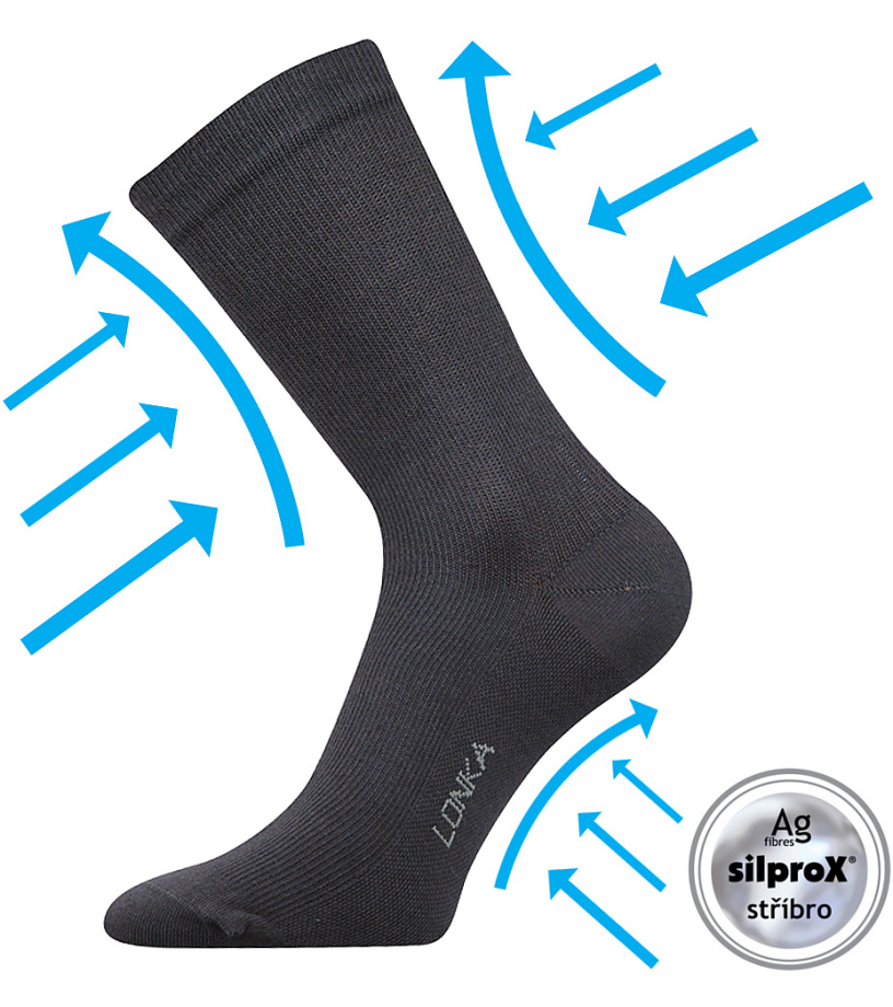 materiały: bawełna - przyjemne w dotyku i wysokiej zdolności wchłaniania wilgoci naturalne włókno, silproX® - specjalnie utkane włókno polipropylenowe z jonami srebra, zapobiega powstawaniu nieprzyjemnych zapachów i pleśni