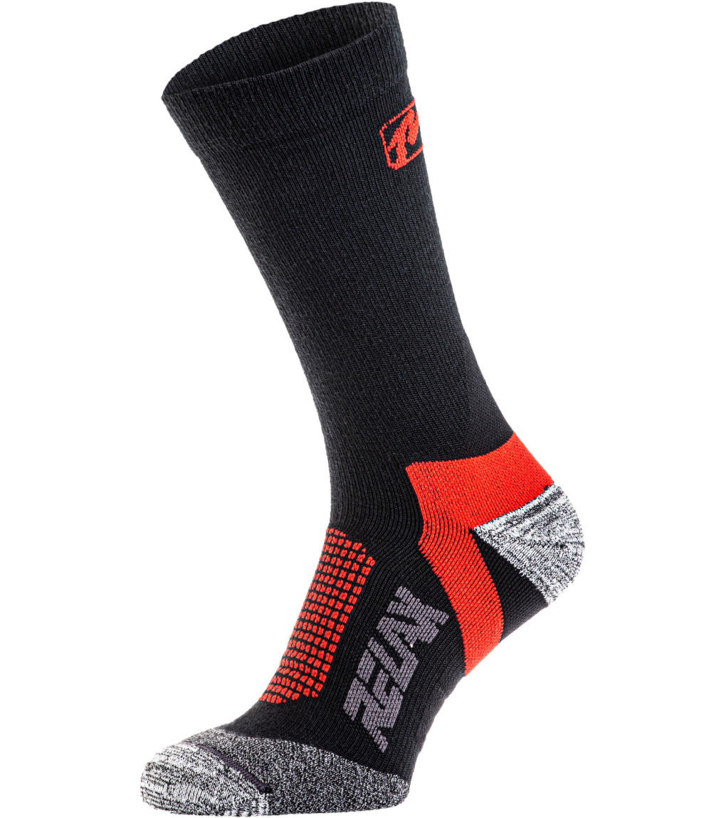 Superwydajna skarpeta biegowa NORDIC z połączeniem wełny MERINO i funkcjonalnych materiałów gwarantuje ciepło w niskich temperaturach, ale także doskonałą termoregulację dzięki zastosowaniu technologii MICROCLIMATIC. Skarpeta jest anatomicznie wyprofilowana na prawą i lewą stopę, co pozwala na precyzyjne umiejscowienie odsłoniętych stref. Ochronę w obszarze podbicia zapewnia technologia wzmocnienia punktowego KICKER, która rozkłada nadmierny nacisk i tym samym chroni kość śródstopia w przypadku uderzenia. Elastyczna owijka w okolicy kostki chroni ją pewnie, a tym samym wspomaga naturalny ruch stopy w bucie.