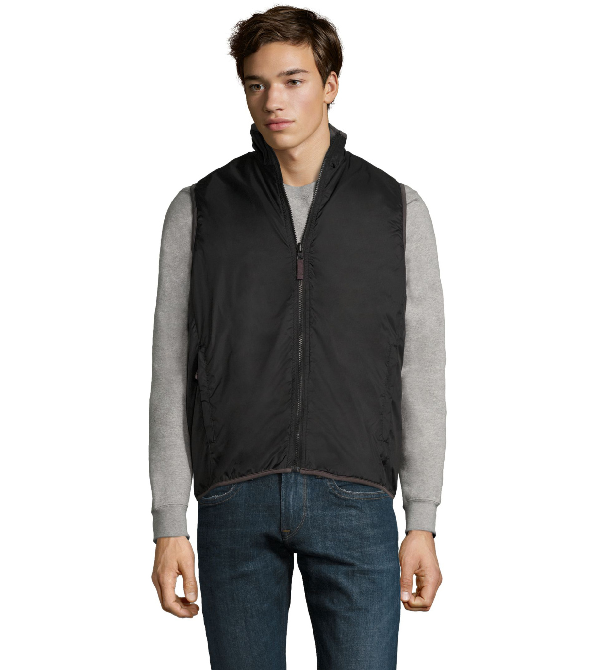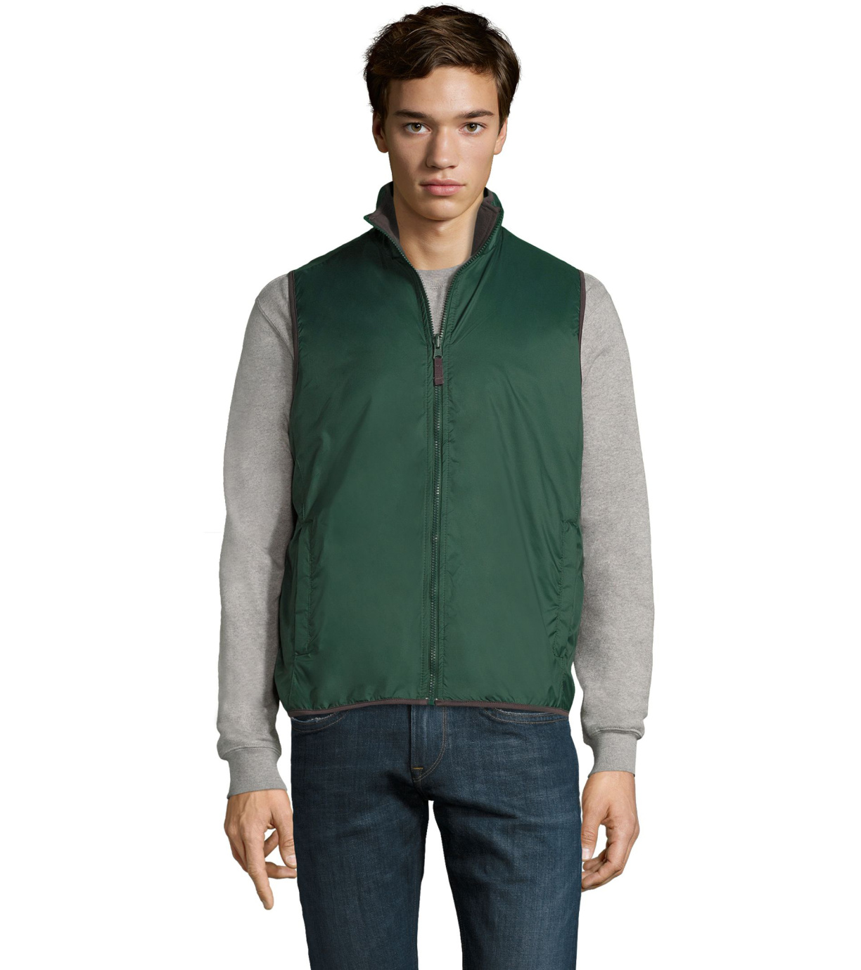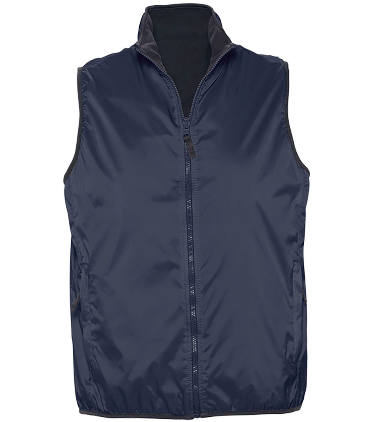 Dwustronna kamizelka z polarową podszewką. Zamek błyskawiczny jest dopasowany do koloru kamizelki. Wysoki kołnierz. Kamizelka ma dwie kieszenie.