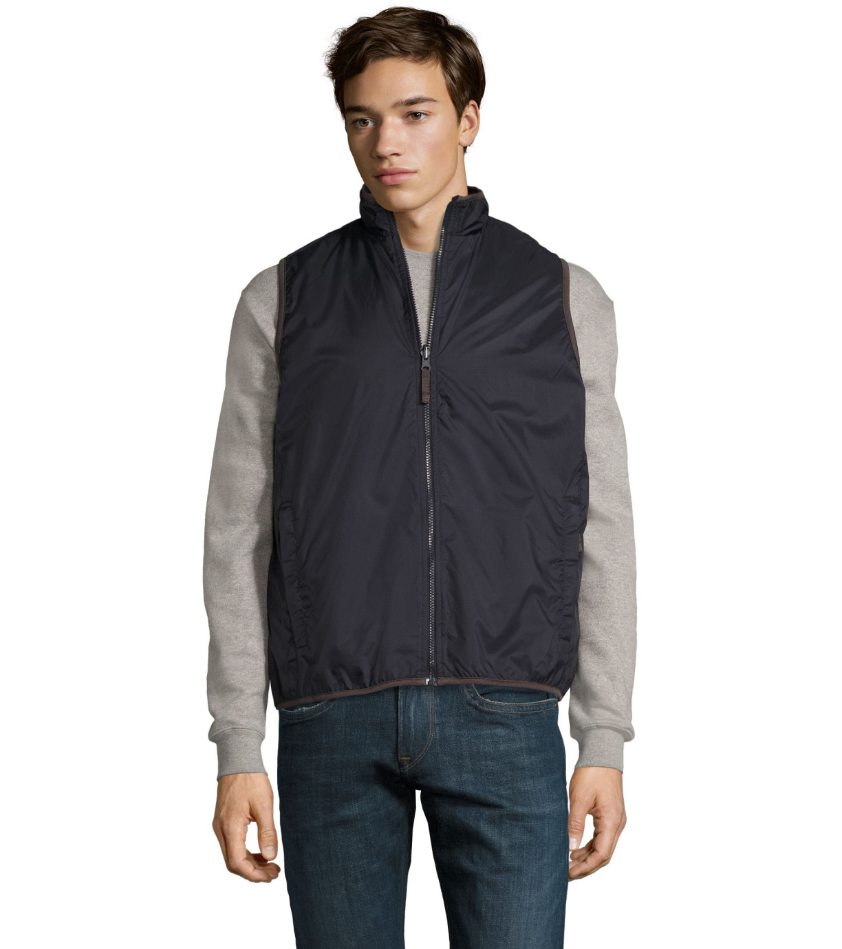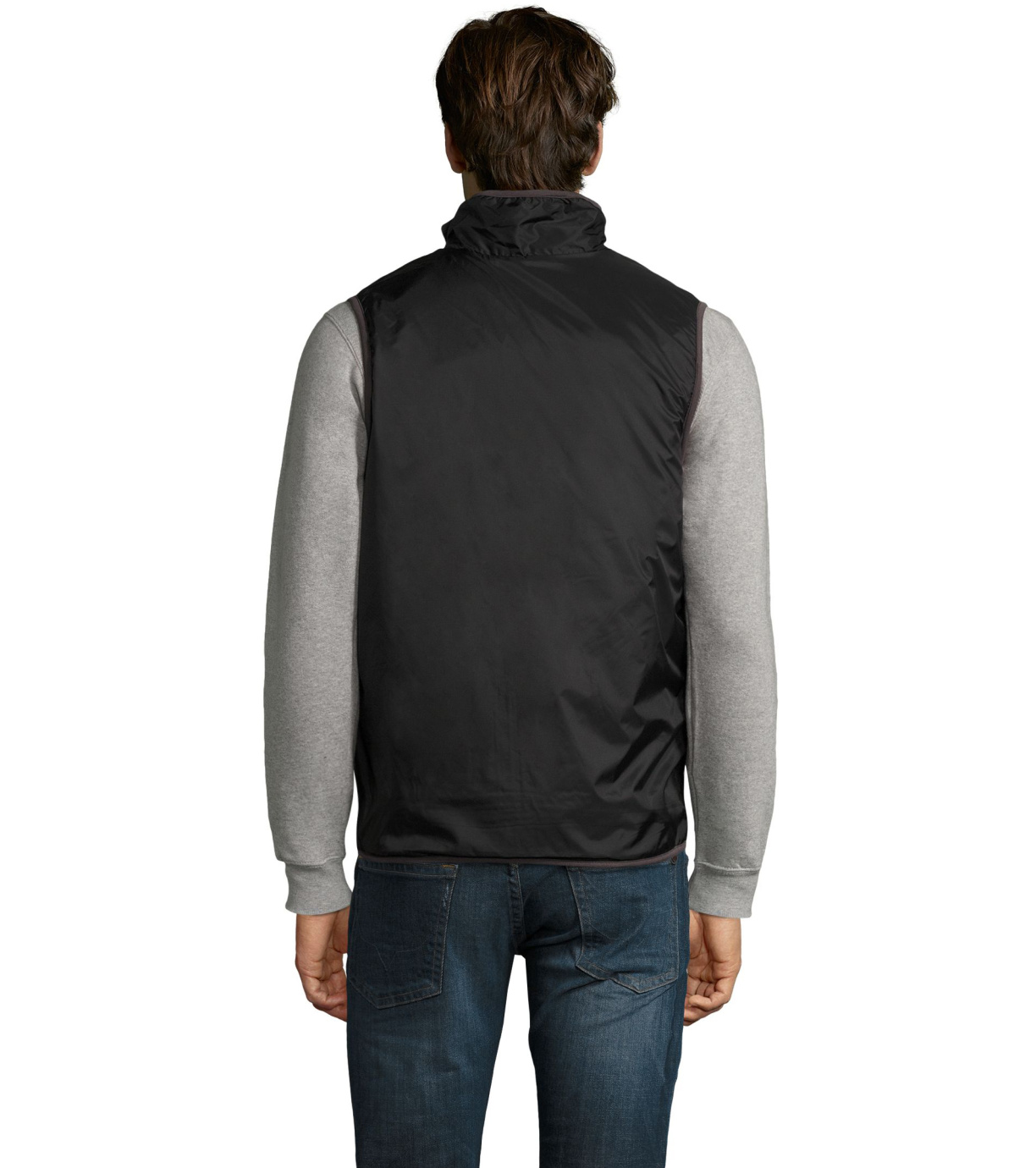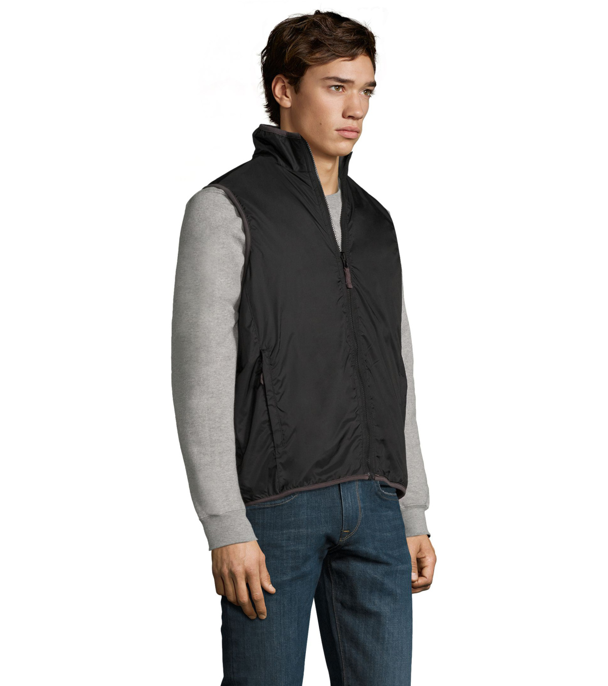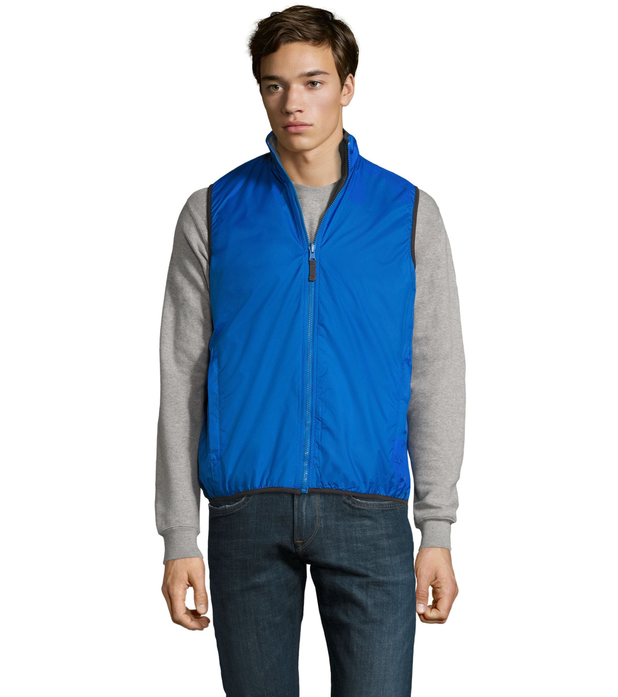 Dwustronna kamizelka z polarową podszewką. Zamek błyskawiczny jest dopasowany do koloru kamizelki. Wysoki kołnierz. Kamizelka ma dwie kieszenie.