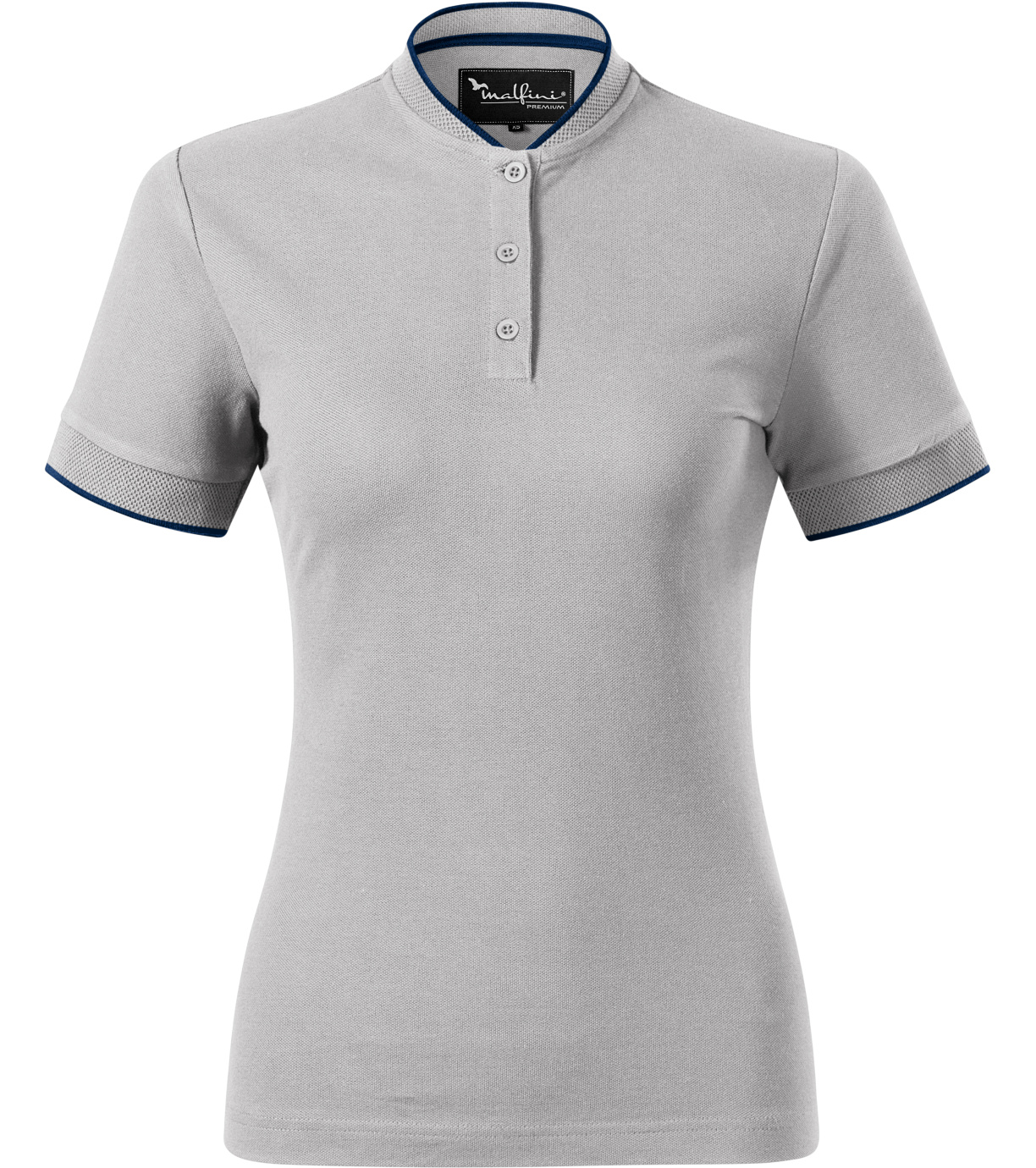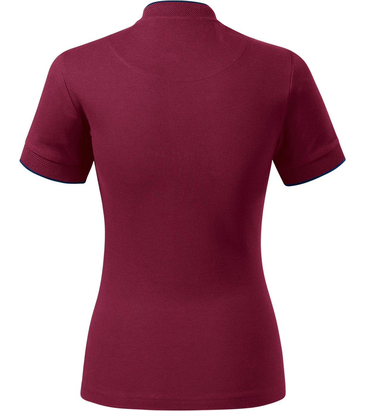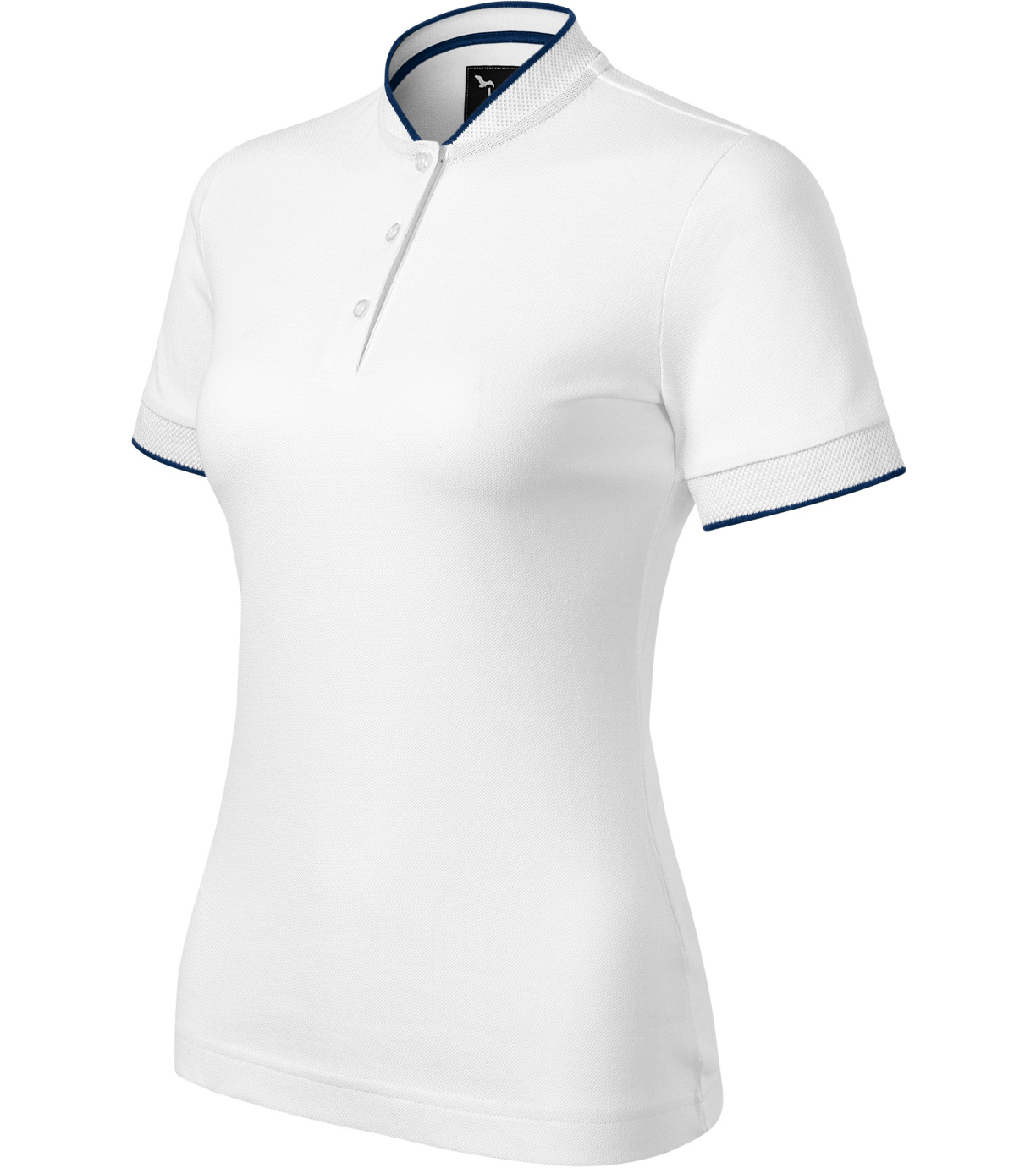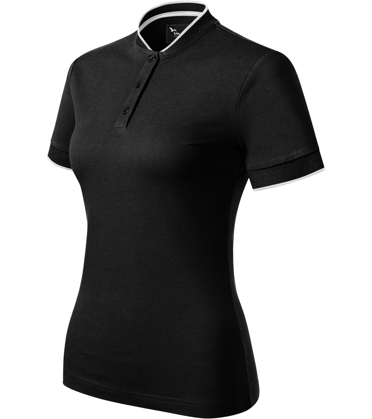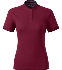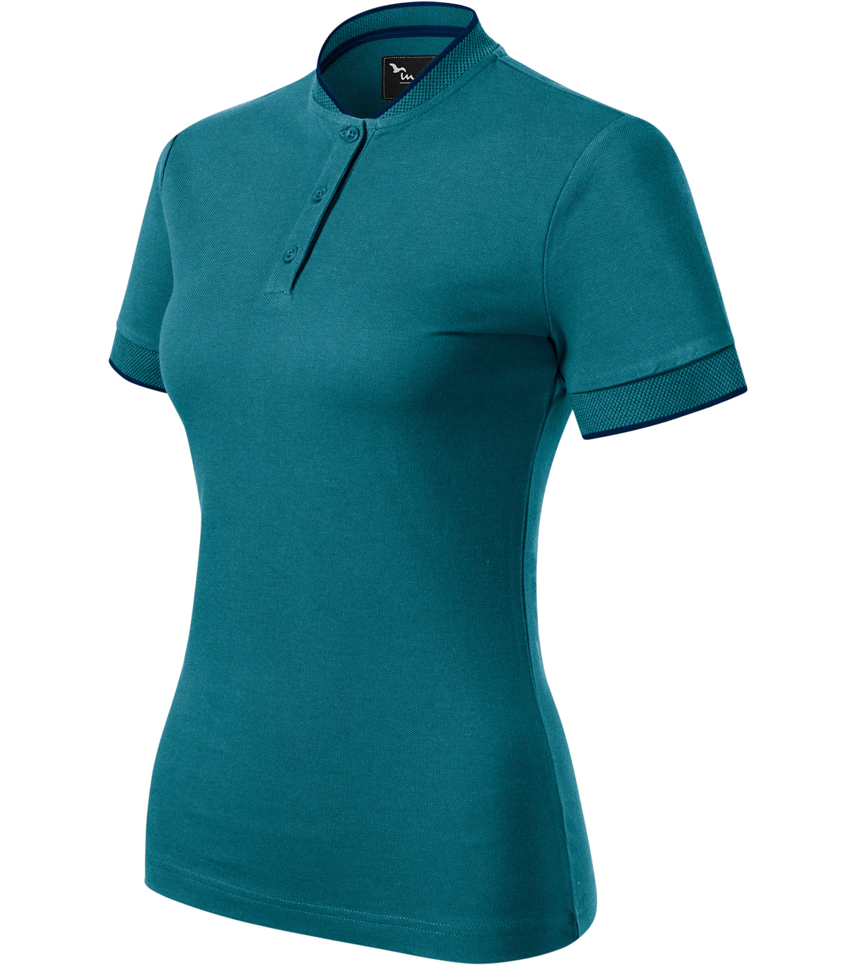 Koszulka polo damska, lekko dopasowany krój ze szwami bocznymi, kołnierzyk typu "bomber", kołnierzyk i wykończenie rękawów kontrastowym żakardowym paskiem, plisa z 3 guzikami w kolorze materiału, wewnętrzna linia dekoltu wykończona kontrastową taśmą, szwy na ramionach wzmocnione taśmą.