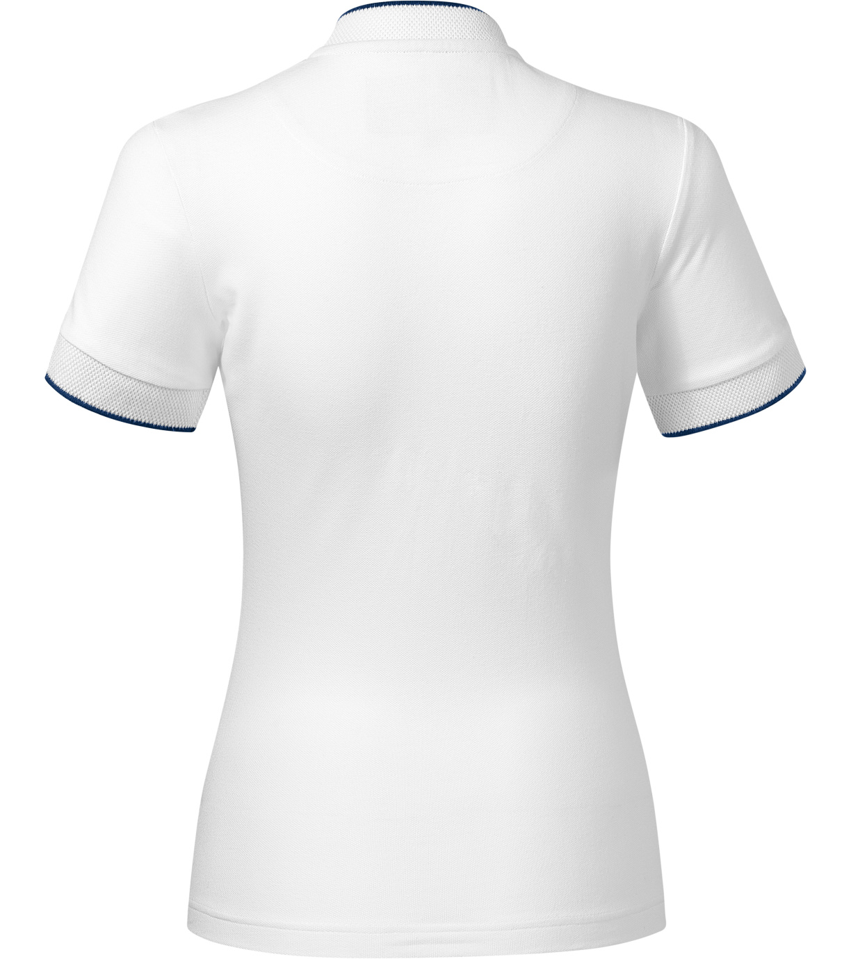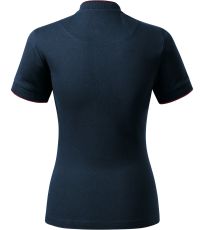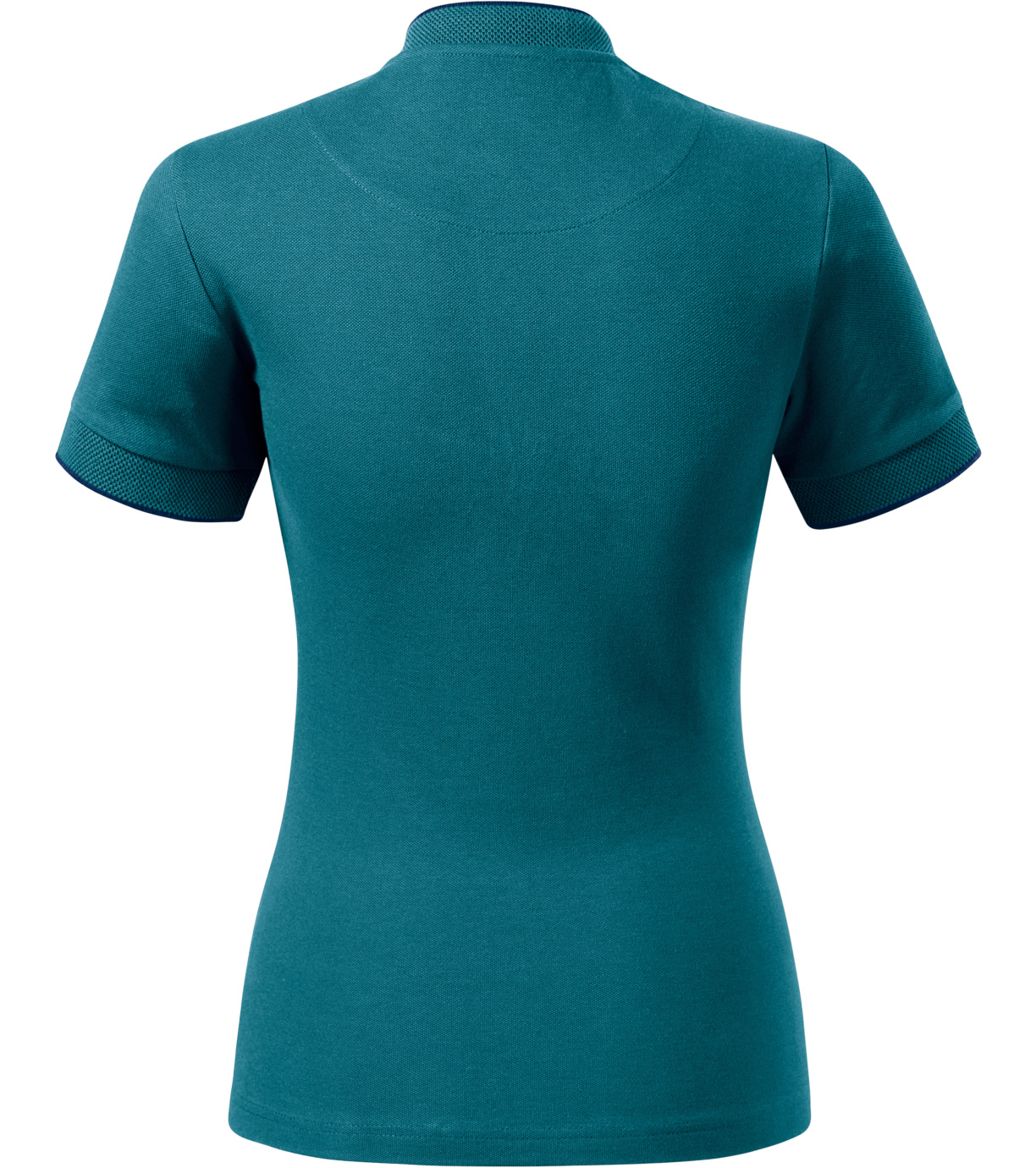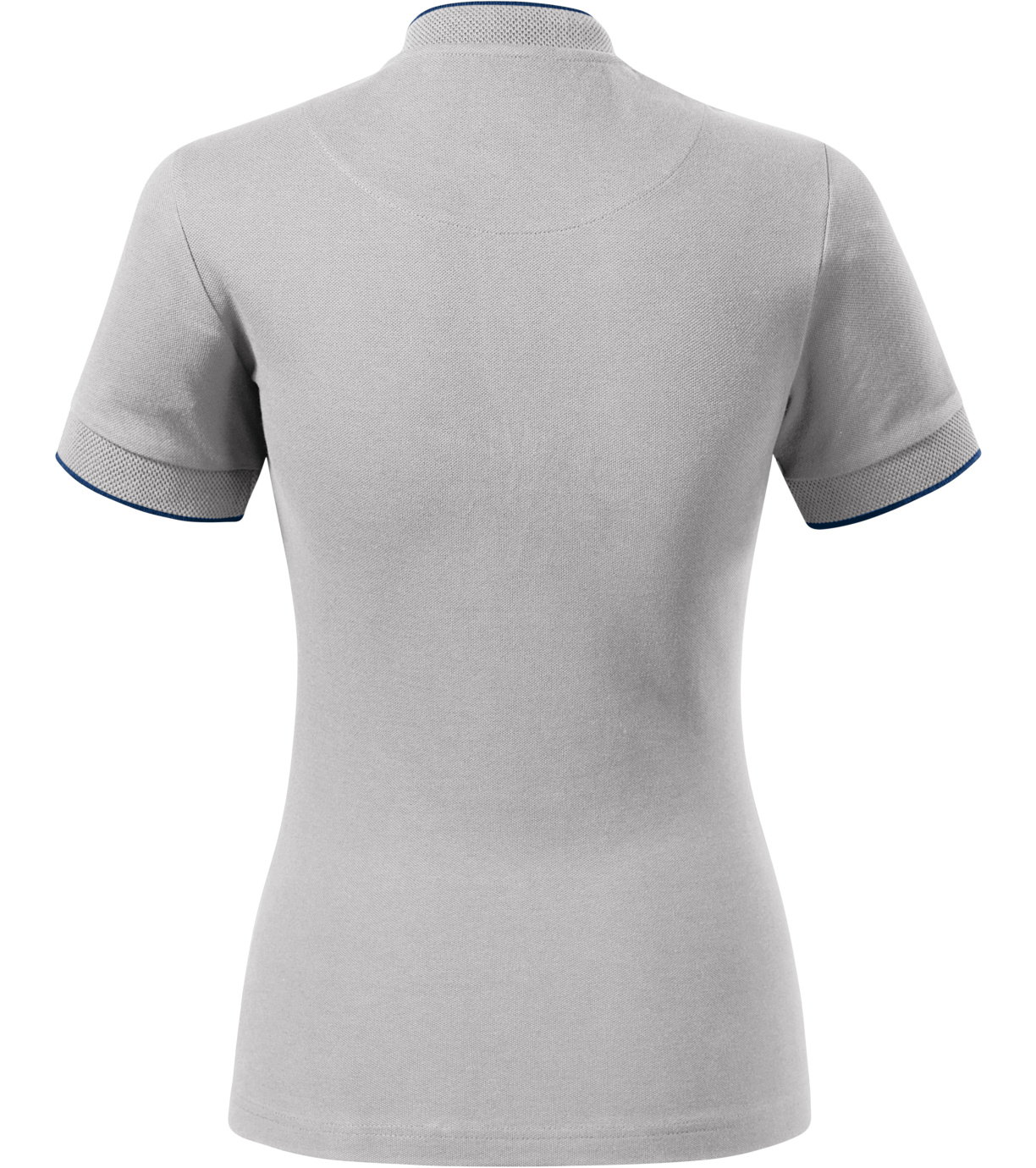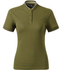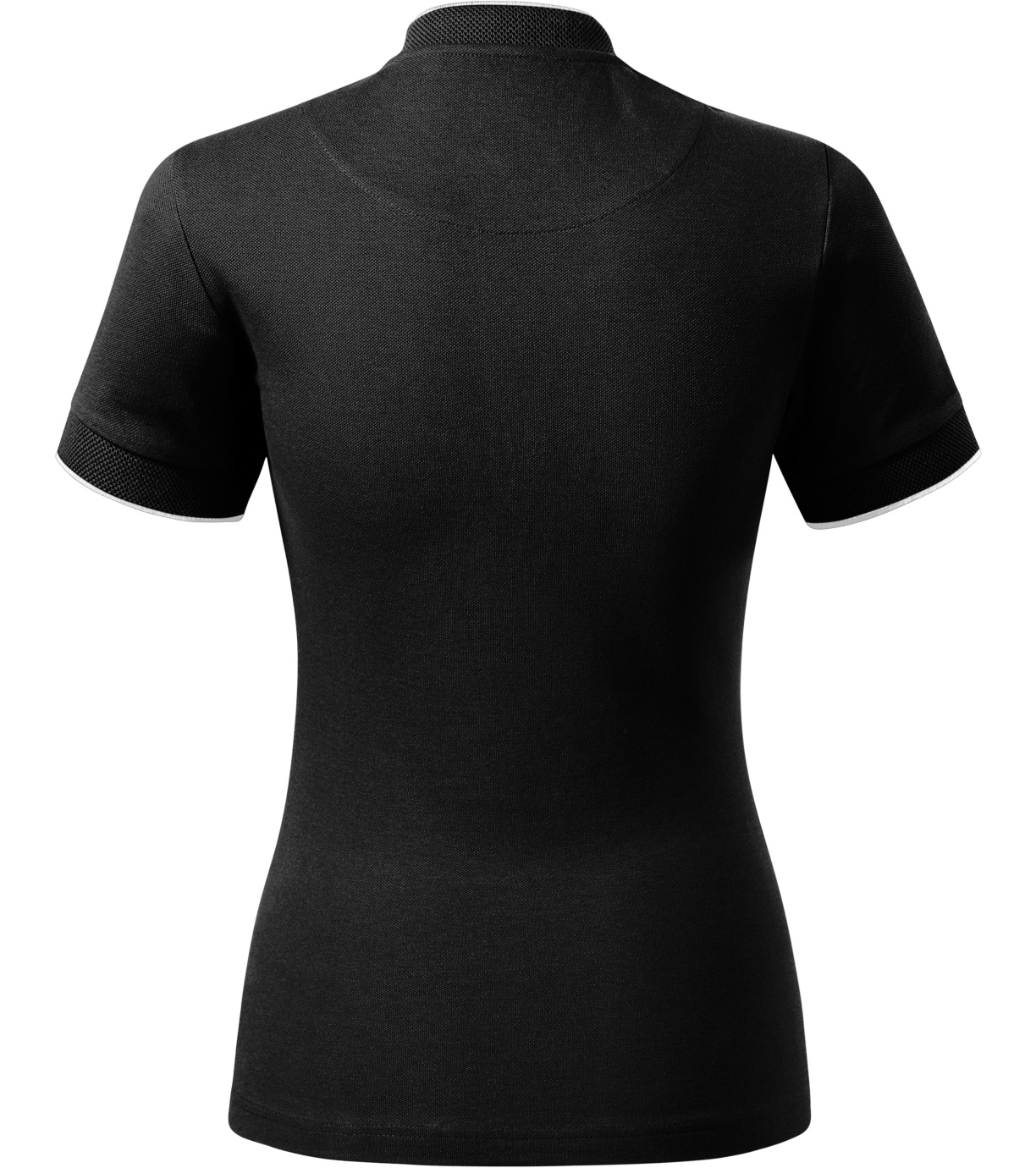 Koszulka polo damska, lekko dopasowany krój ze szwami bocznymi, kołnierzyk typu "bomber", kołnierzyk i wykończenie rękawów kontrastowym żakardowym paskiem, plisa z 3 guzikami w kolorze materiału, wewnętrzna linia dekoltu wykończona kontrastową taśmą, szwy na ramionach wzmocnione taśmą.
