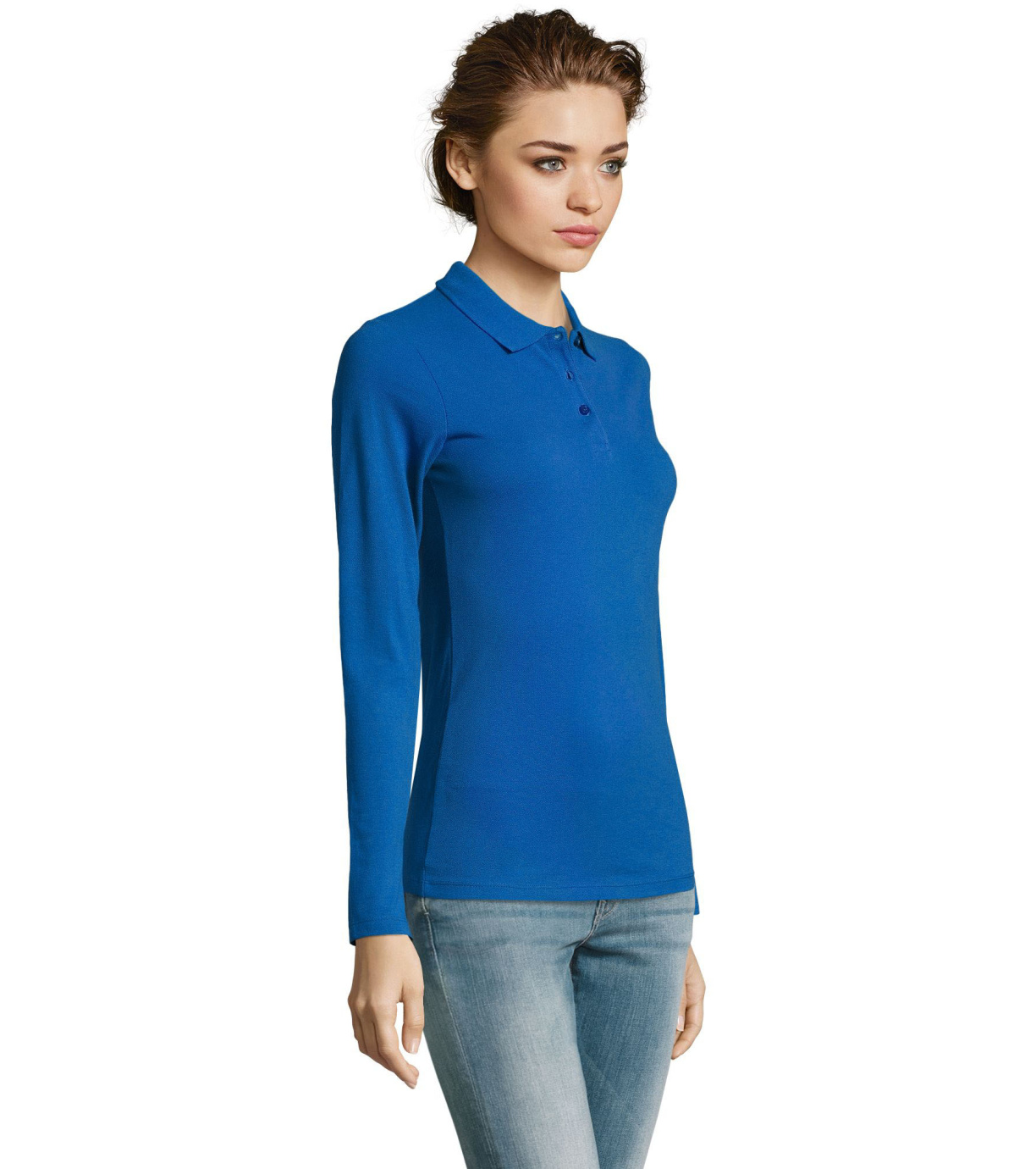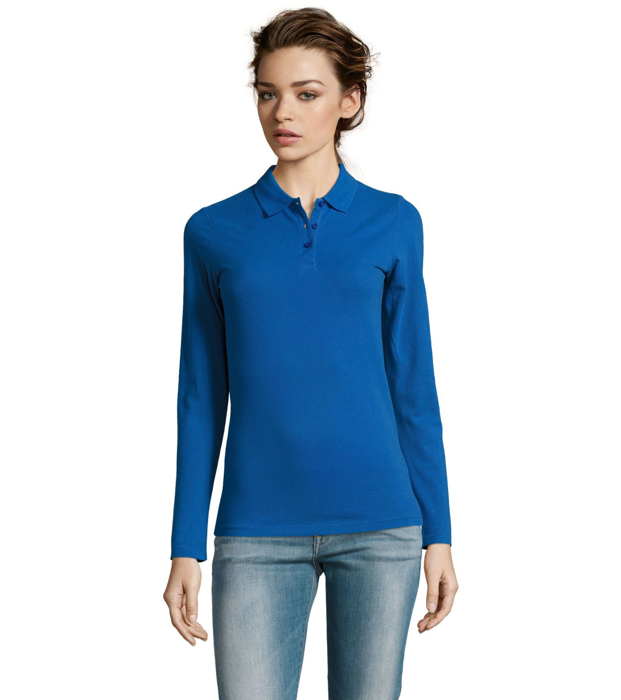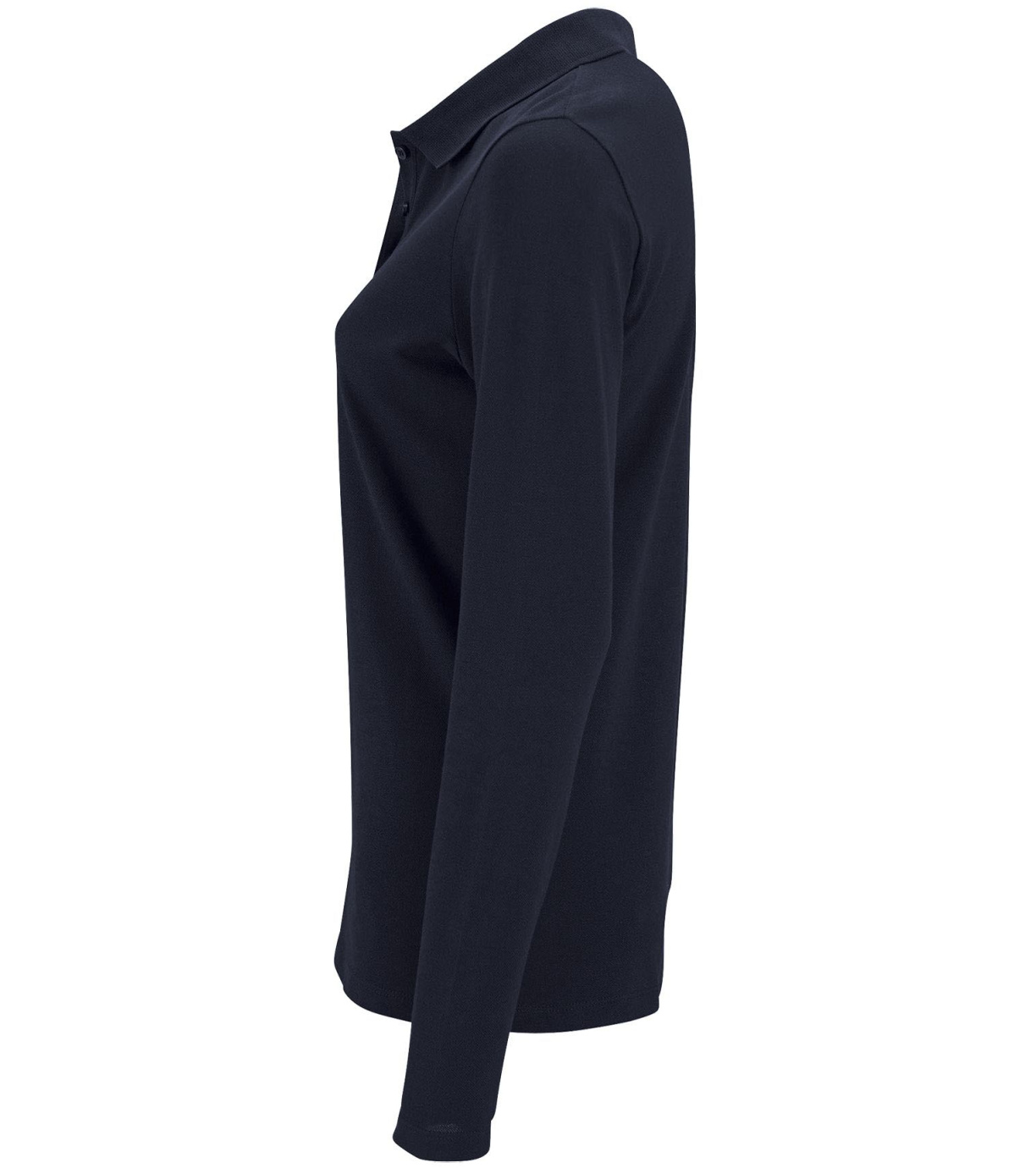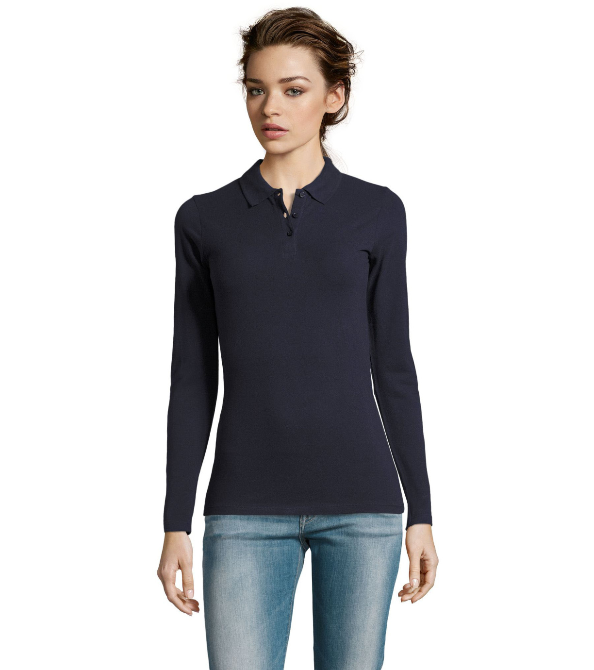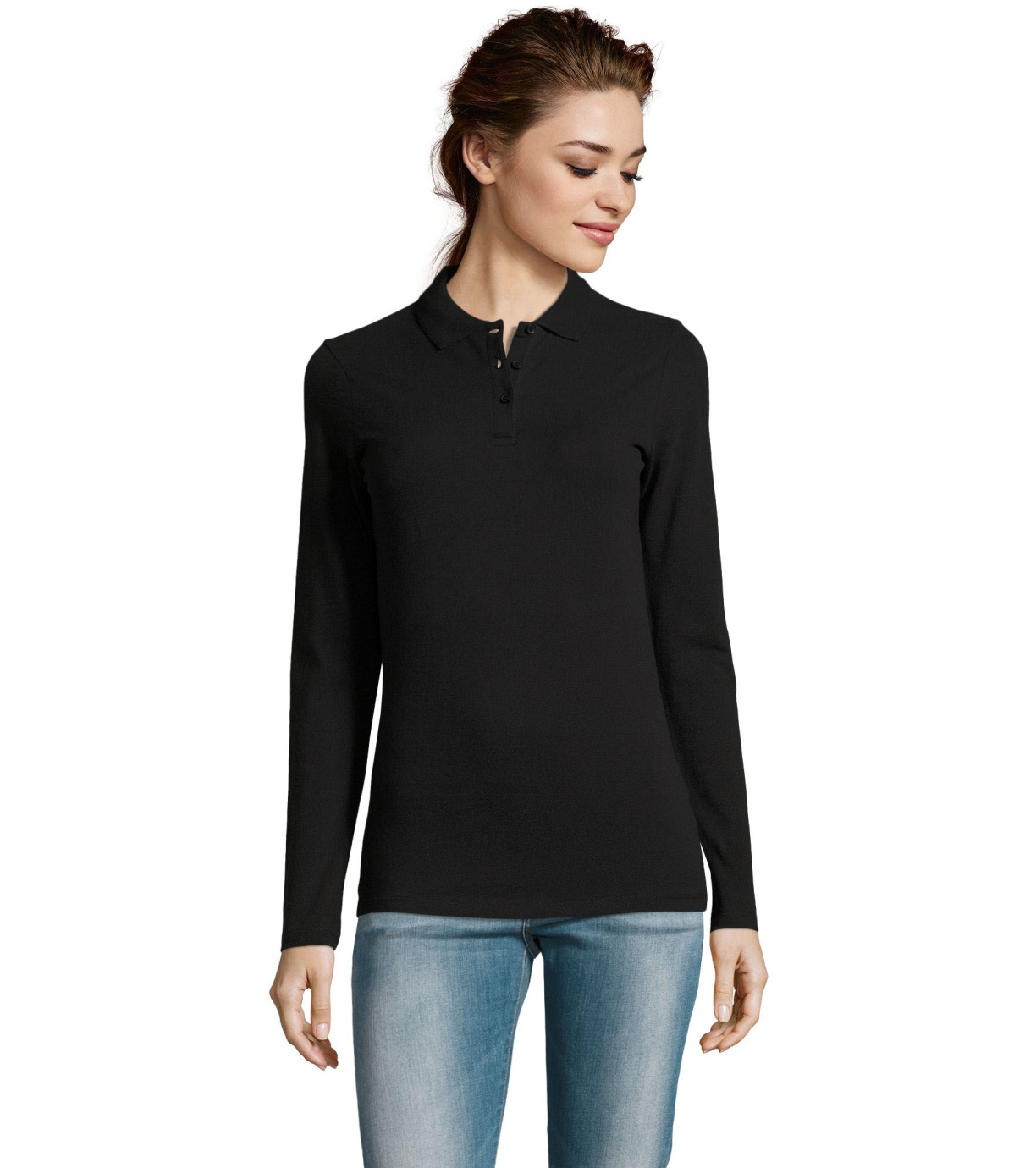 Damska koszulka polo z długim rękawem, kołnierzykiem i zapięciem na 3 guziki. Koszula ma dopasowany krój. Kołnierzyk wykończony ściągaczem 1x1.