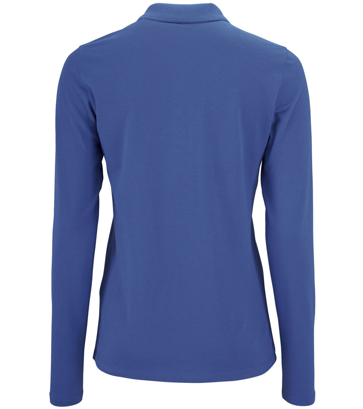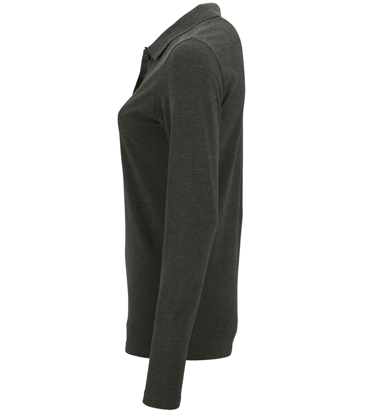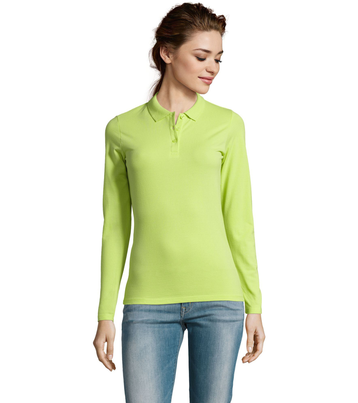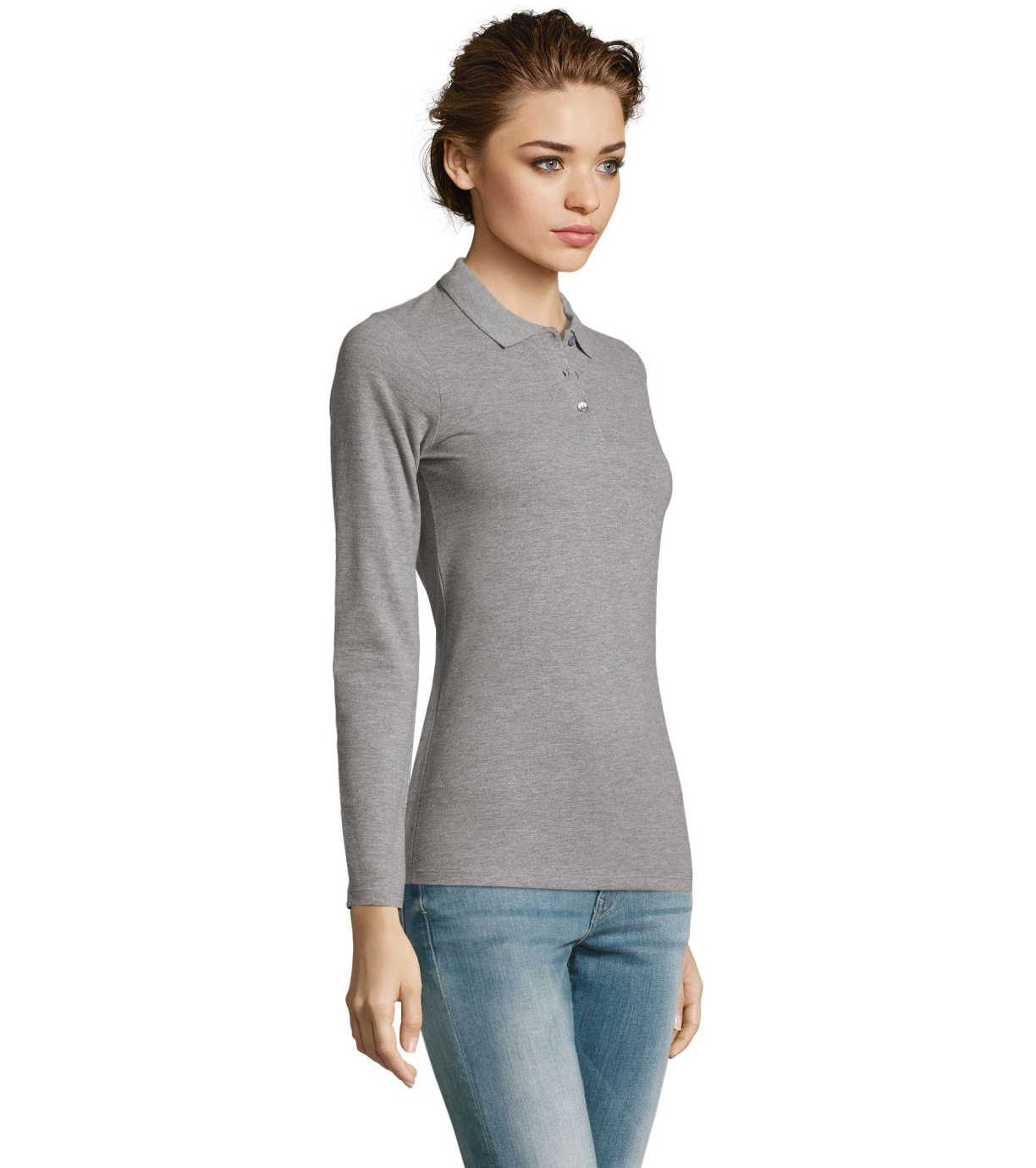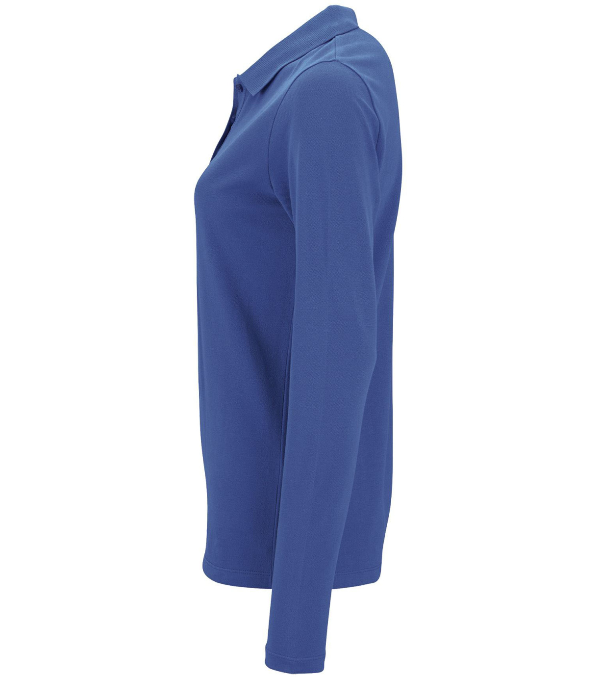 Damska koszulka polo z długim rękawem, kołnierzykiem i zapięciem na 3 guziki. Koszula ma dopasowany krój. Kołnierzyk wykończony ściągaczem 1x1.