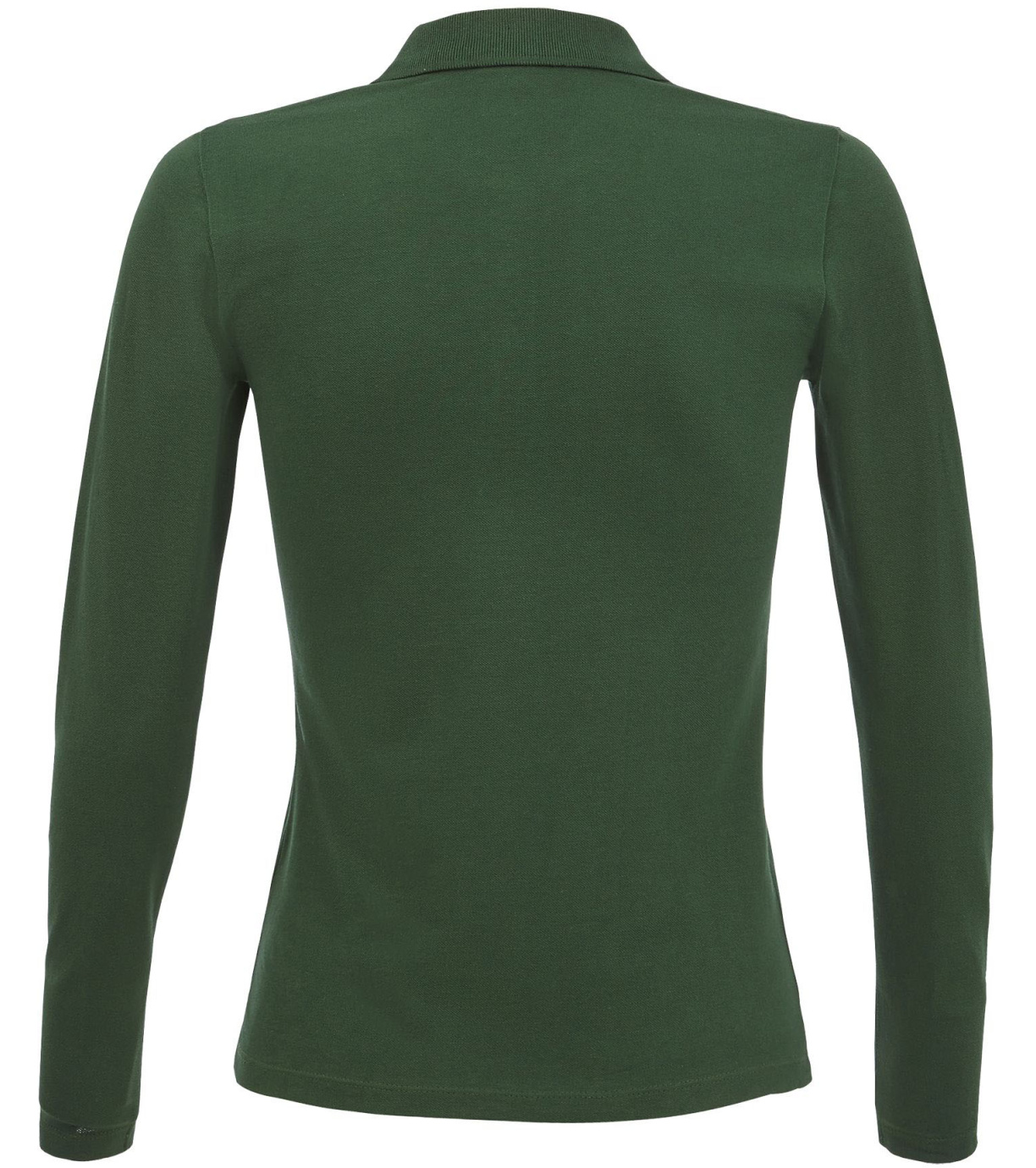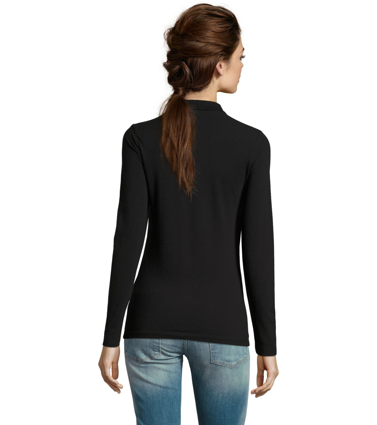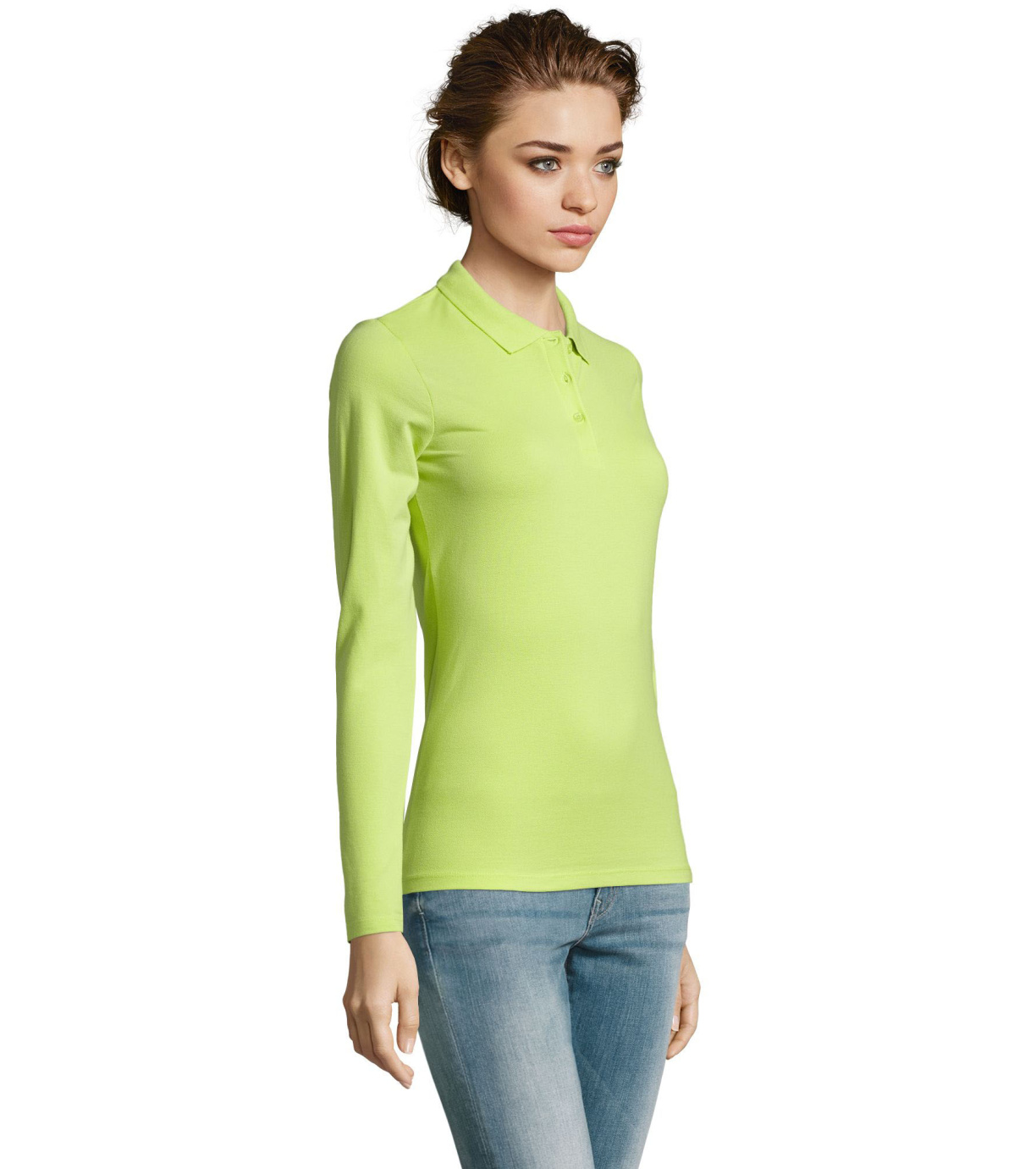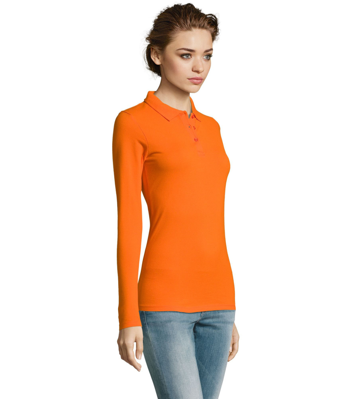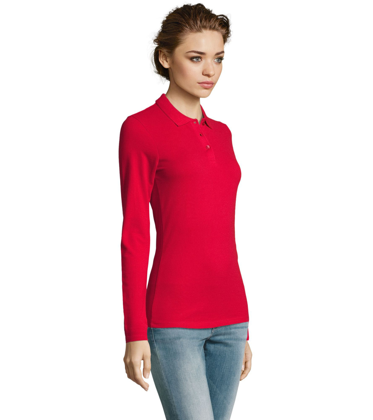 Damska koszulka polo z długim rękawem, kołnierzykiem i zapięciem na 3 guziki. Koszula ma dopasowany krój. Kołnierzyk wykończony ściągaczem 1x1.