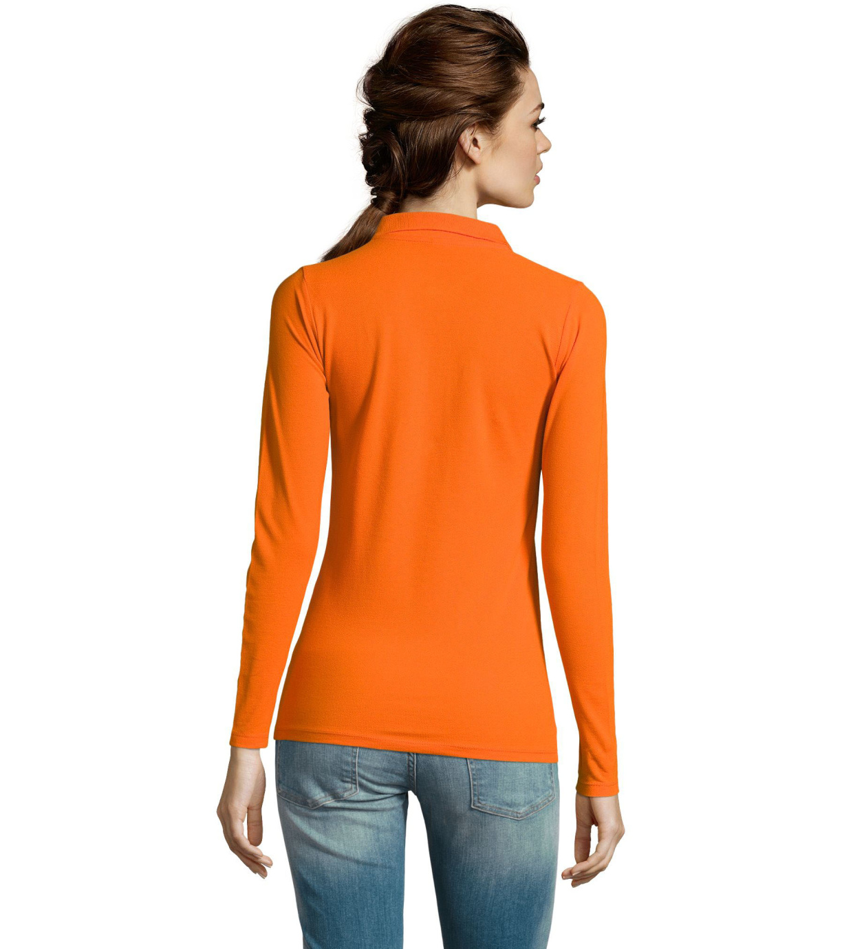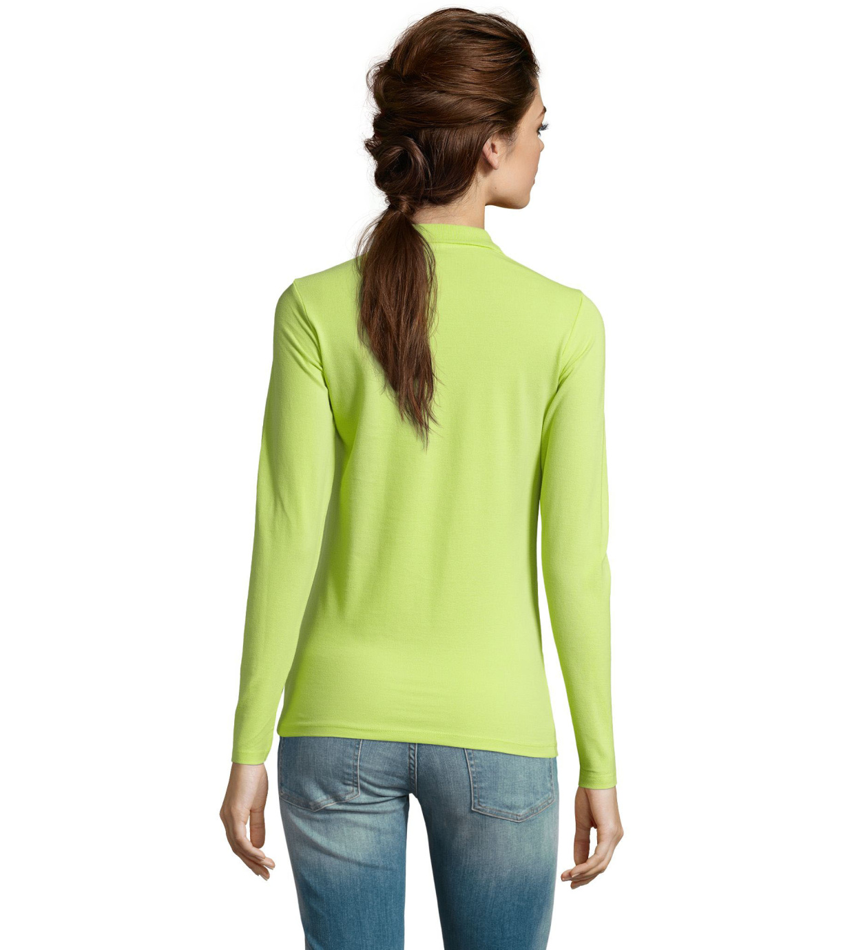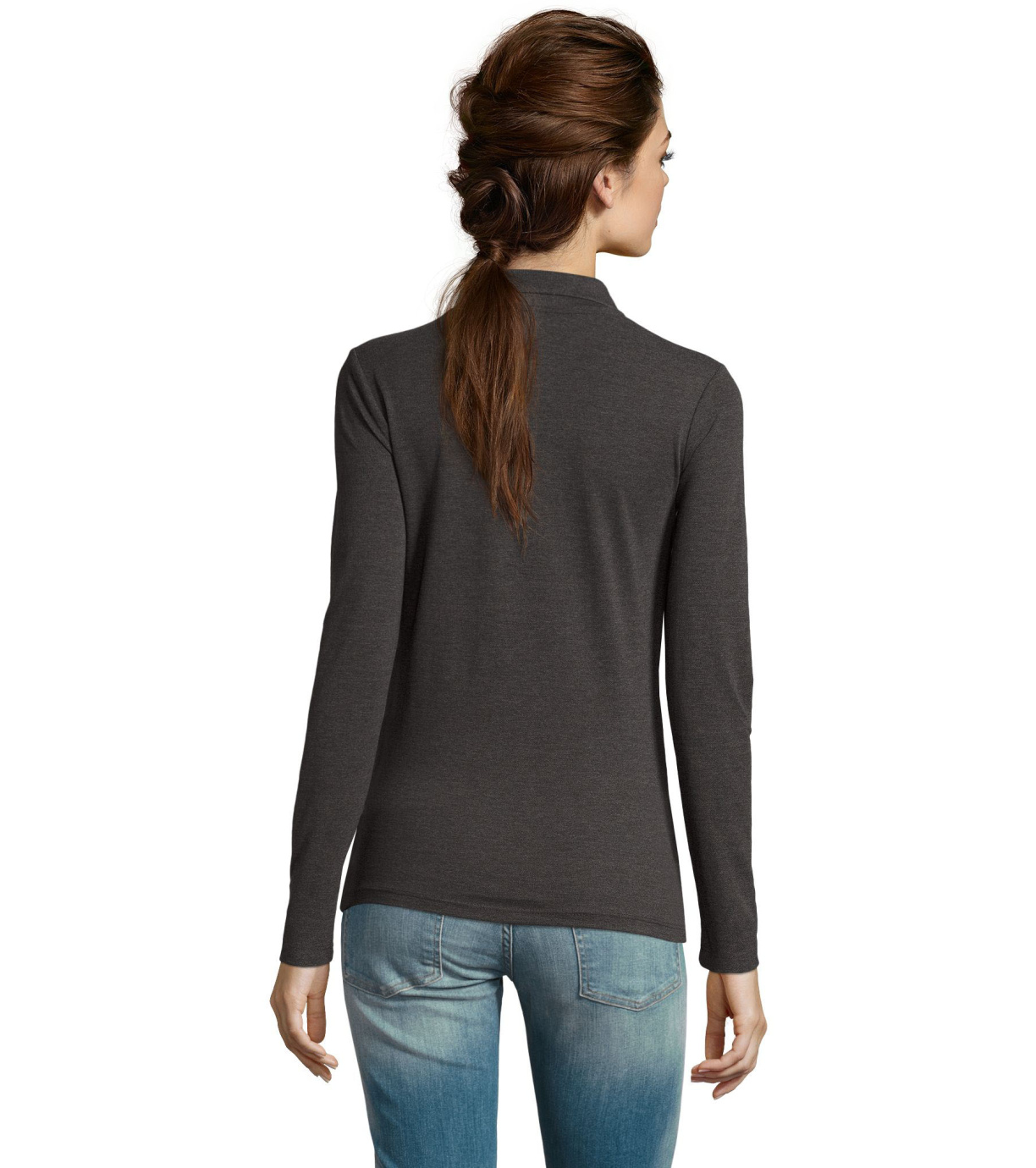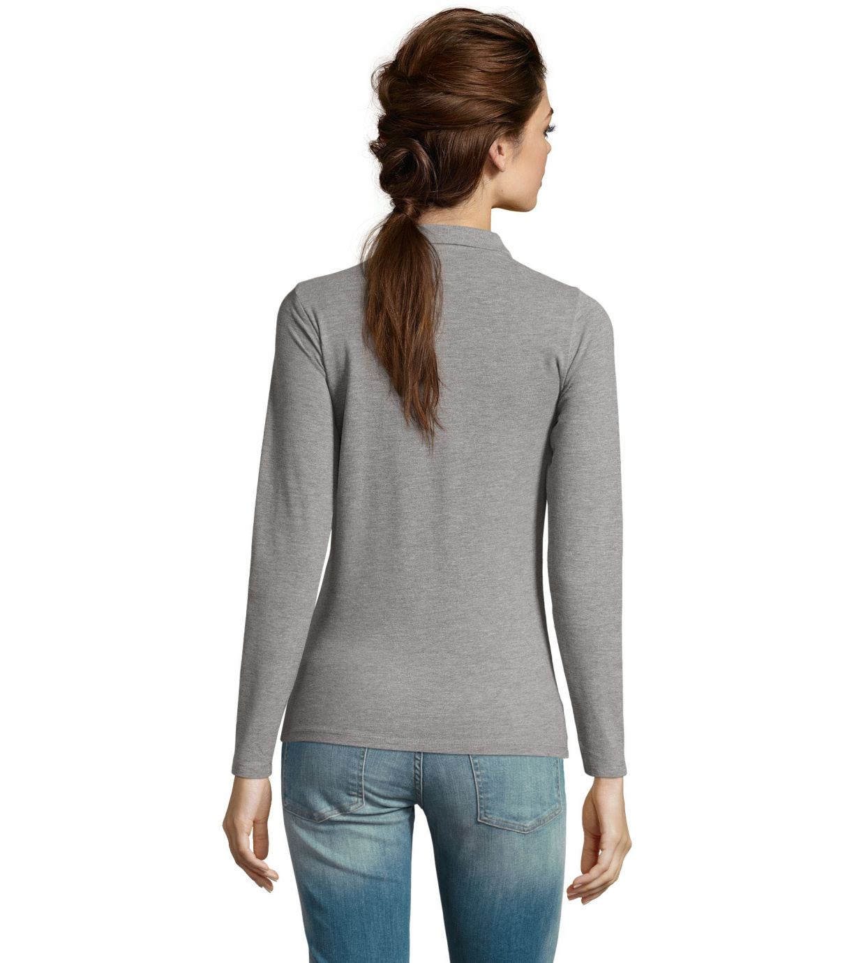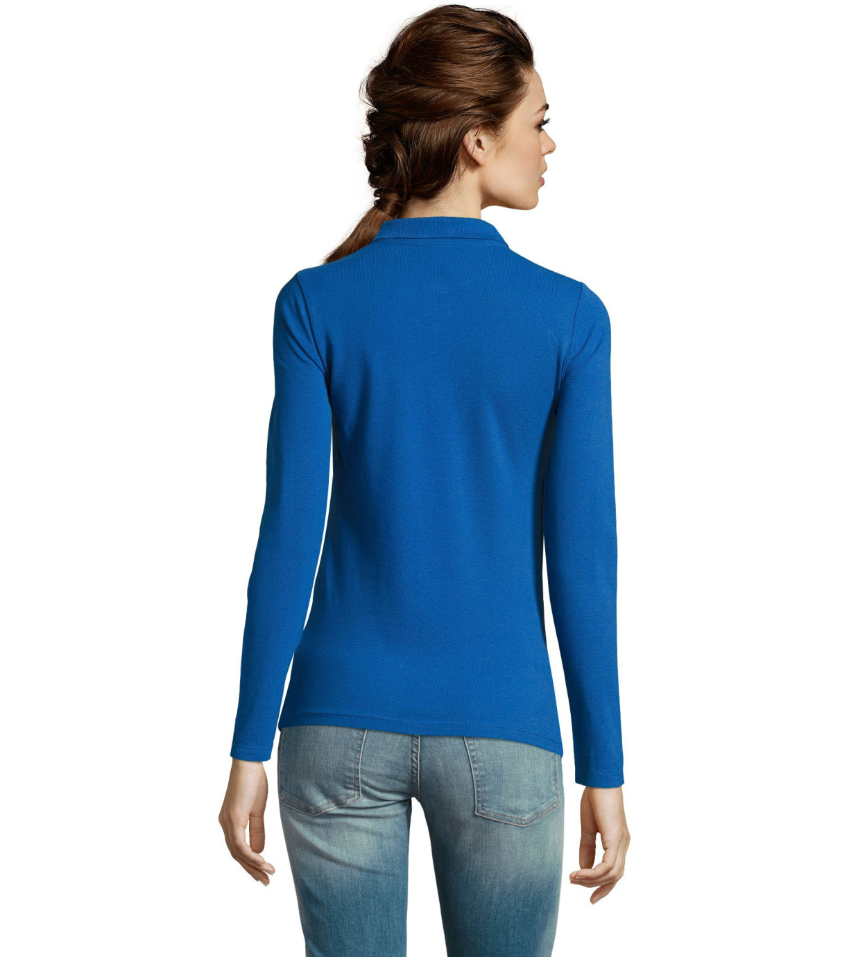 Damska koszulka polo z długim rękawem, kołnierzykiem i zapięciem na 3 guziki. Koszula ma dopasowany krój. Kołnierzyk wykończony ściągaczem 1x1.
