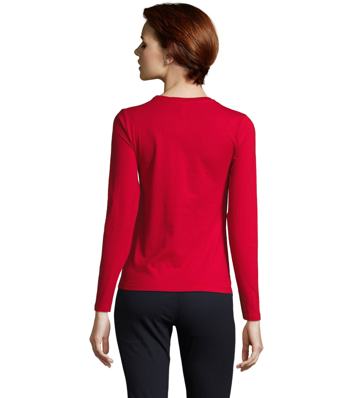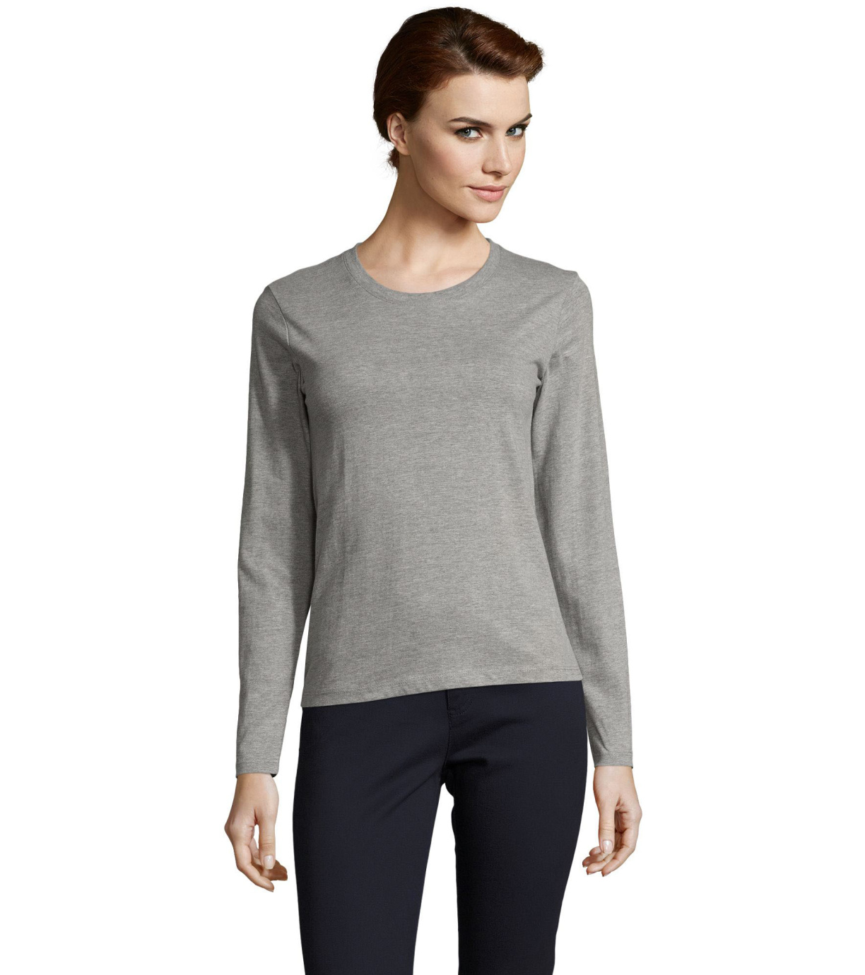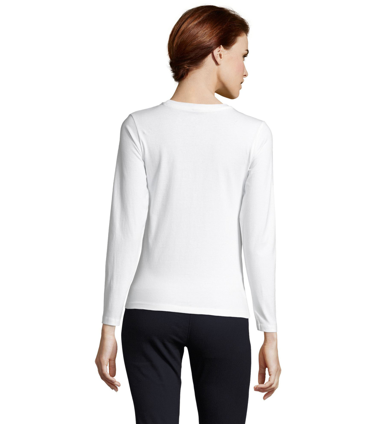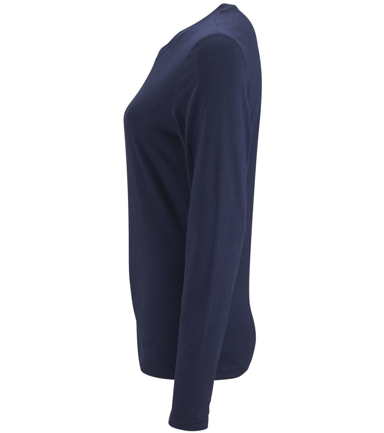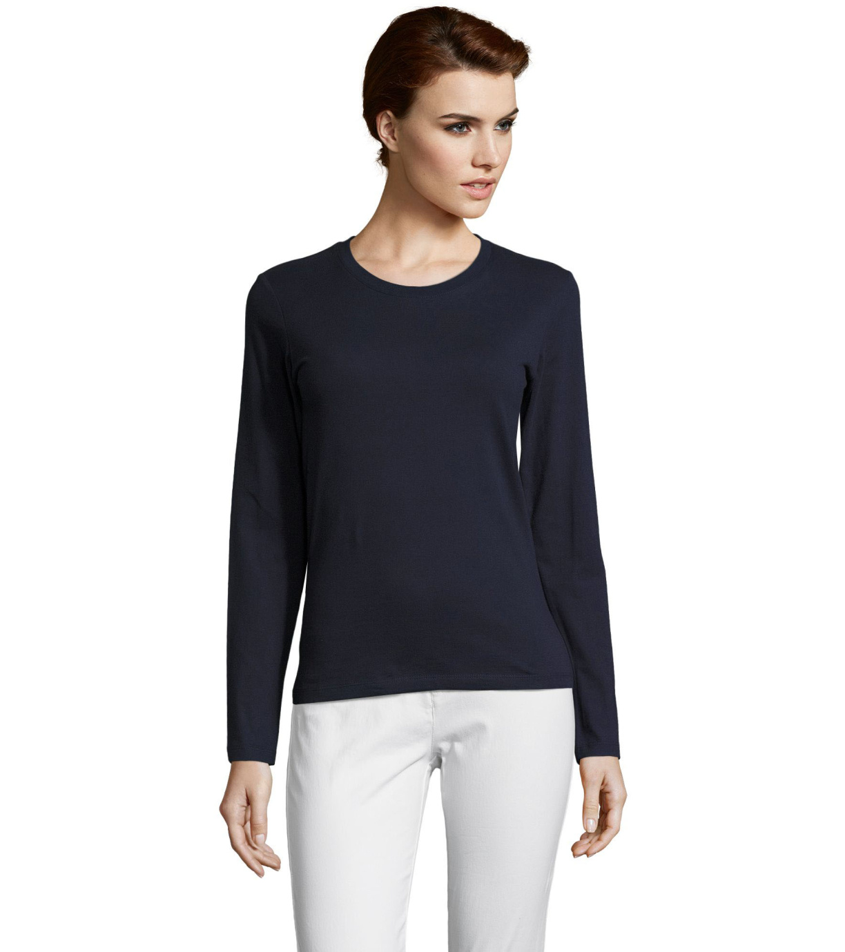 Koszulka damska z długim rękawem. Kołnierzyk wykończony prążkowanym elastycznym wykończeniem.
