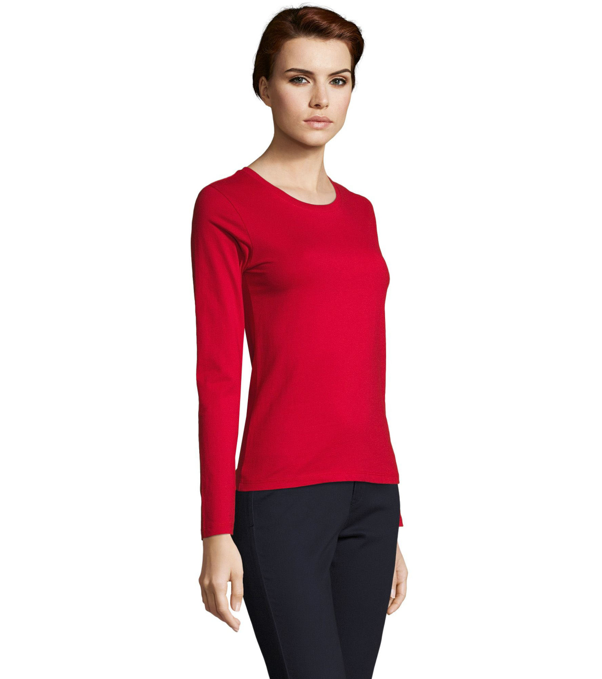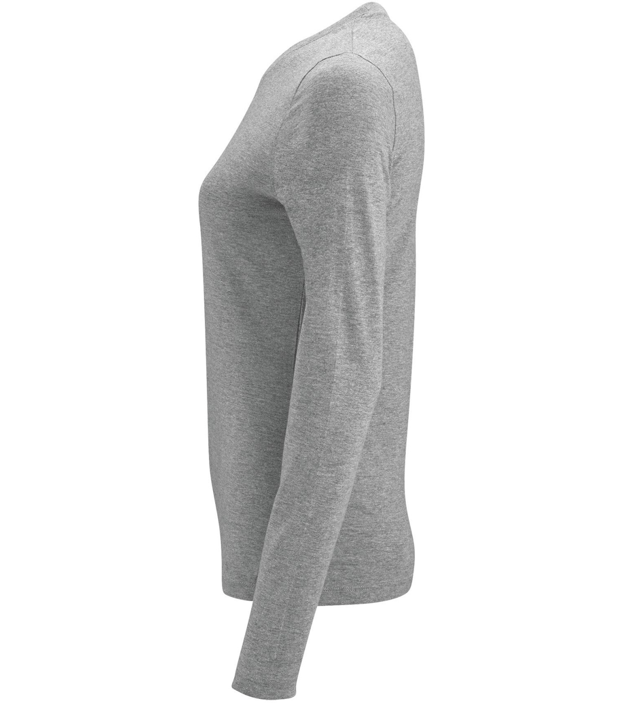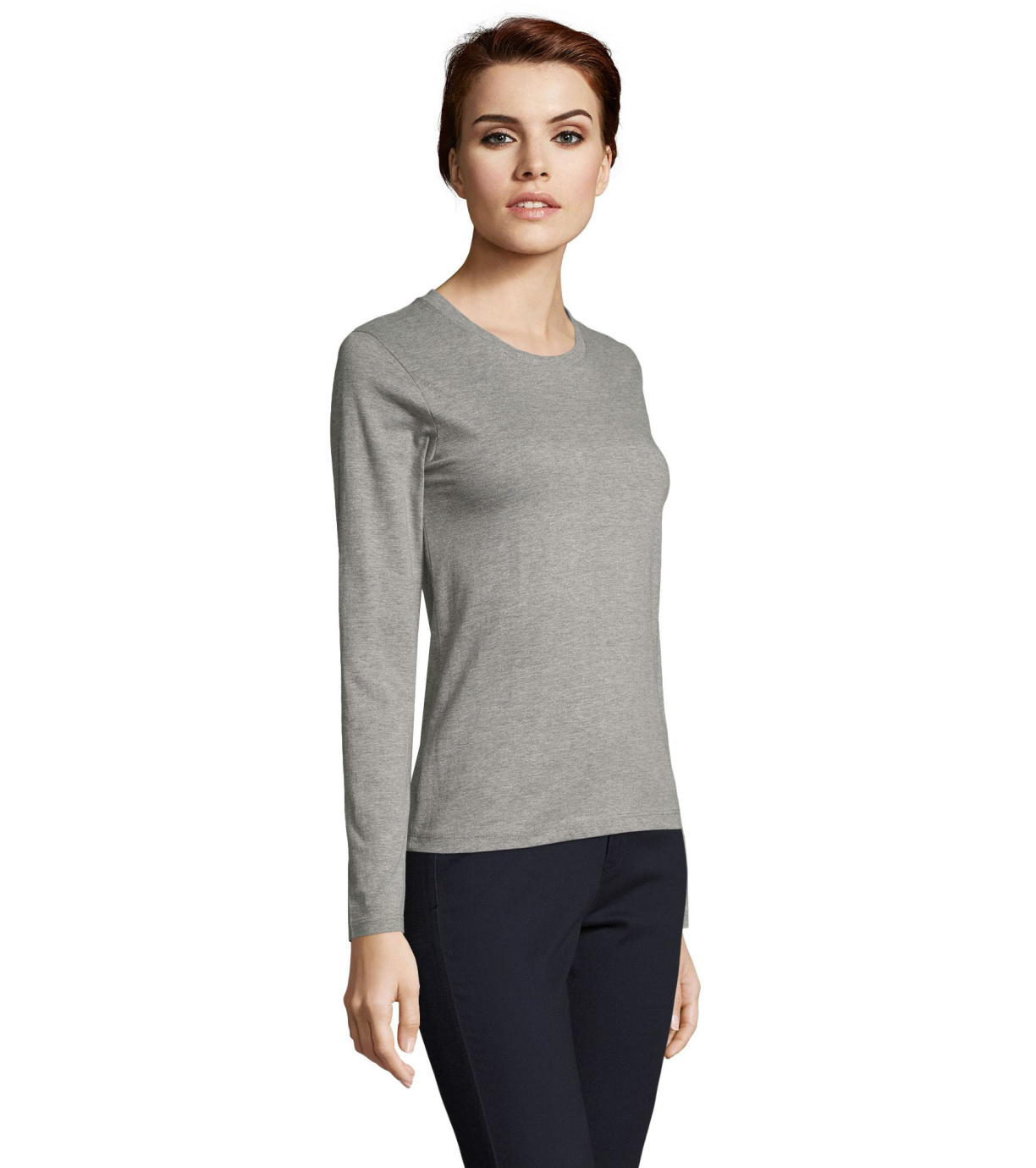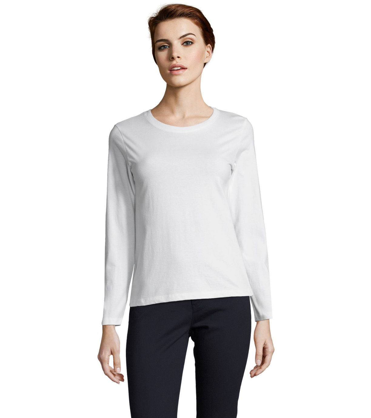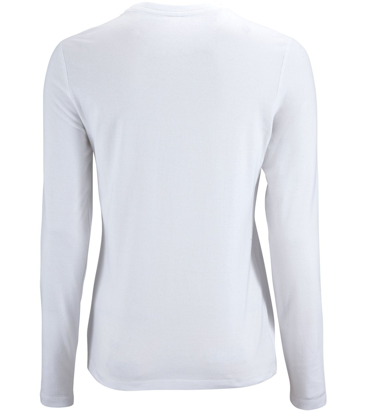 Koszulka damska z długim rękawem. Kołnierzyk wykończony prążkowanym elastycznym wykończeniem.