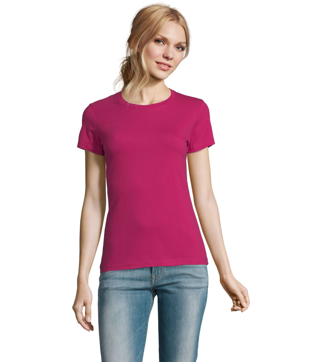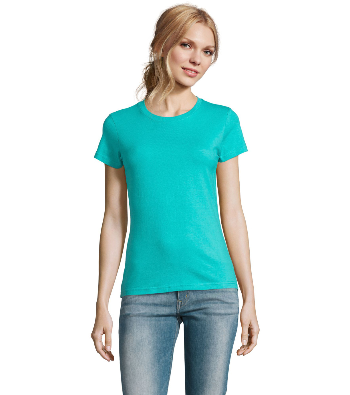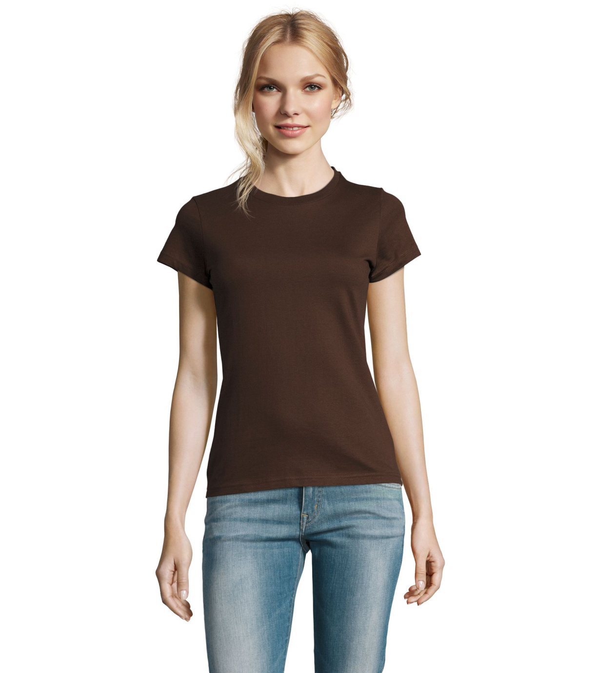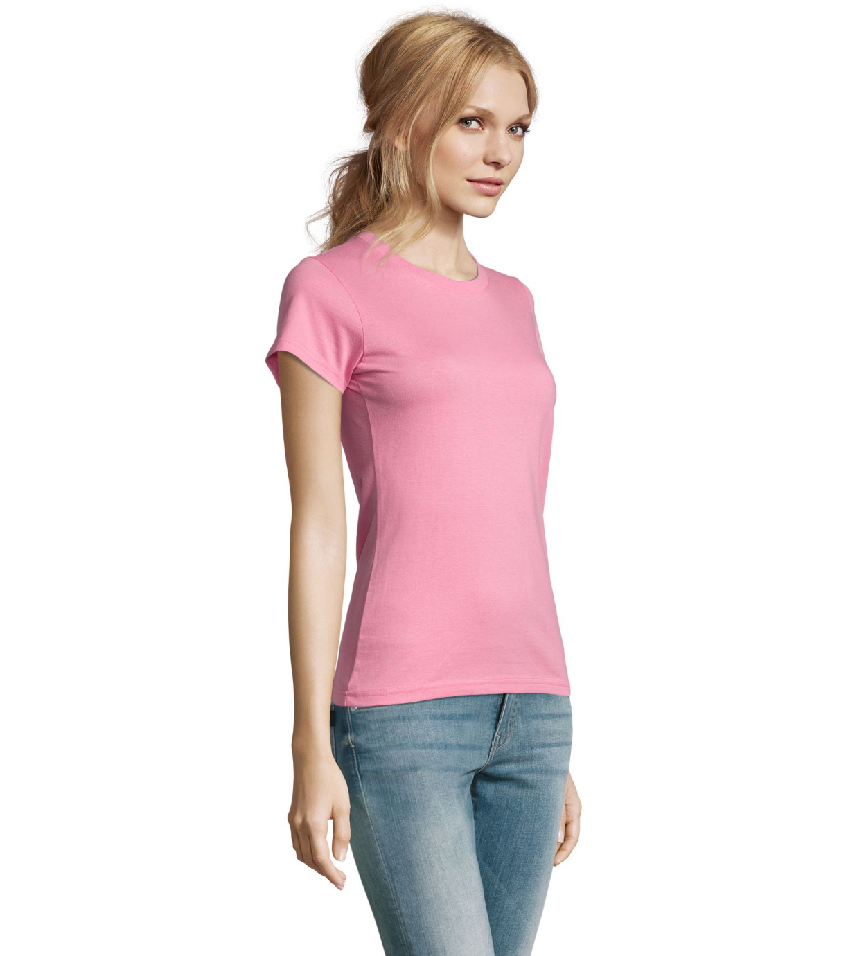 Damska bawełniana koszulka z krótkim rękawem. Dzięki obróbce powierzchni, jakości, 25 kolorom, 5 rozmiarom, wersji damskiej i dziecięcej, Imperial stał się popularnym elementem garderoby. T-shirt ma boczne szwy, podklejony i elastyczny kołnierzyk.