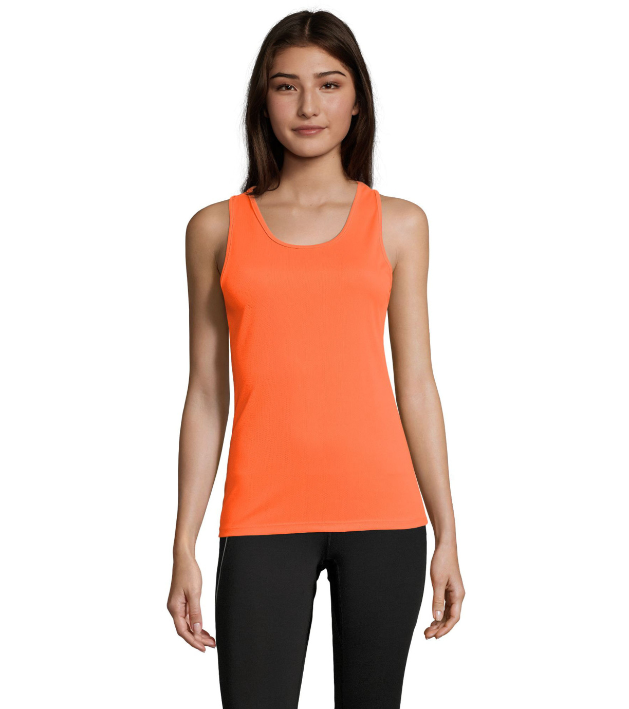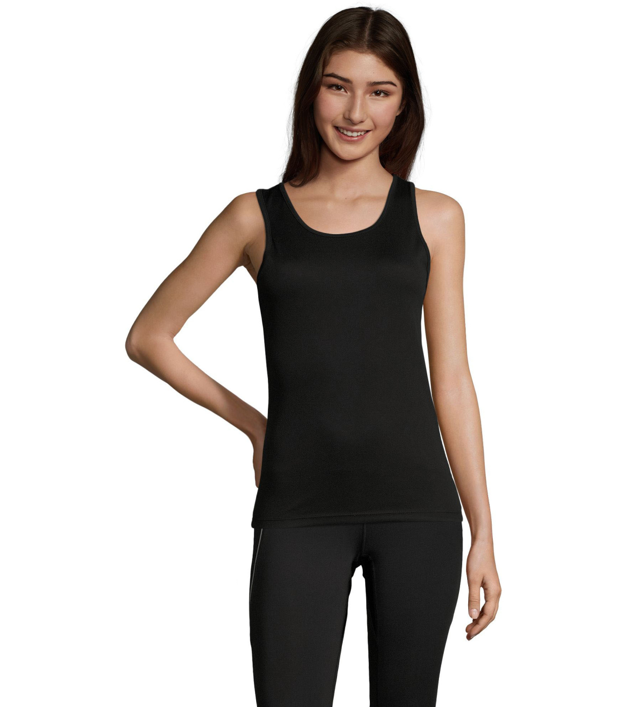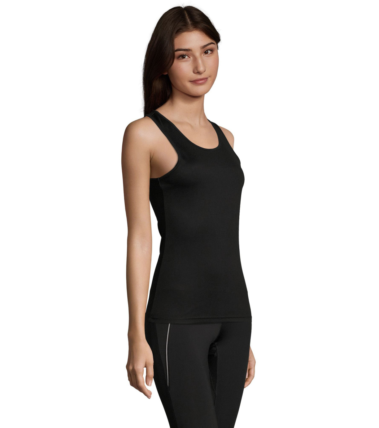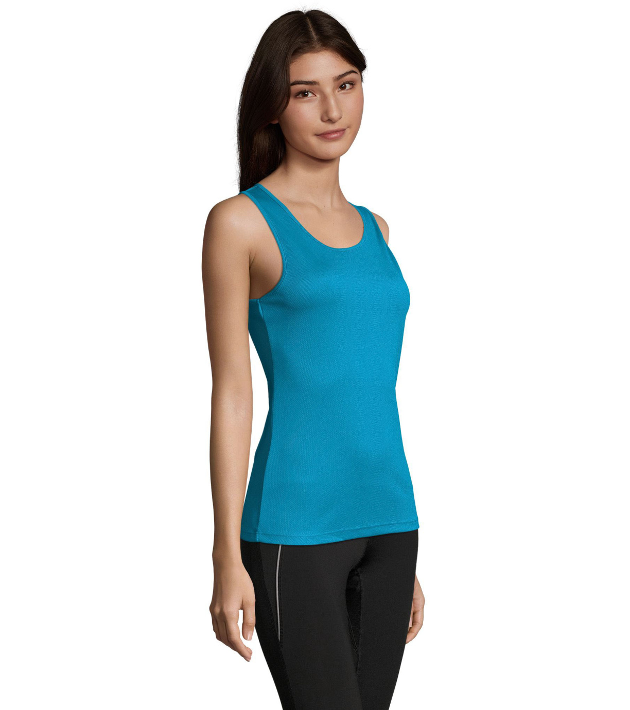 Damski podkoszulek wykonany z szybkoschnącego materiału, ma delikatne wykończenia wokół szyi i pod pachami, dopasowany krój ze szwami bocznymi.