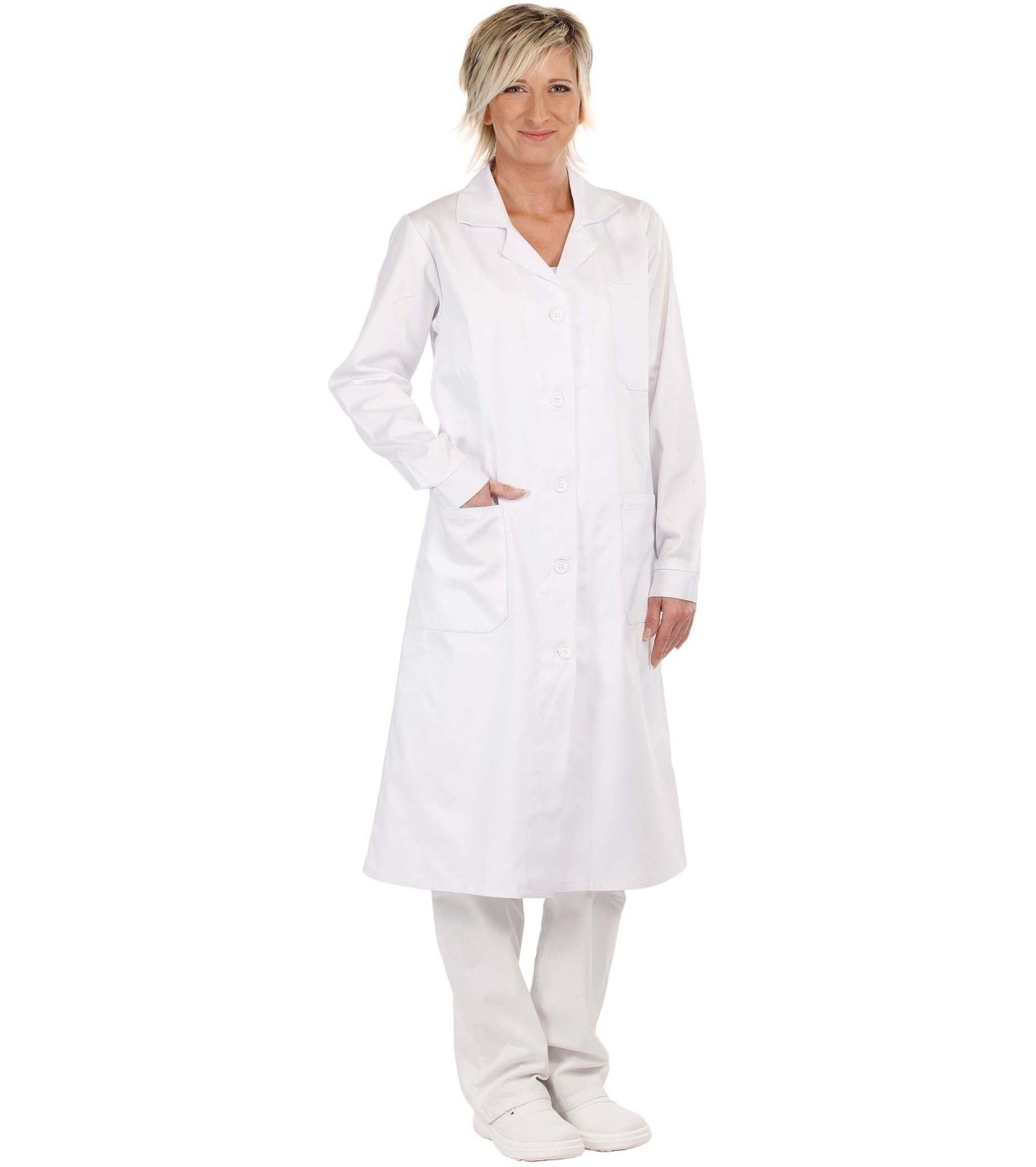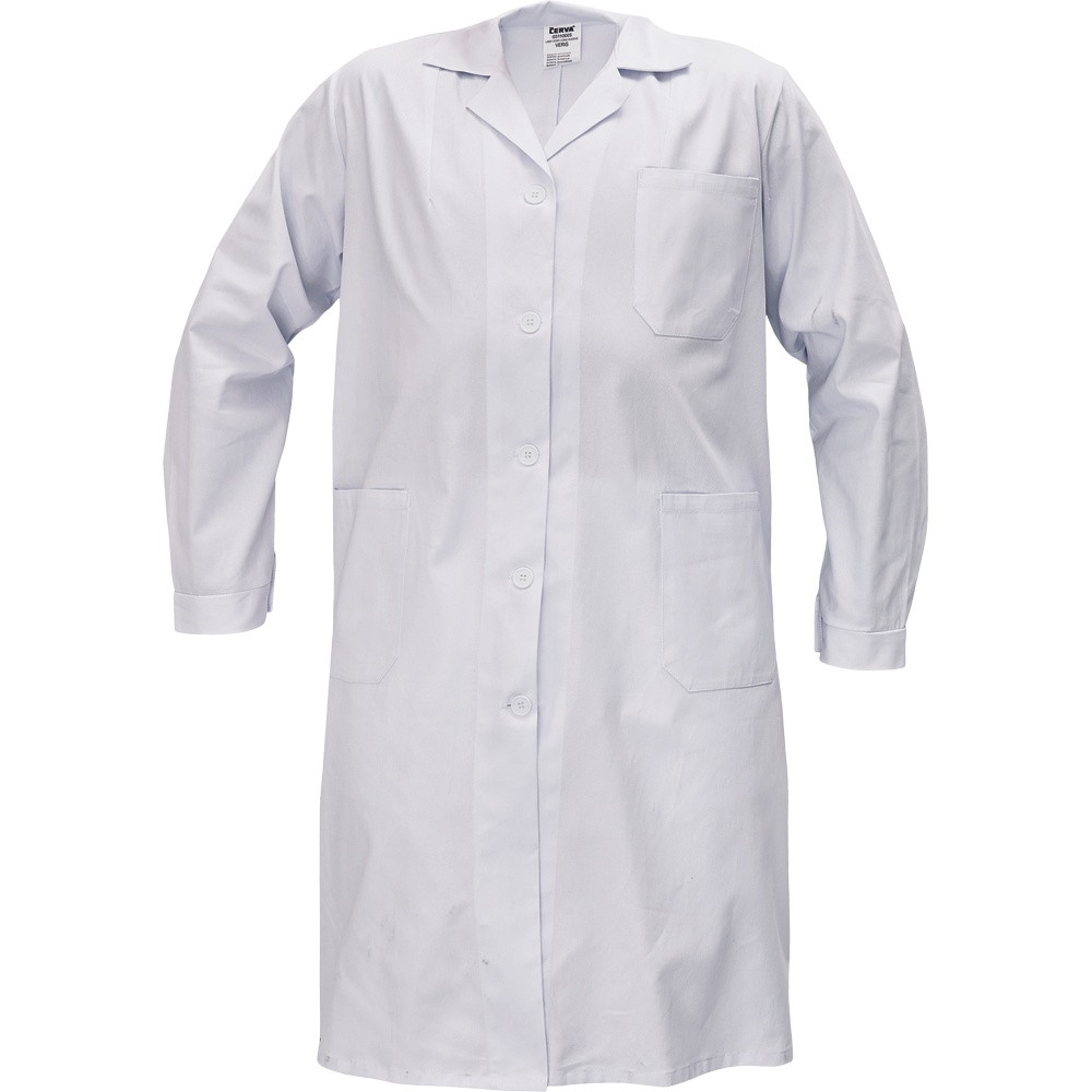 Opis: • damski fartuch roboczy z długim rękawem • 3 kieszenie, pasek w części tylnej