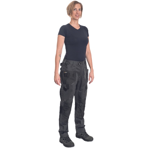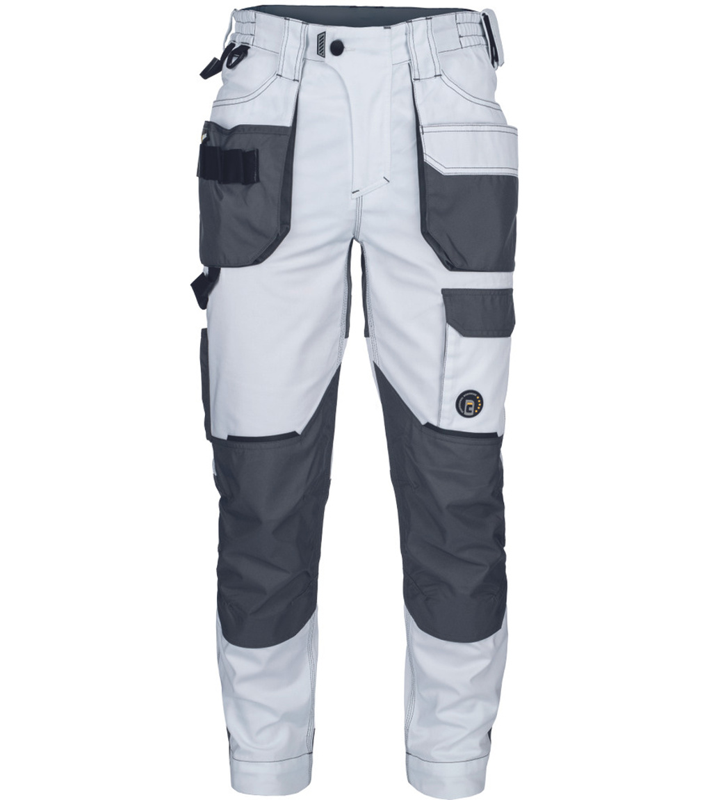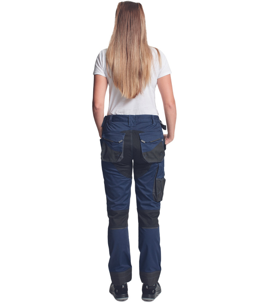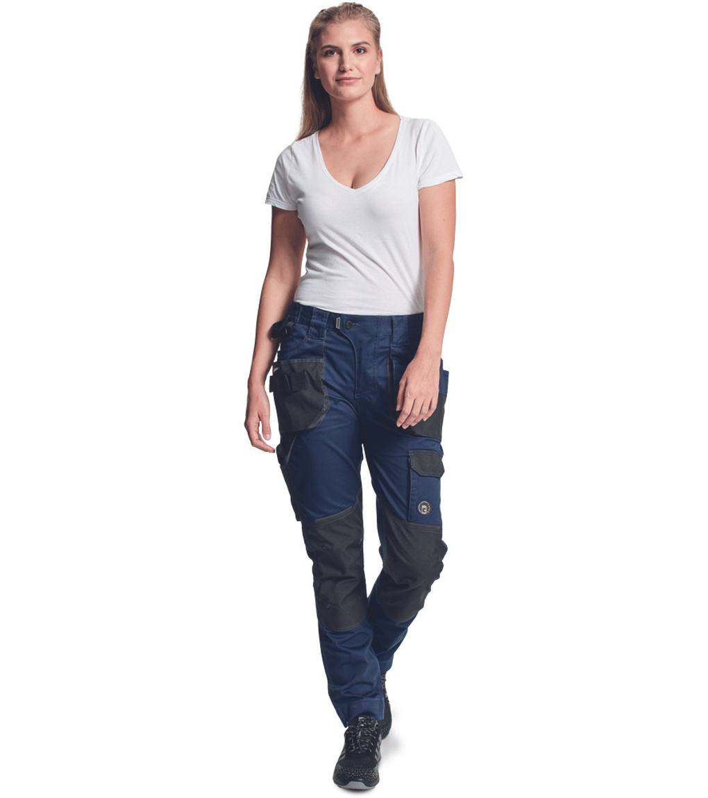 Opis: lady's working pants with elastic waist; elastic inovative fabric TRIFIBETEX; durable tripple stitching of legs and crotch; Oxford 600D reinforced knee parts with input for knee pads; spacious multifunctional front pockets with tool strap; reflective details; extendable length of legs.