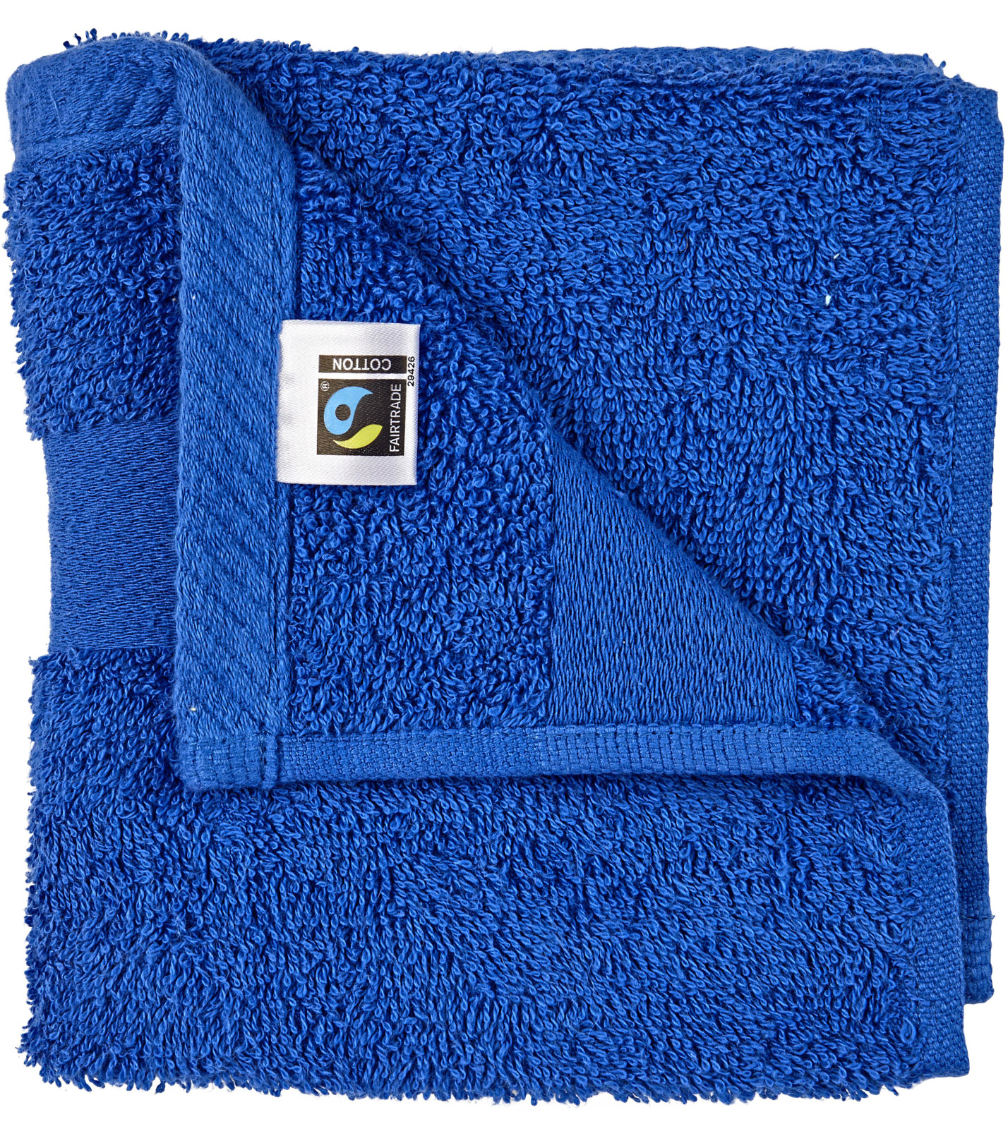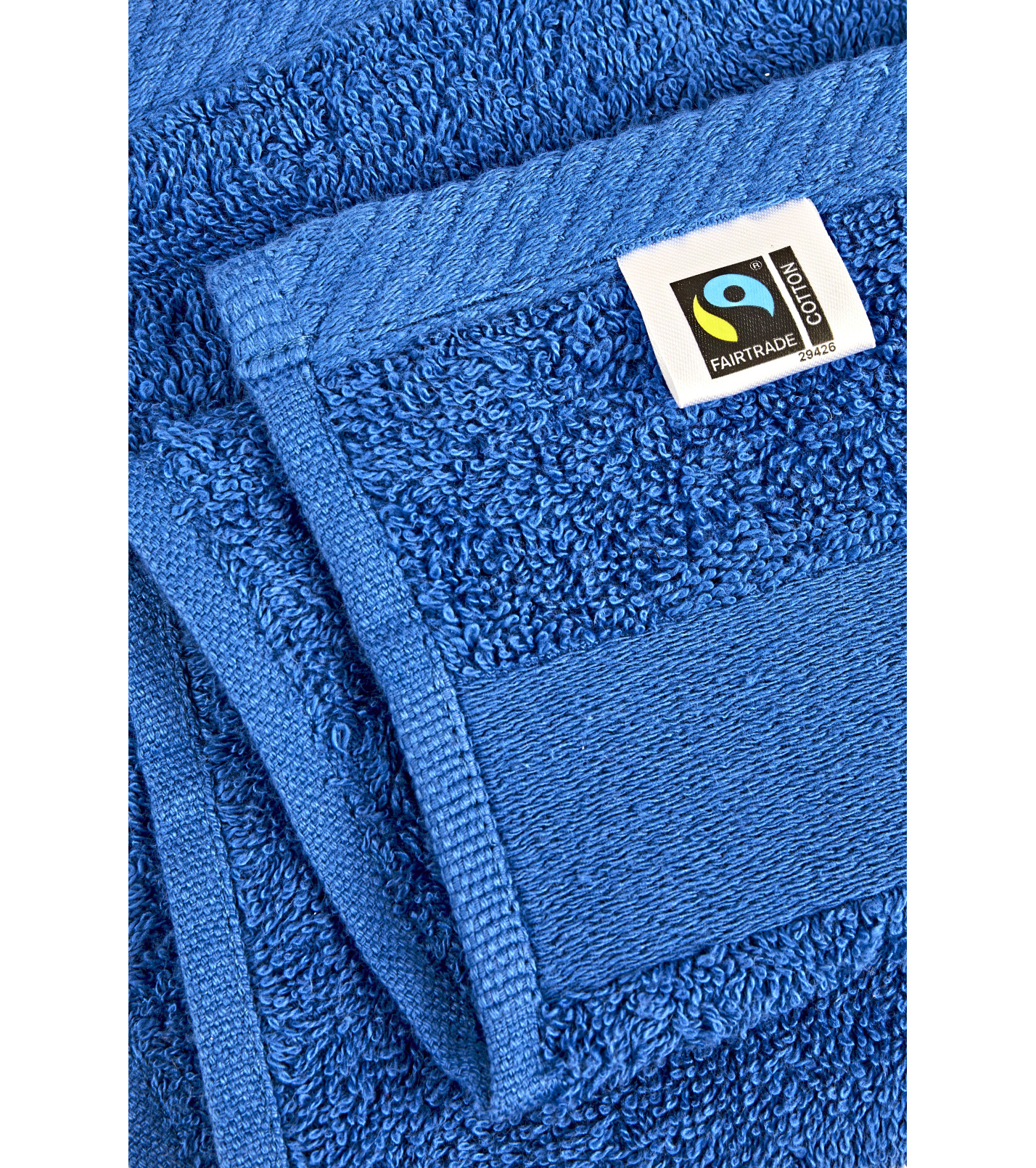 Metka Fairtrade na ręczniku pod pętelką, pośrodku krótkiej krawędzi