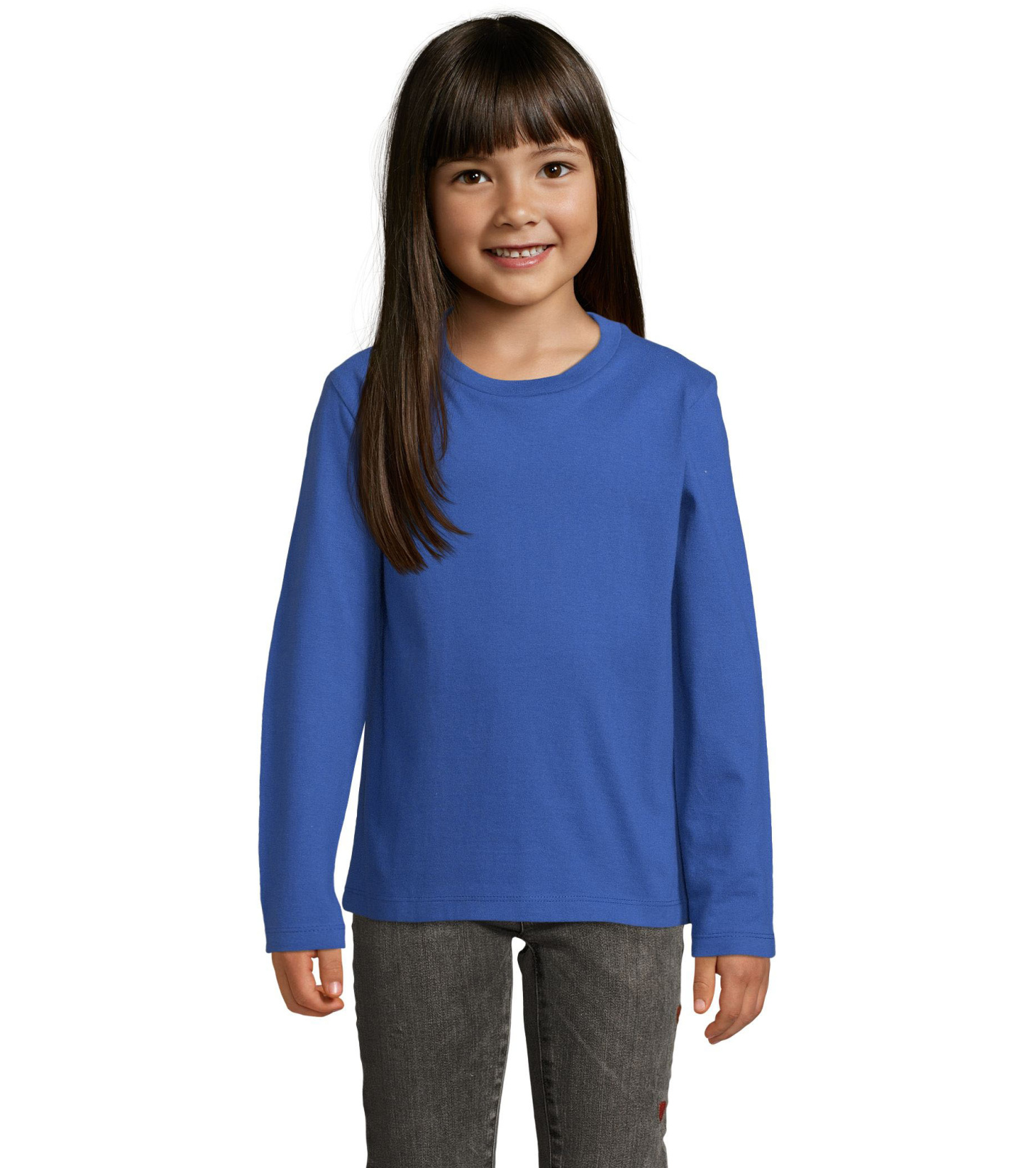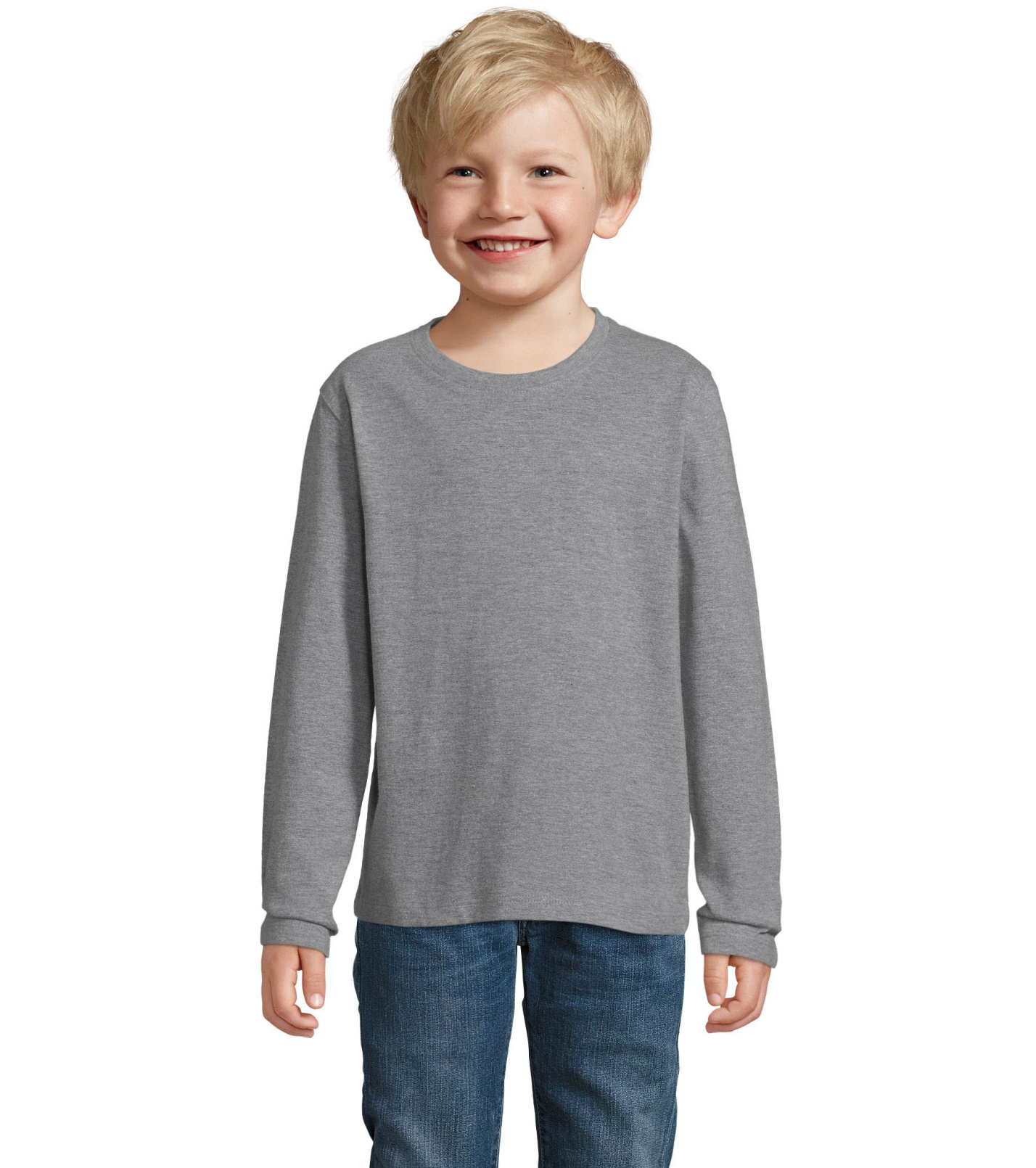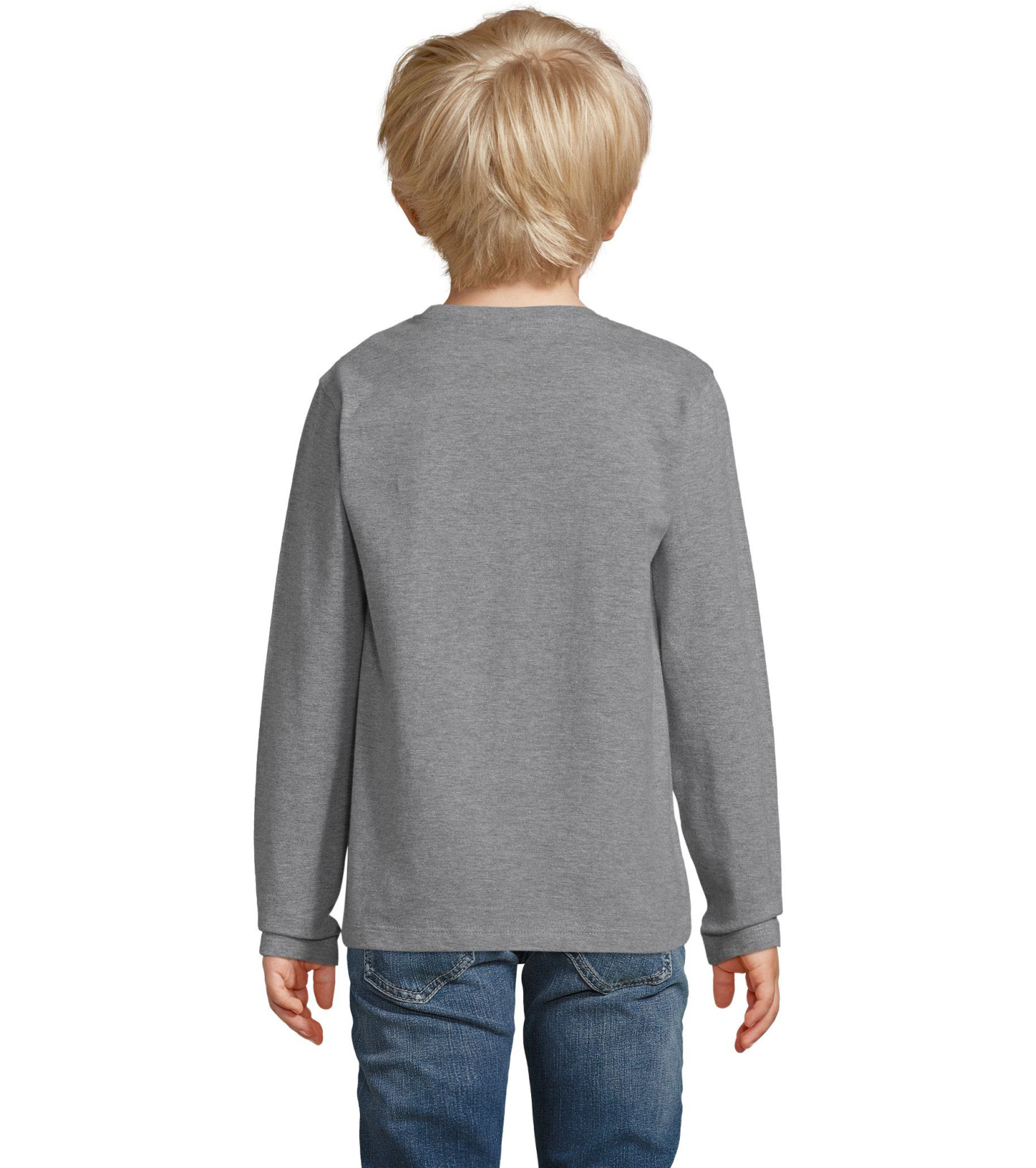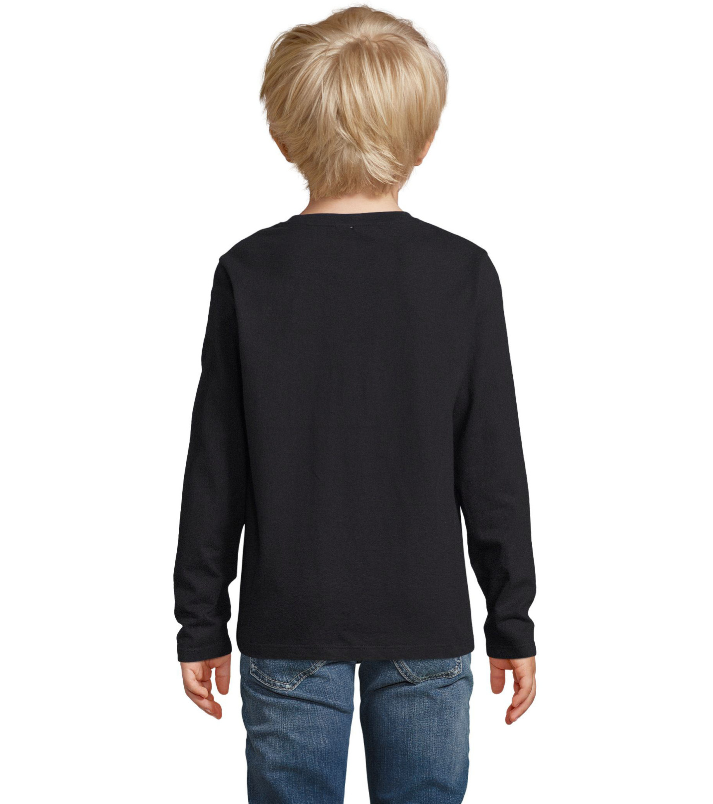 T-shirt dziecięcy z długim rękawem, dopasowanym krojem ze szwami bocznymi, okrągłym dekoltem i kołnierzykiem z elastanu.