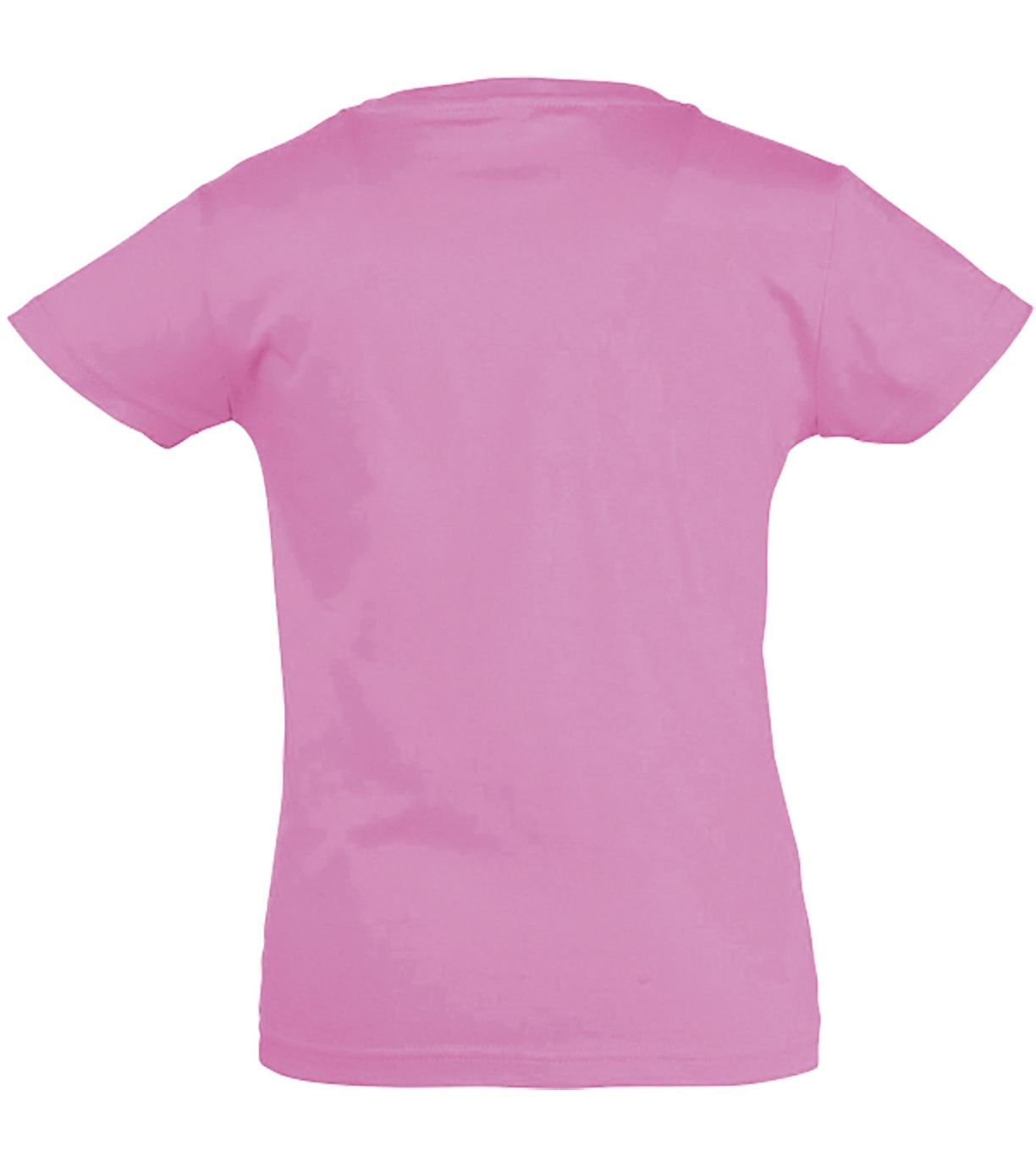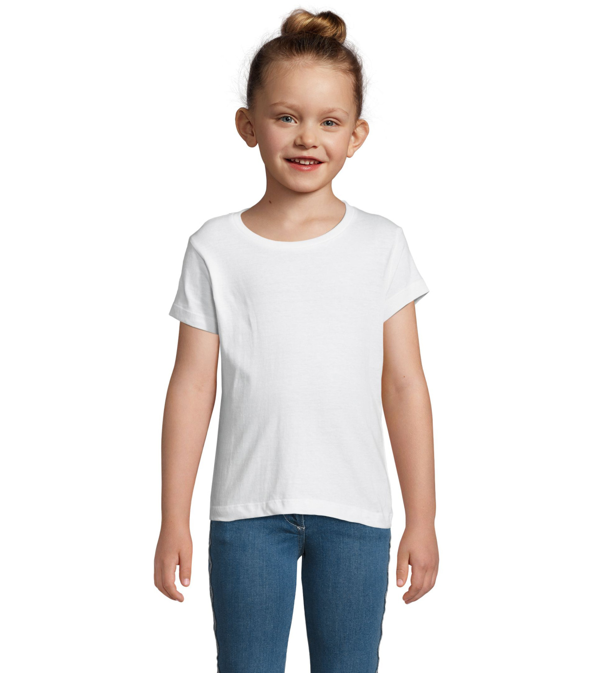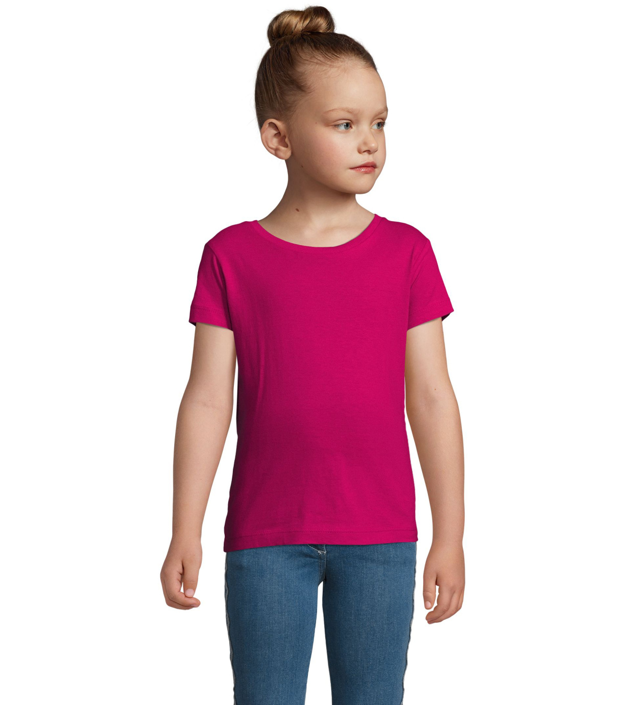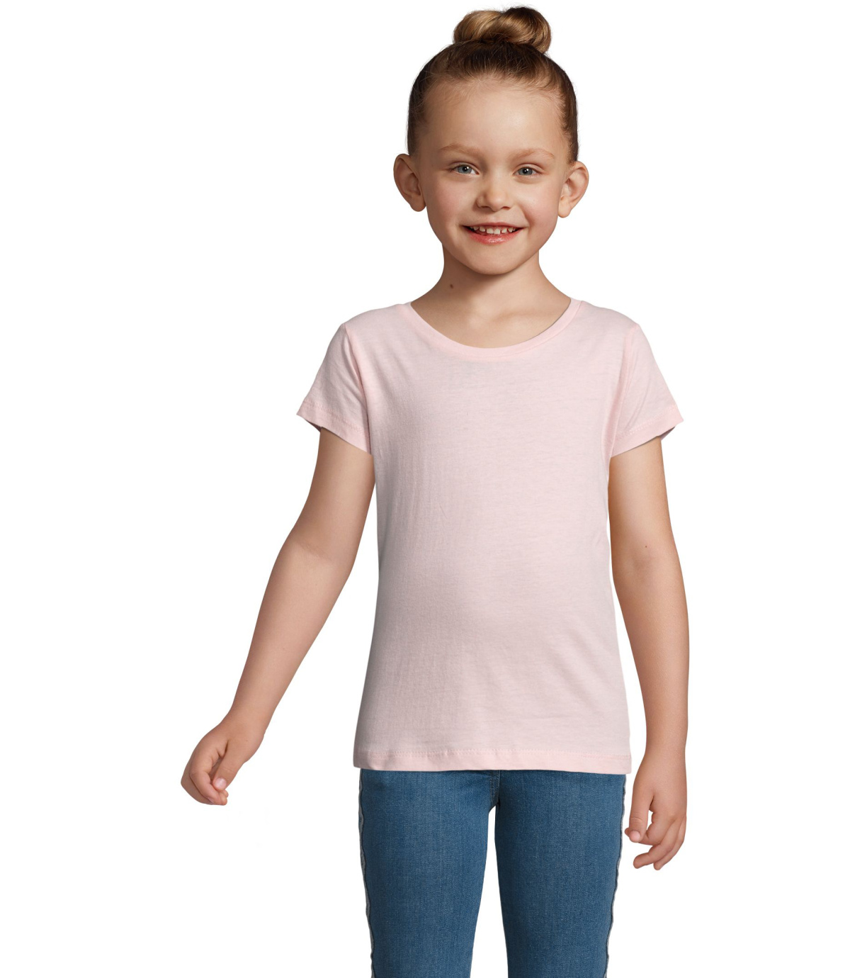 T-shirt dziewczęcy z krótkim rękawem i okrągłym dekoltem. Dopasowany krój zapewnia wygodę. Cieńszy kołnierzyk z elastycznym ściągaczem.