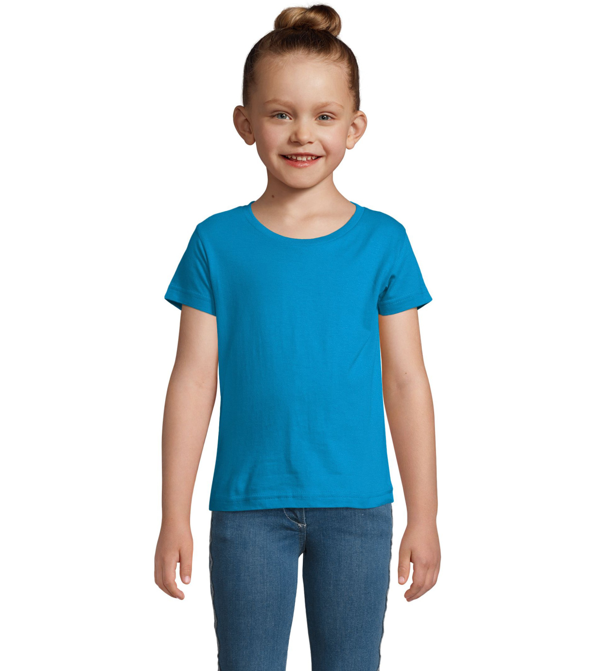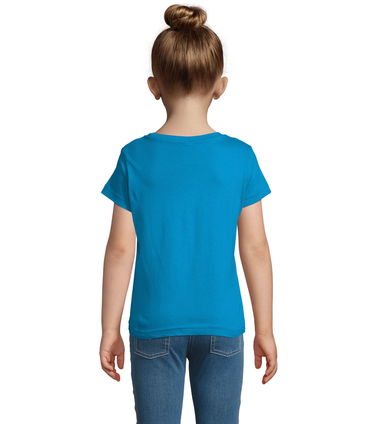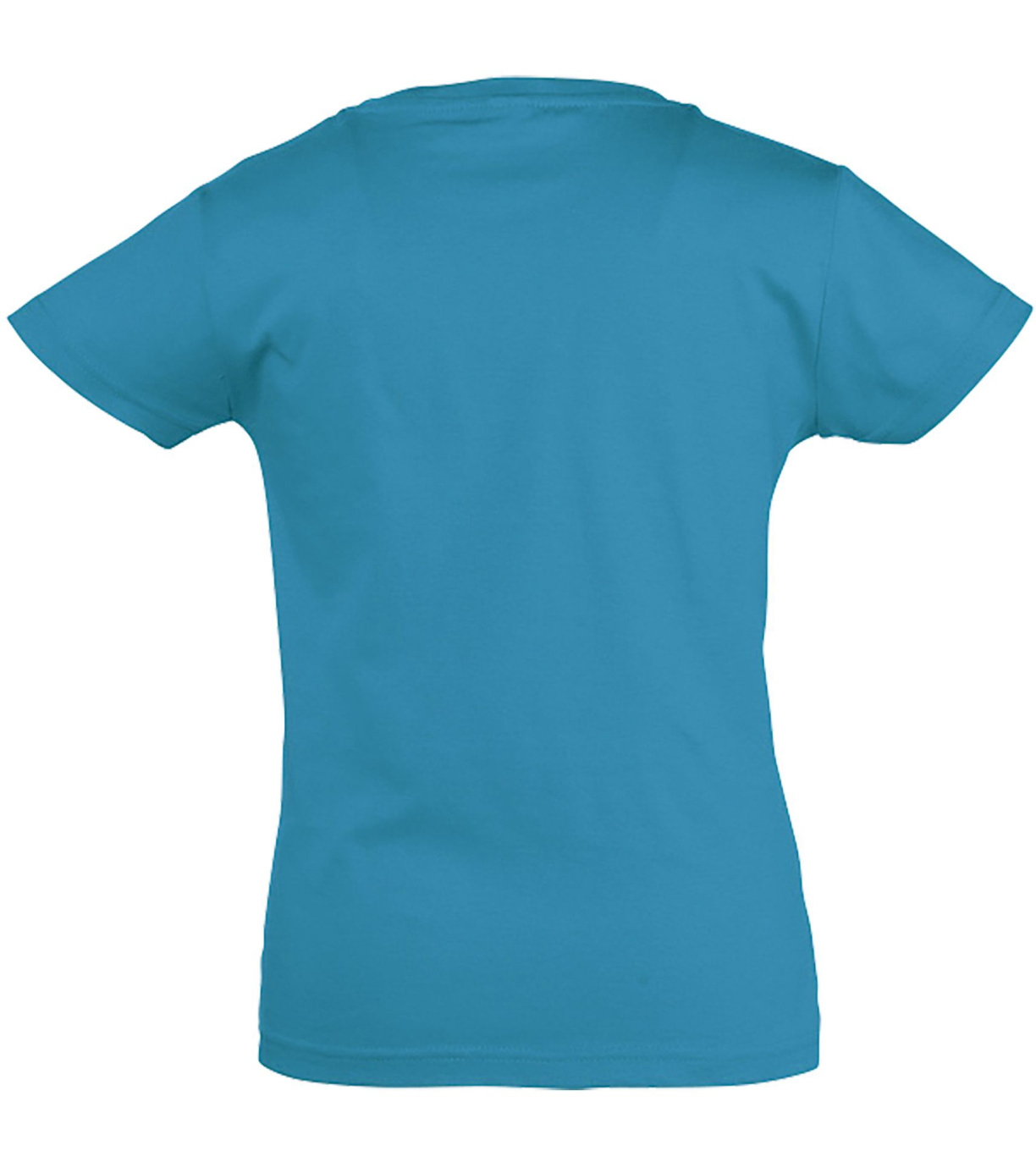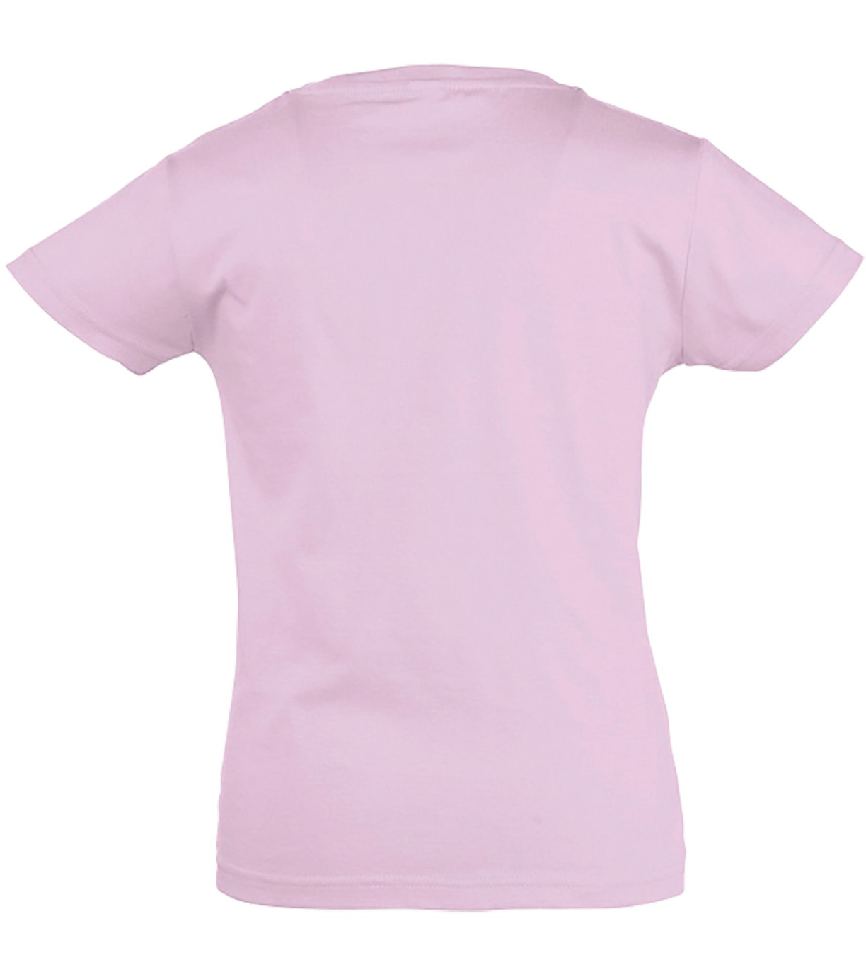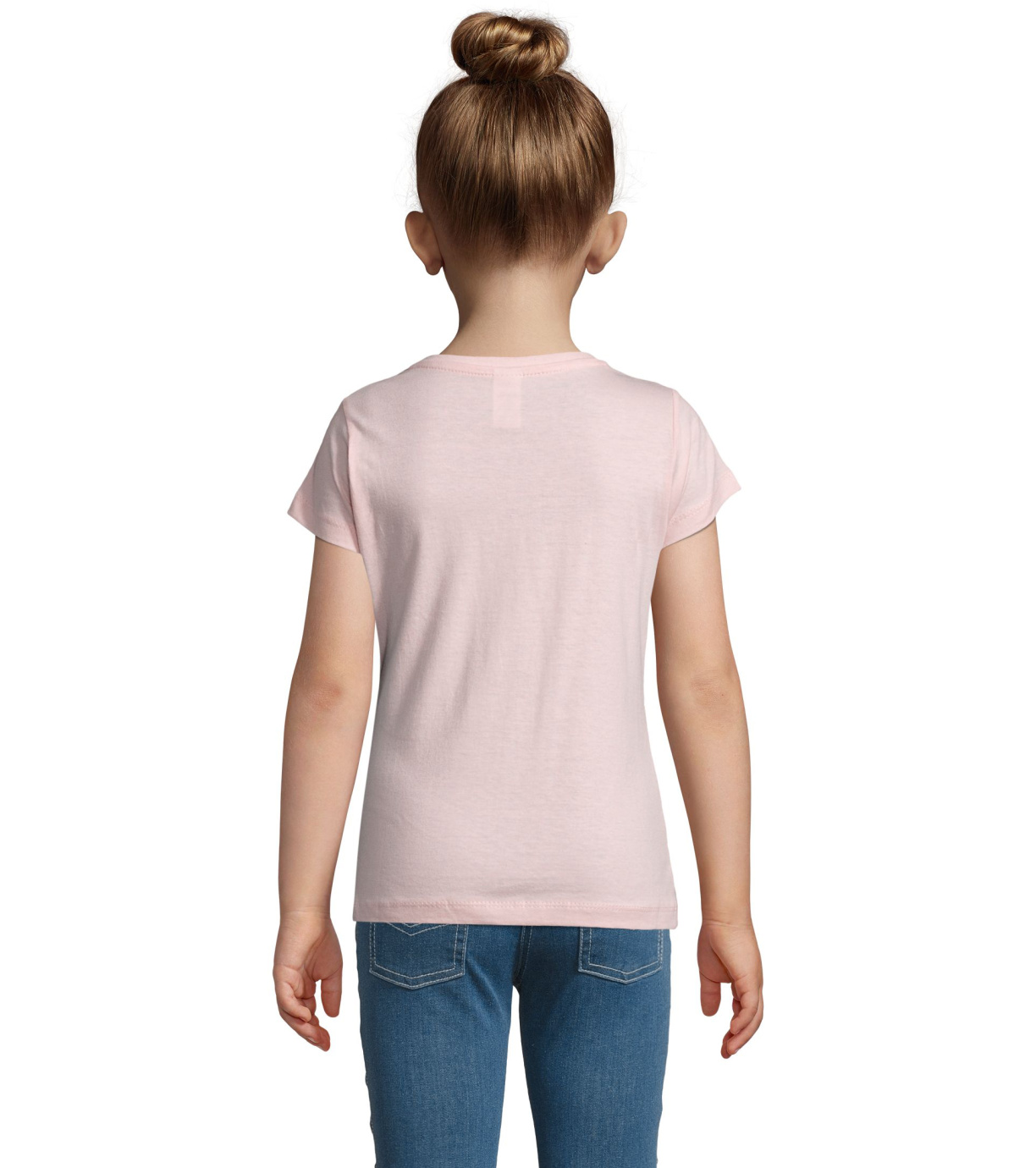 T-shirt dziewczęcy z krótkim rękawem i okrągłym dekoltem. Dopasowany krój zapewnia wygodę. Cieńszy kołnierzyk z elastycznym ściągaczem.