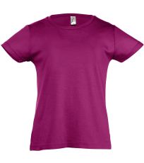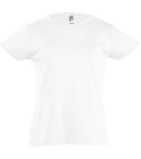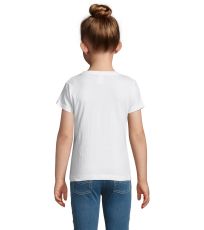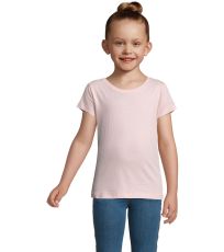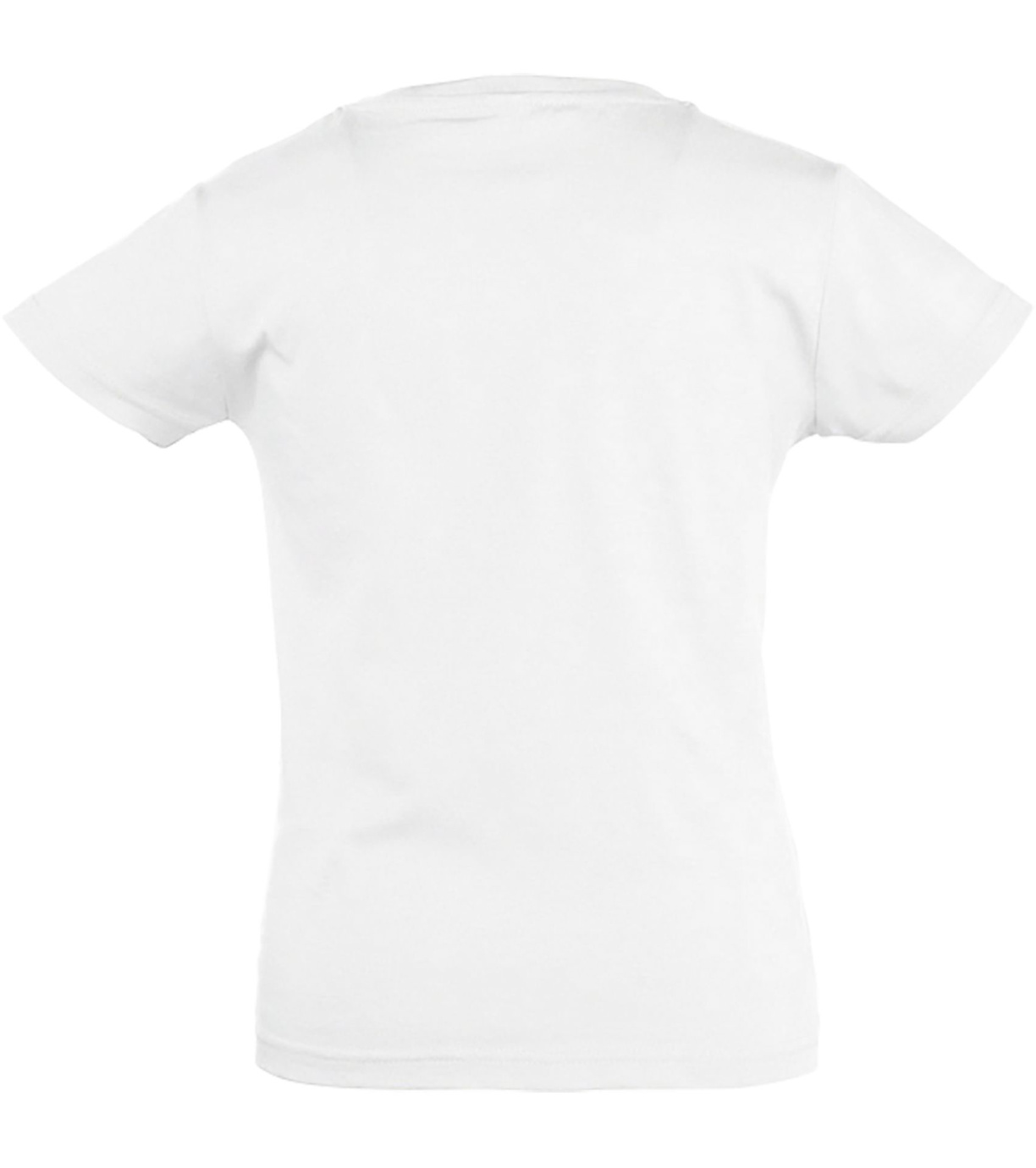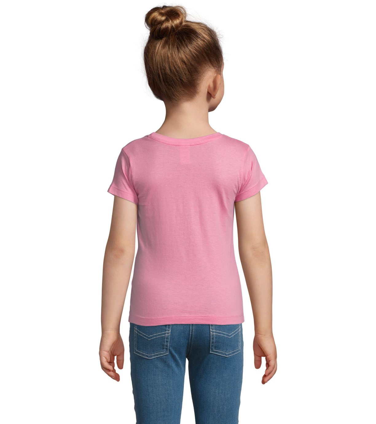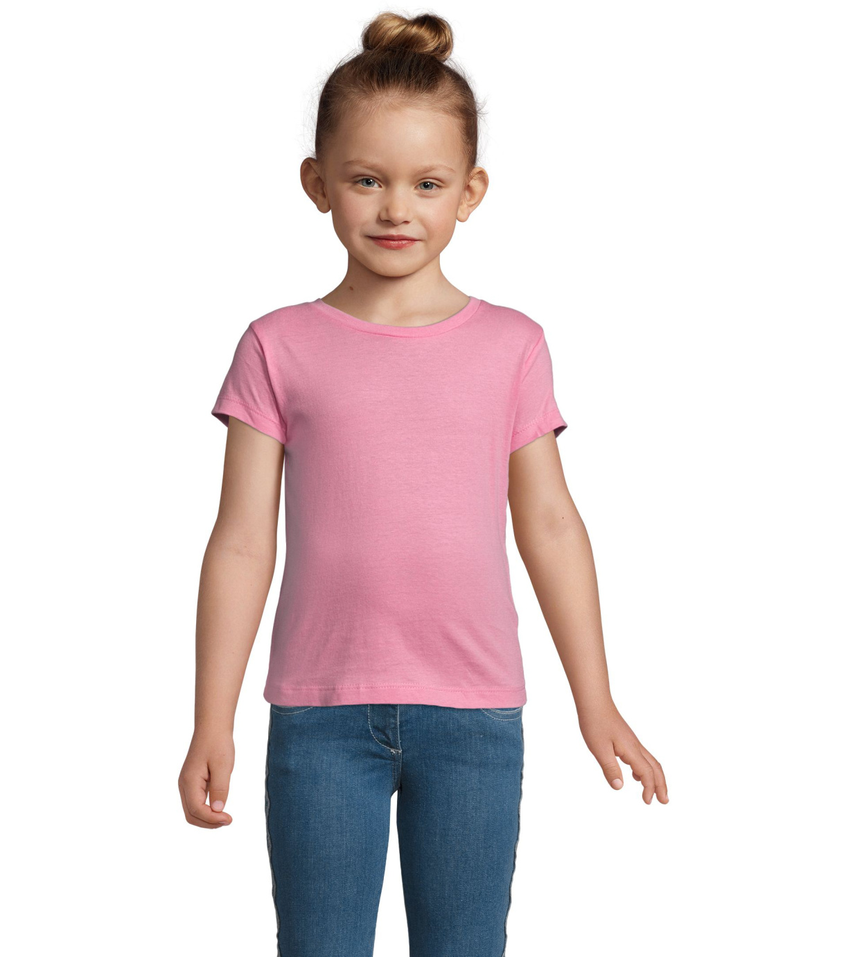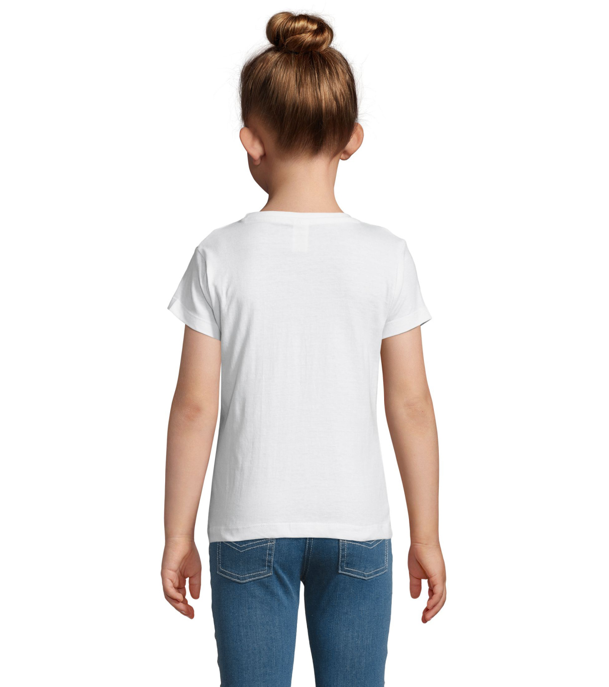 T-shirt dziewczęcy z krótkim rękawem i okrągłym dekoltem. Dopasowany krój zapewnia wygodę. Cieńszy kołnierzyk z elastycznym ściągaczem.