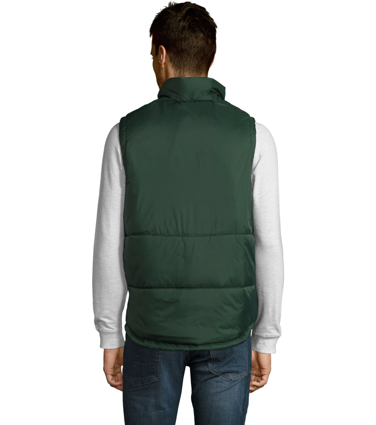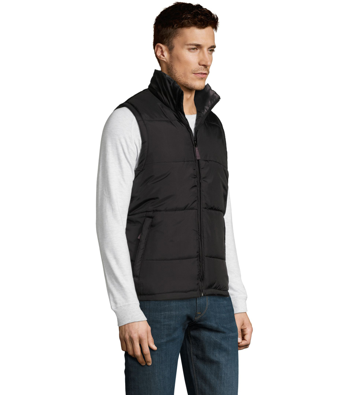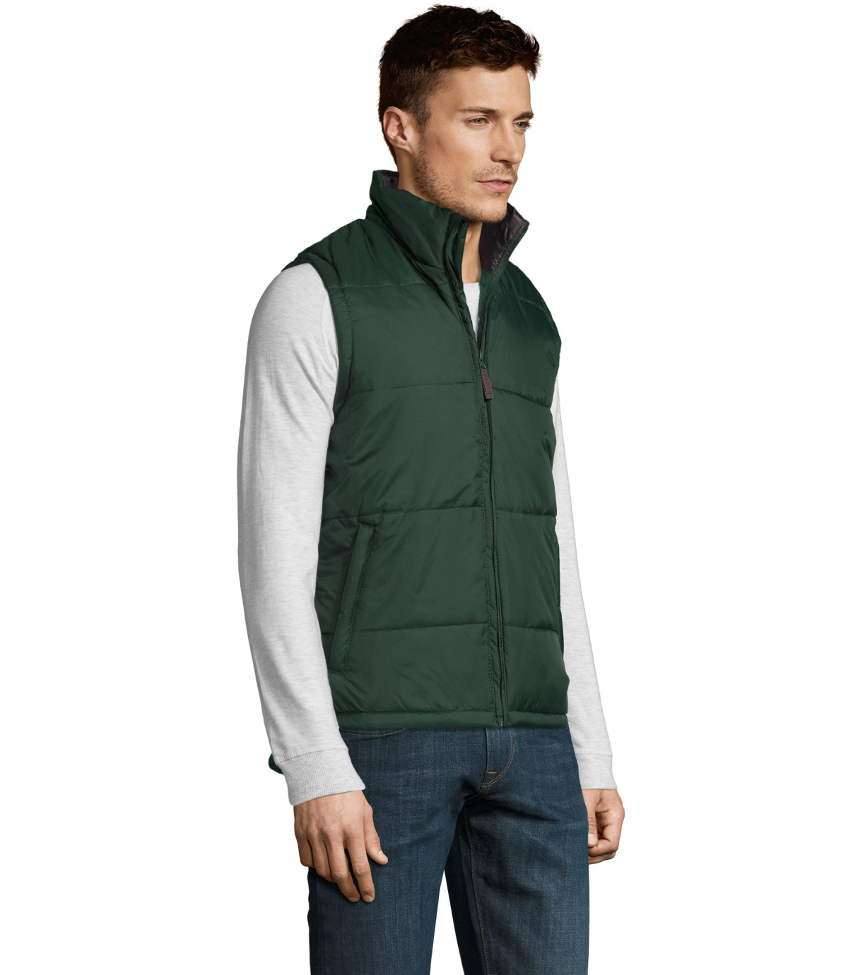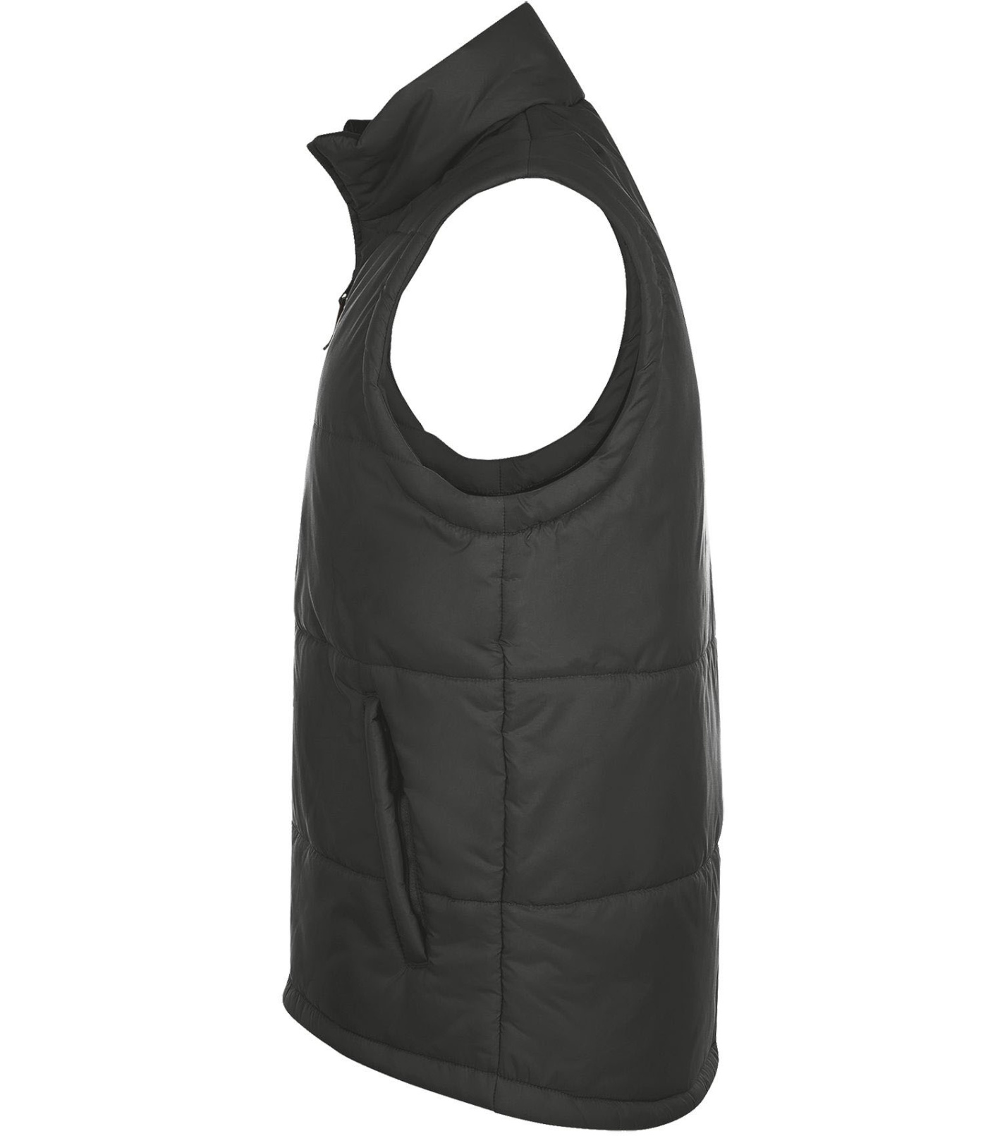 Kamizelka z wysokim kołnierzem i zapięciem na zamek. Dwie boczne kieszenie zapinane na zamek. Kamizelka wodoodporna i wiatroodporna z dużym płaskim tyłem.