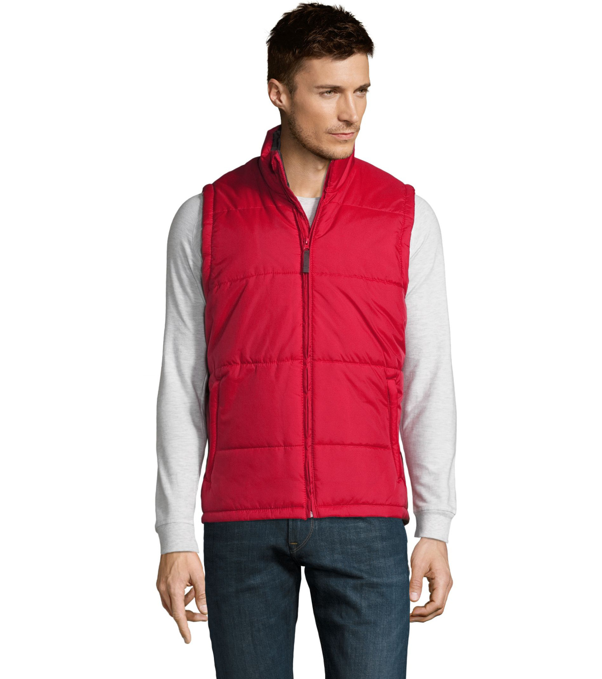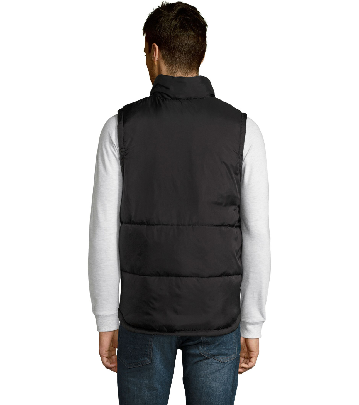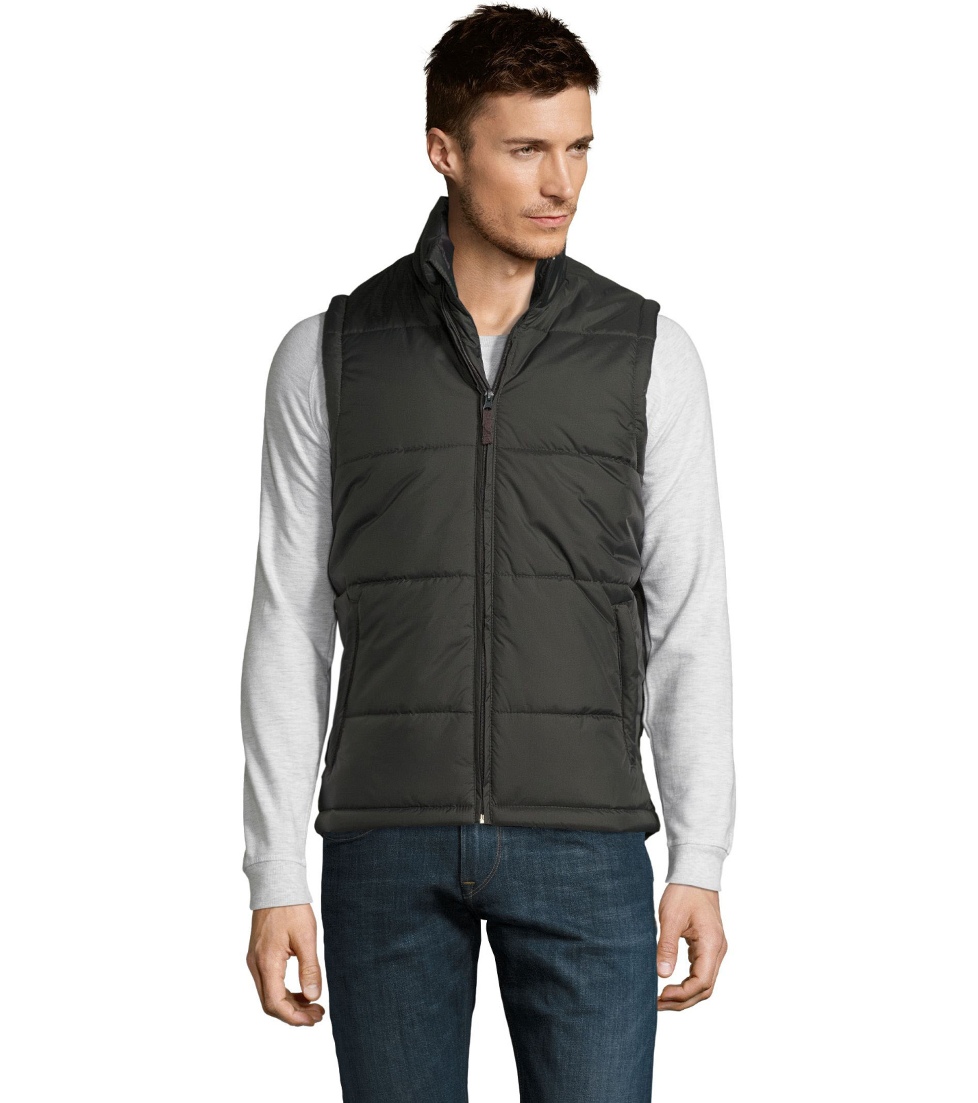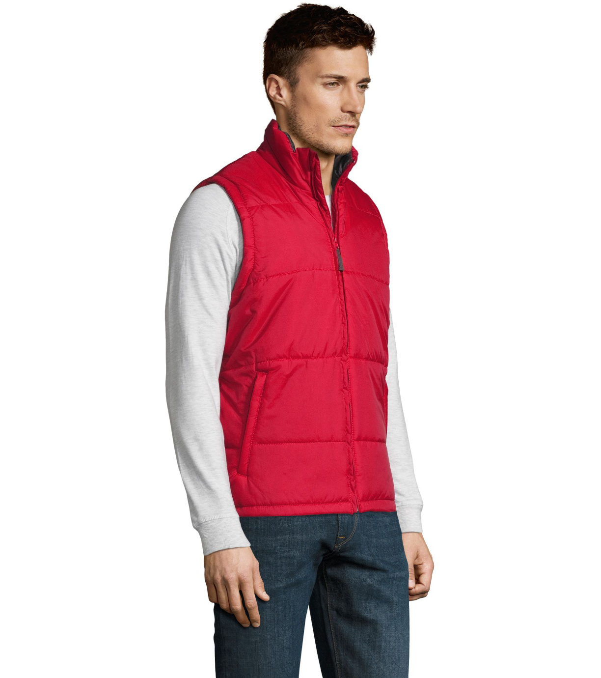 Kamizelka z wysokim kołnierzem i zapięciem na zamek. Dwie boczne kieszenie zapinane na zamek. Kamizelka wodoodporna i wiatroodporna z dużym płaskim tyłem.