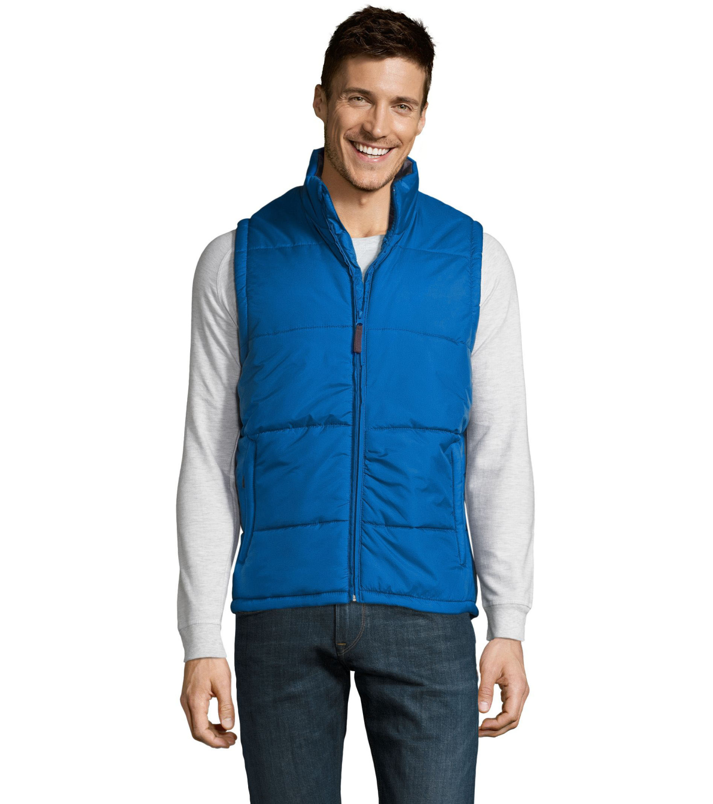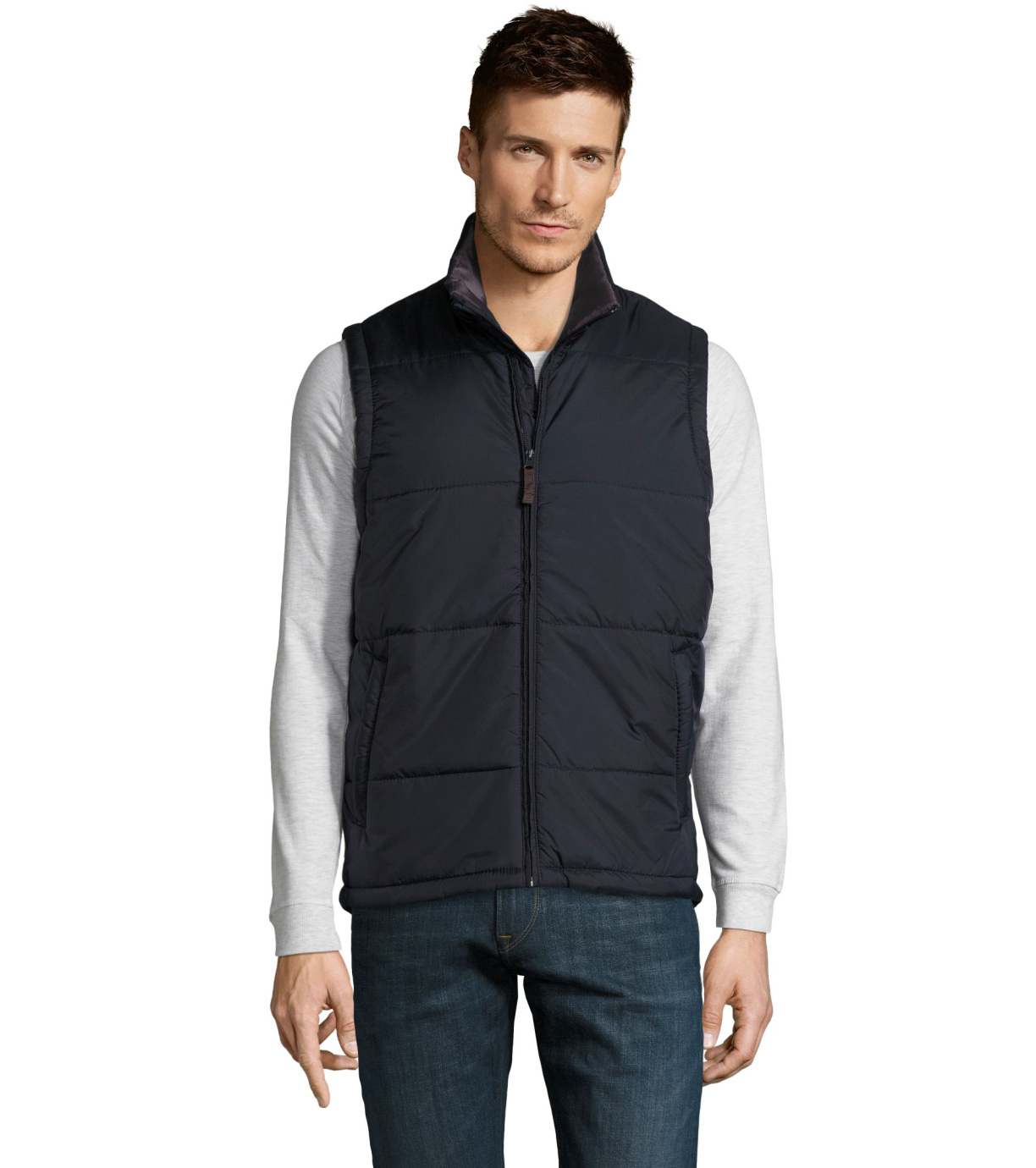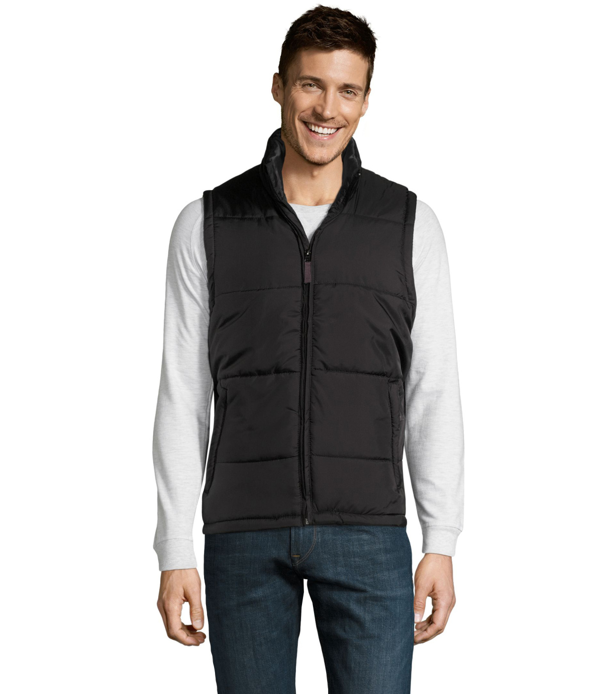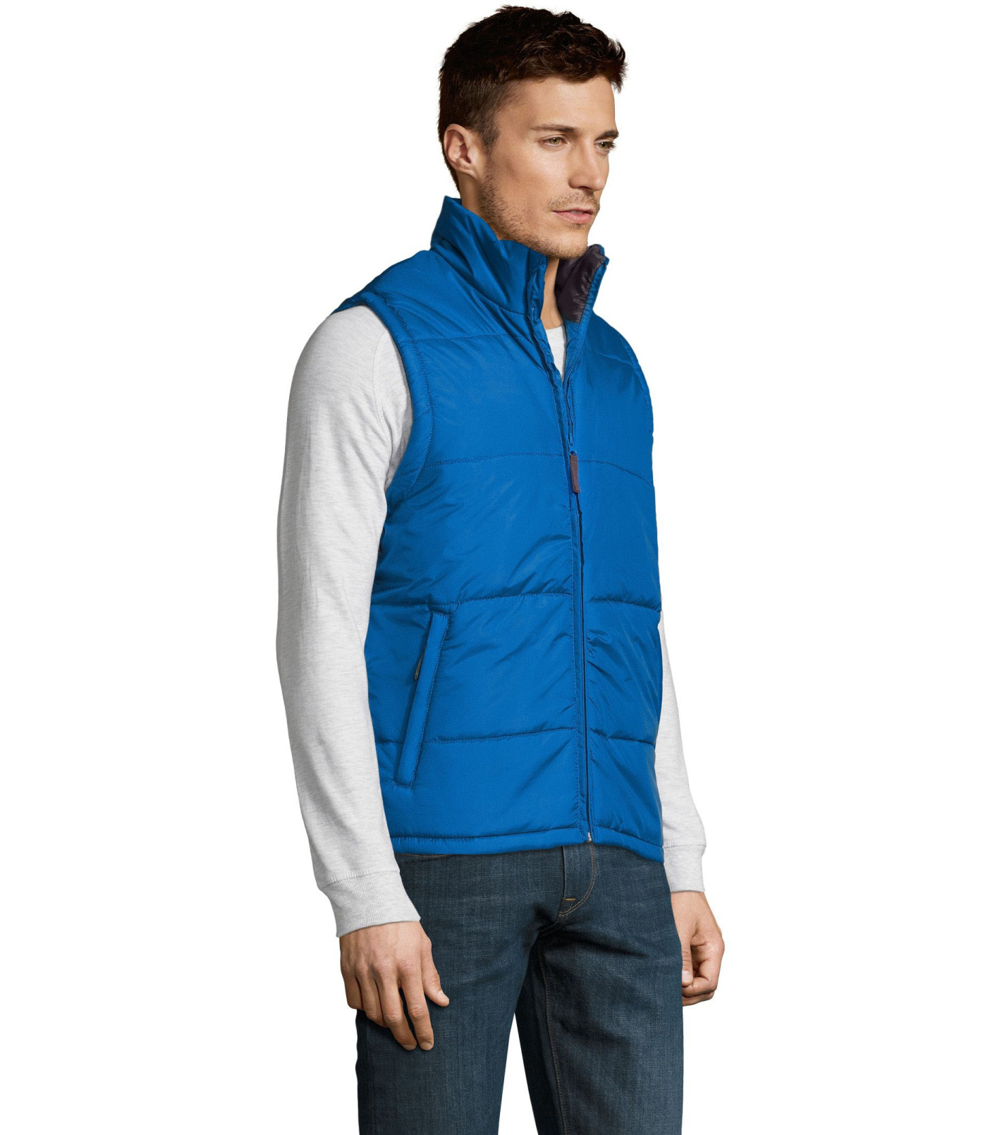 Kamizelka z wysokim kołnierzem i zapięciem na zamek. Dwie boczne kieszenie zapinane na zamek. Kamizelka wodoodporna i wiatroodporna z dużym płaskim tyłem.