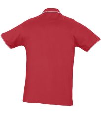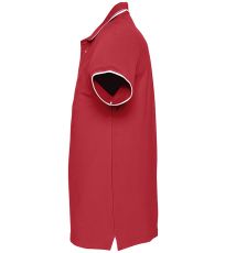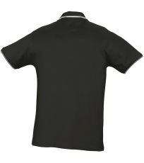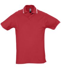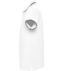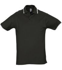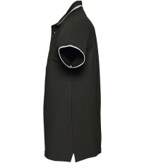 Męska bawełniana koszulka polo z krótkim rękawem, kontrastowym kołnierzykiem i mankietami. Zapinana pod szyją na cztery guziki w kolorze koszuli. Prosty dół z kontrastowymi rozcięciami i bocznymi szwami.