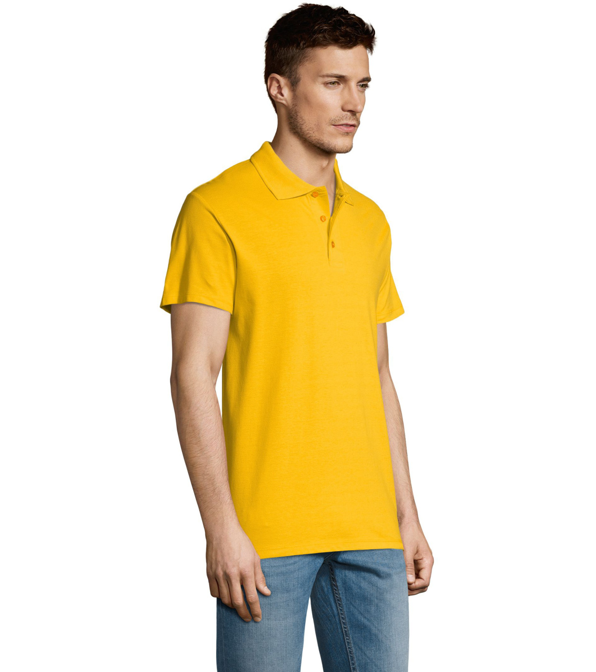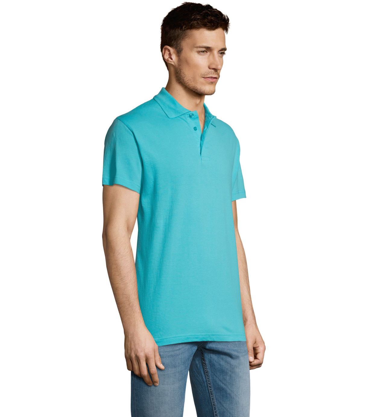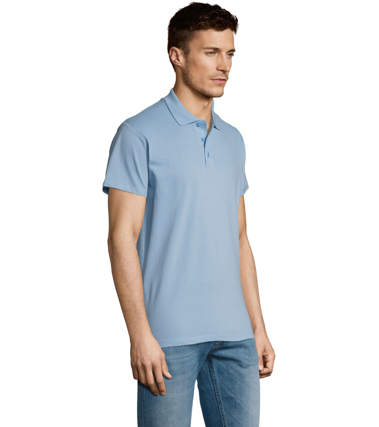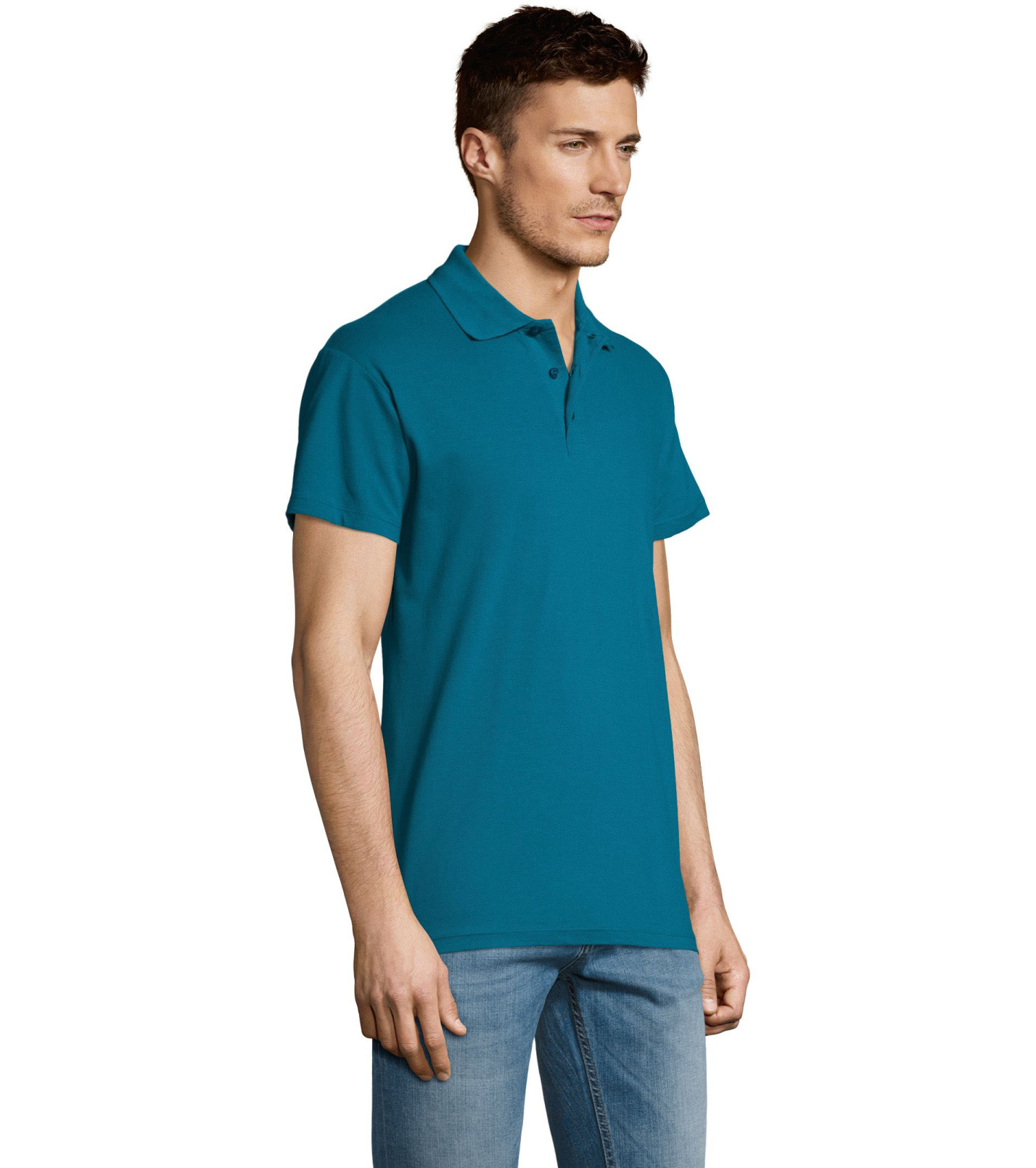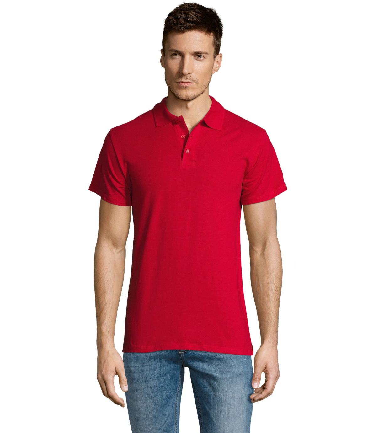 Męska bawełniana koszulka polo z krótkim rękawem. Produkt o doskonałym stosunku ceny do jakości oferowany w szerokiej gamie kolorystycznej. Koszulka polo o dopasowanym kroju z trzema guzikami w odcieniu koszulki polo do zapinania pod szyją i jednym zapasowym guzikiem na wewnętrznym szwie. Prosty dół z rozcięciami po bokach.