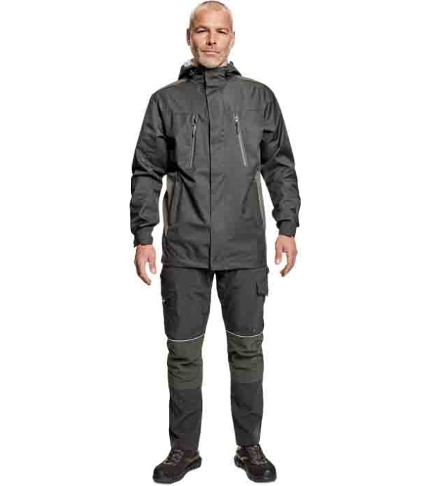 Opis: lekka, męska kurtka outdoorowa z kapturem • wodoodporna i oddychająca • wyposażona w 4 kieszenie zapinane na zamek błyskawiczny • rękawy regulowane na rzepy • zapinana na zamek błyskawiczny kryty plisą na rzep • regulacja kaptura za pomocą sznurka • odblaskowy piping ton w ton