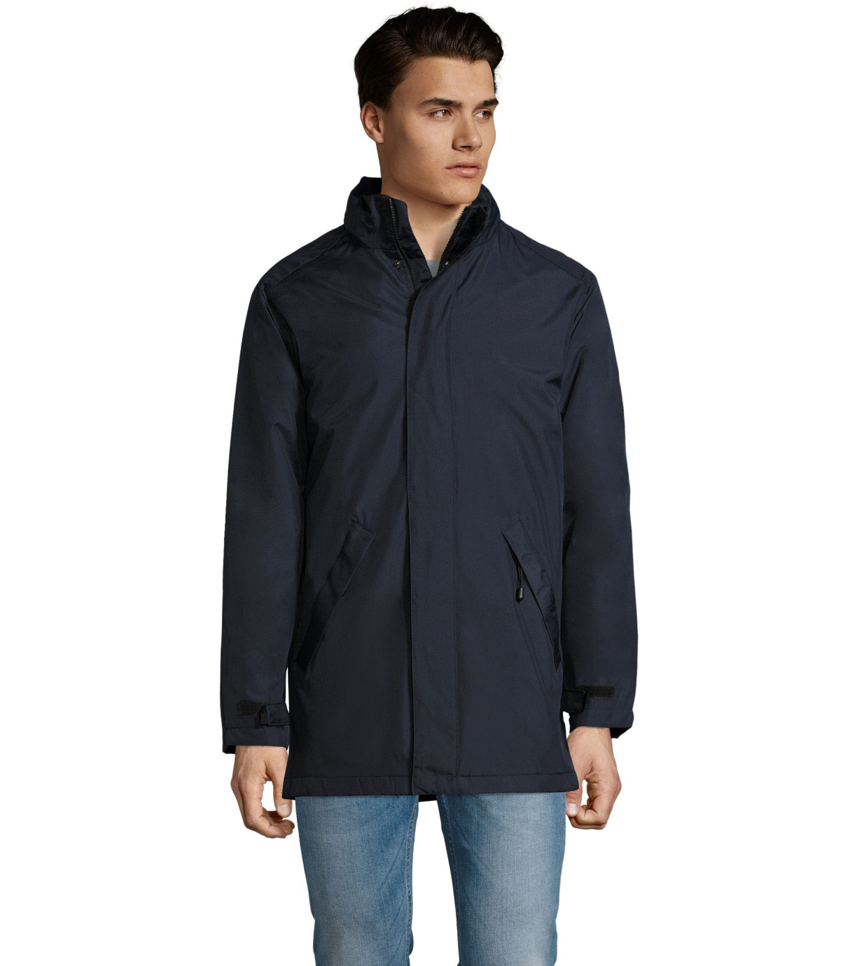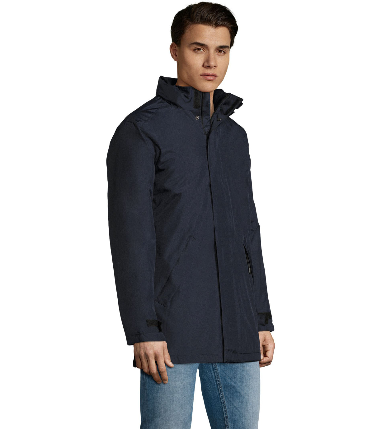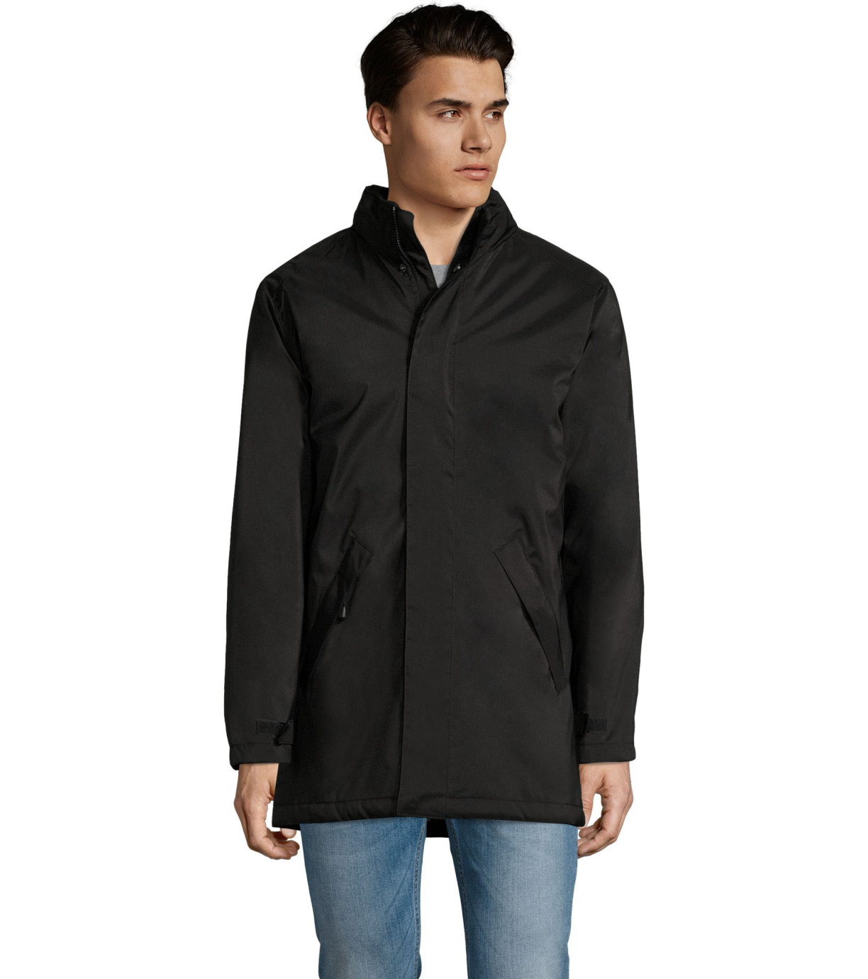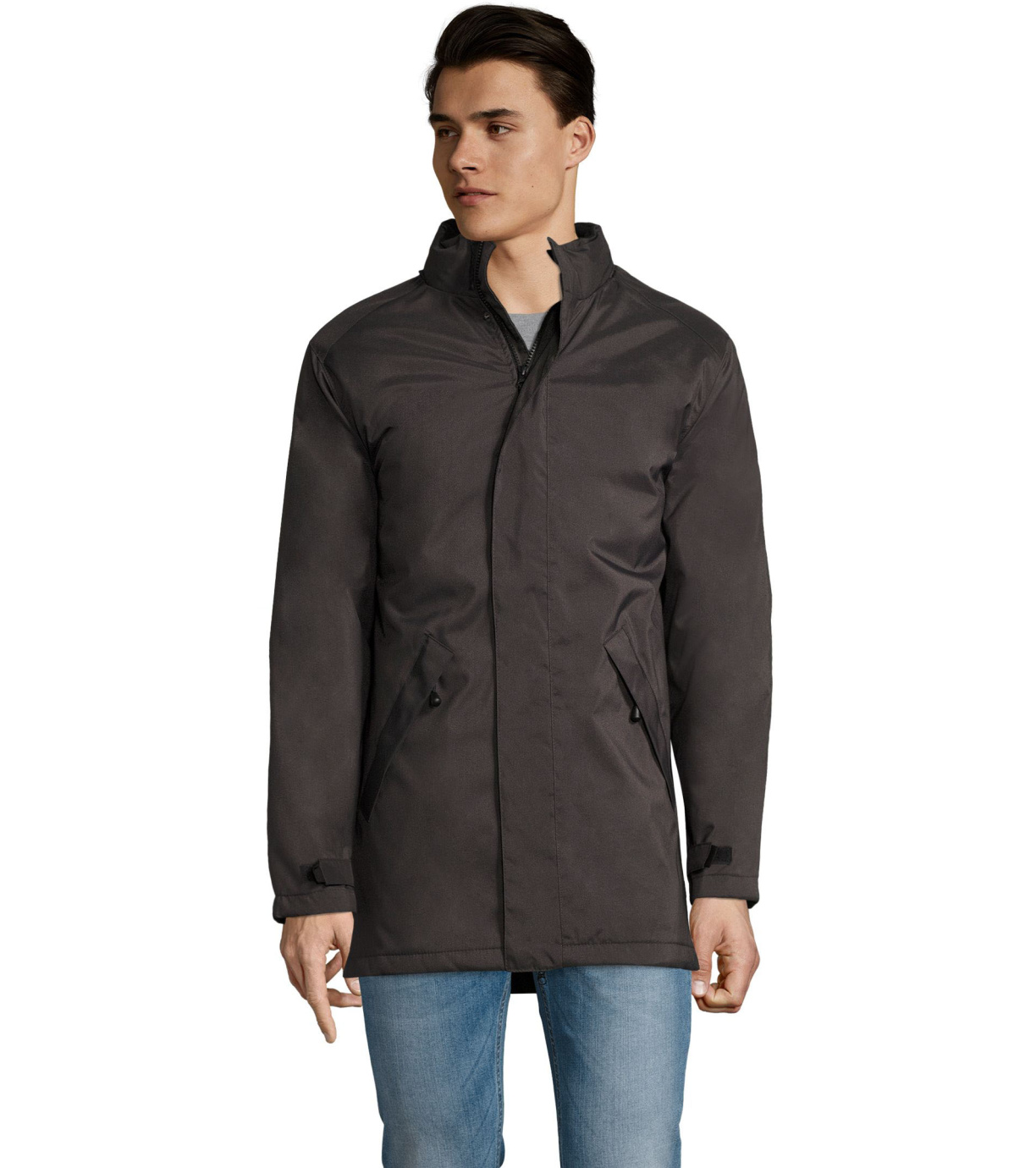 Męski płaszcz zapinany na podwójny zamek, listwę zapinaną na rzep i ukryte zatrzaski, ma wyściełany polarem kaptur schowany wewnątrz kołnierza. Płaszcz ma 2 kieszenie zapinane na zamek oraz 1 kieszeń wewnętrzną. Rękawy zakończone mankietami z rzepem.