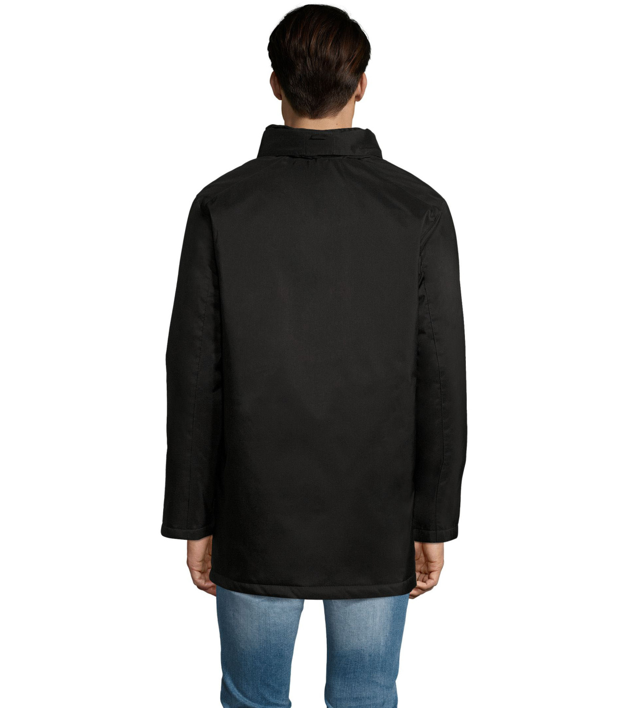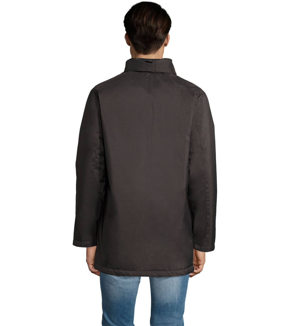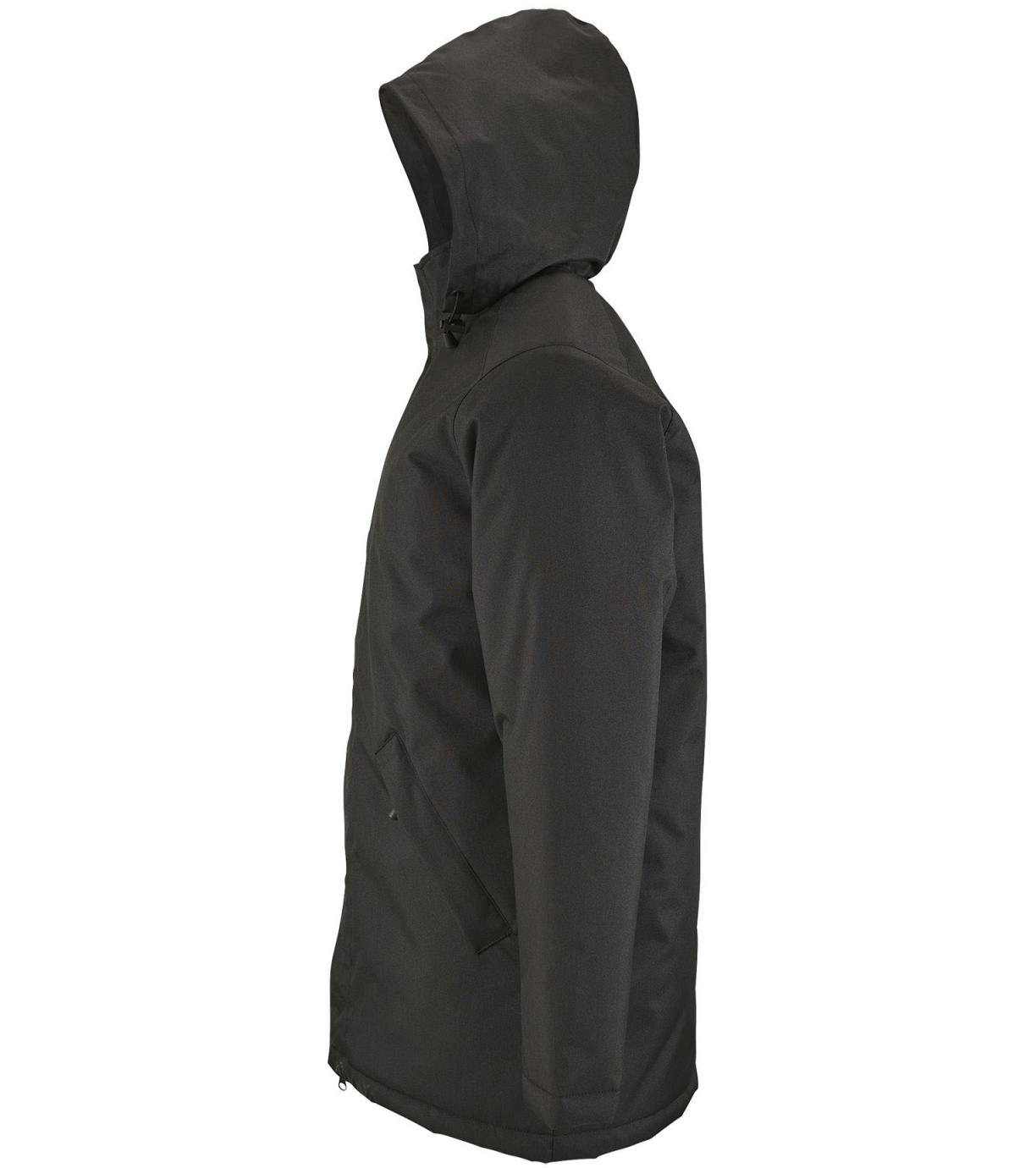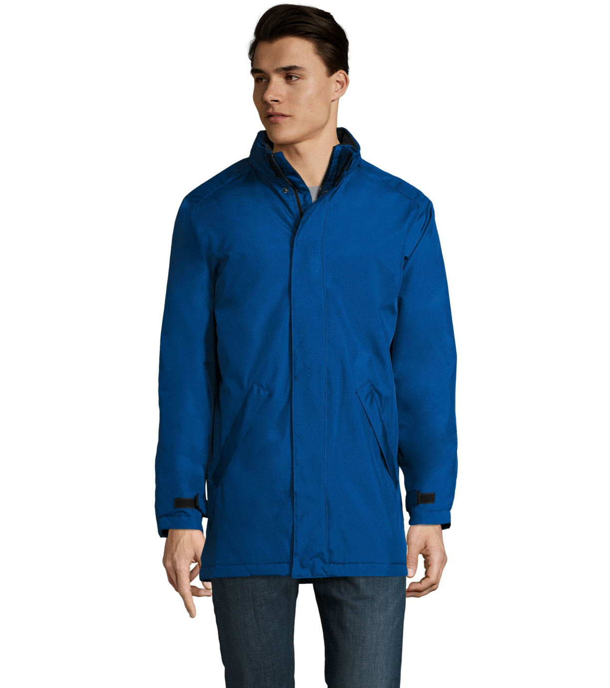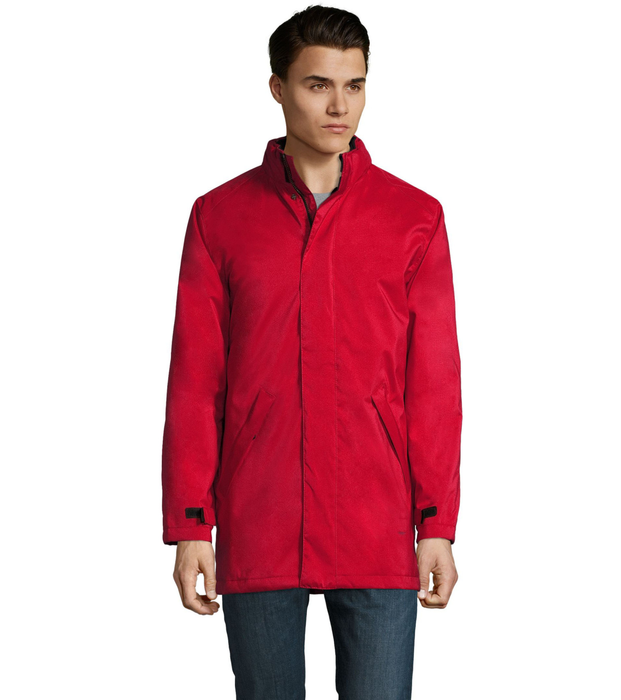 Męski płaszcz zapinany na podwójny zamek, listwę zapinaną na rzep i ukryte zatrzaski, ma wyściełany polarem kaptur schowany wewnątrz kołnierza. Płaszcz ma 2 kieszenie zapinane na zamek oraz 1 kieszeń wewnętrzną. Rękawy zakończone mankietami z rzepem.
