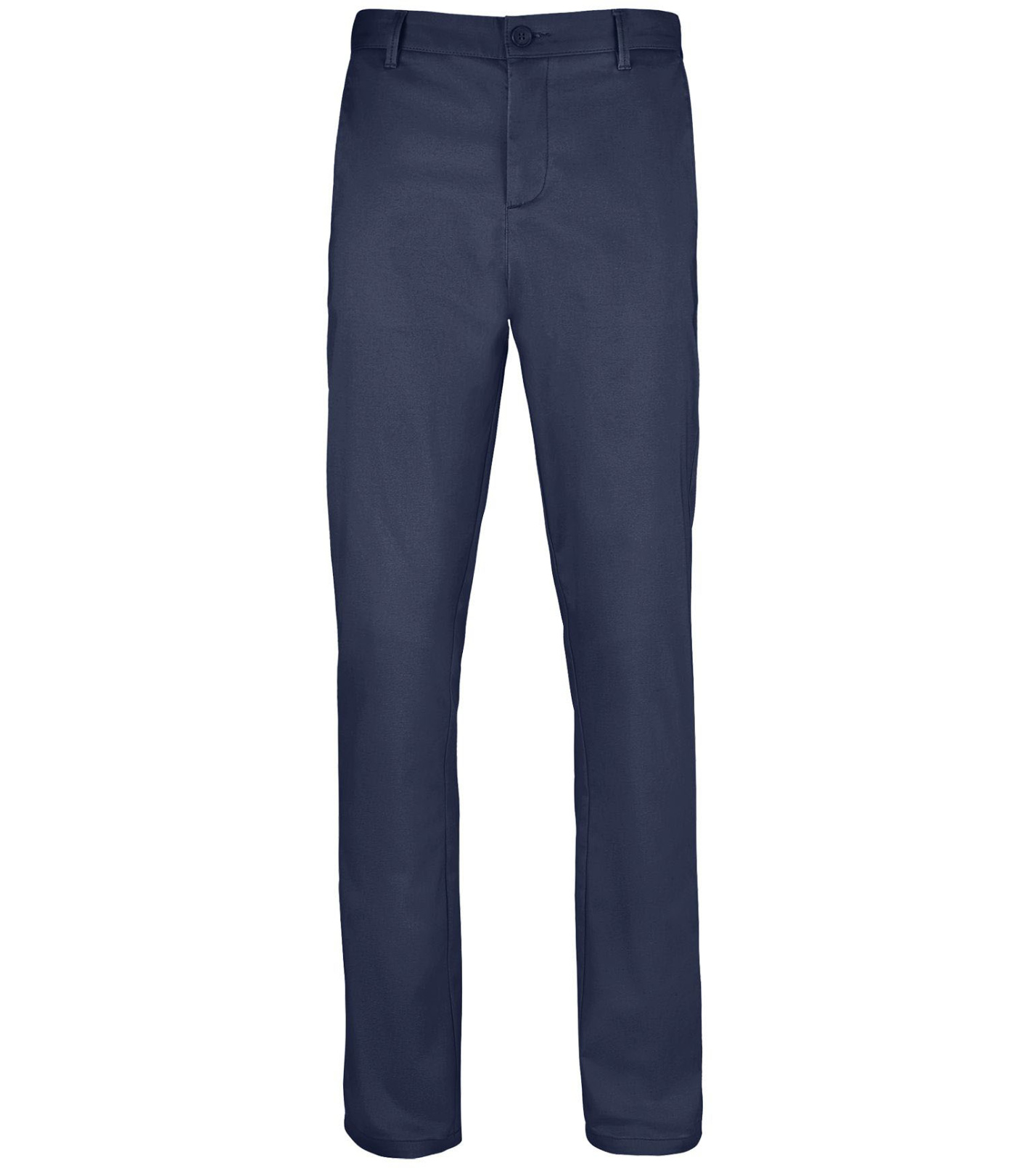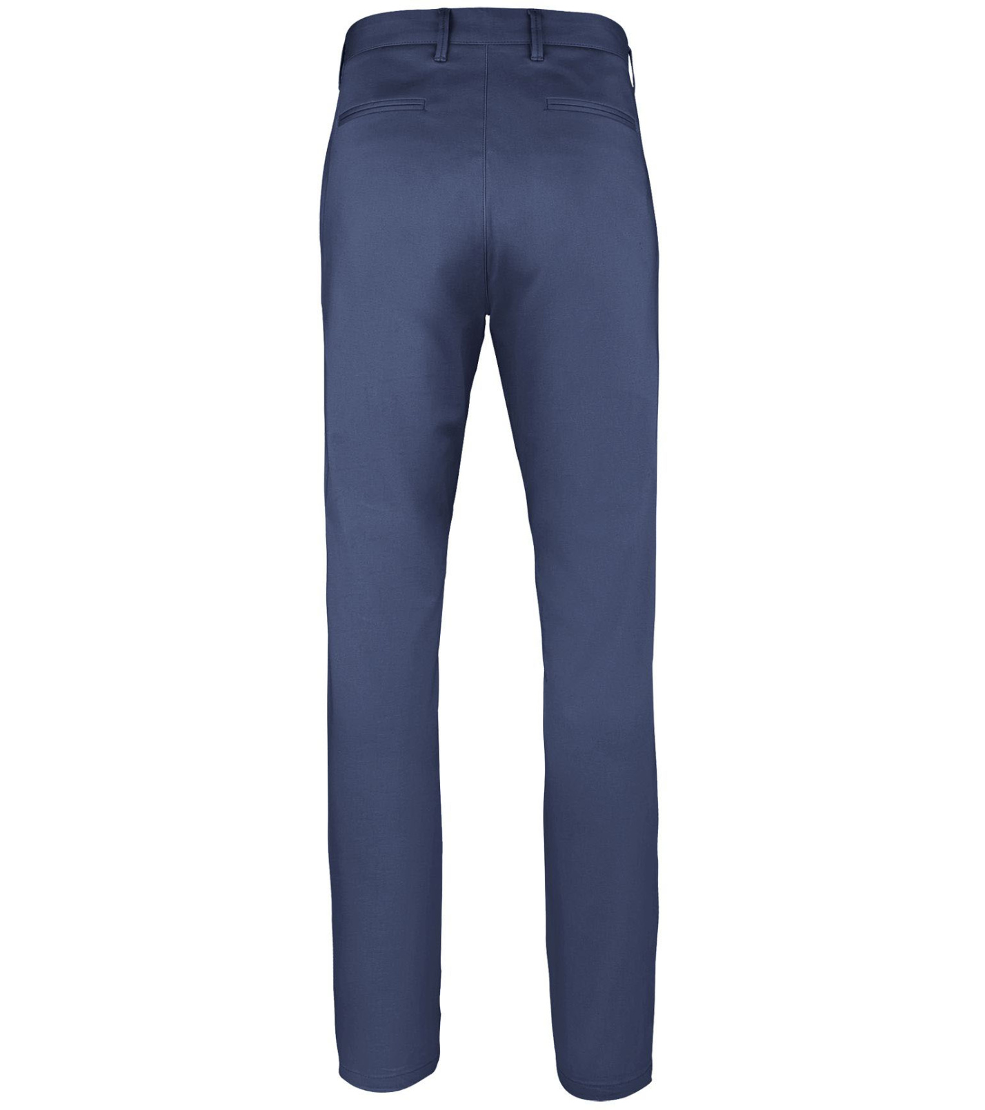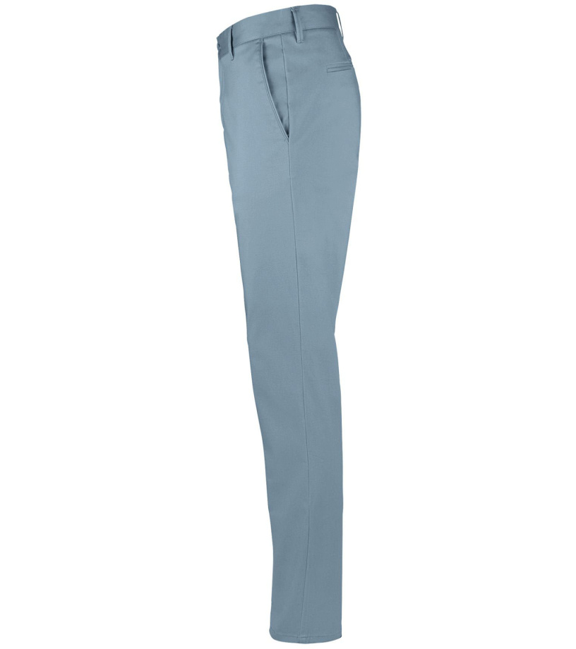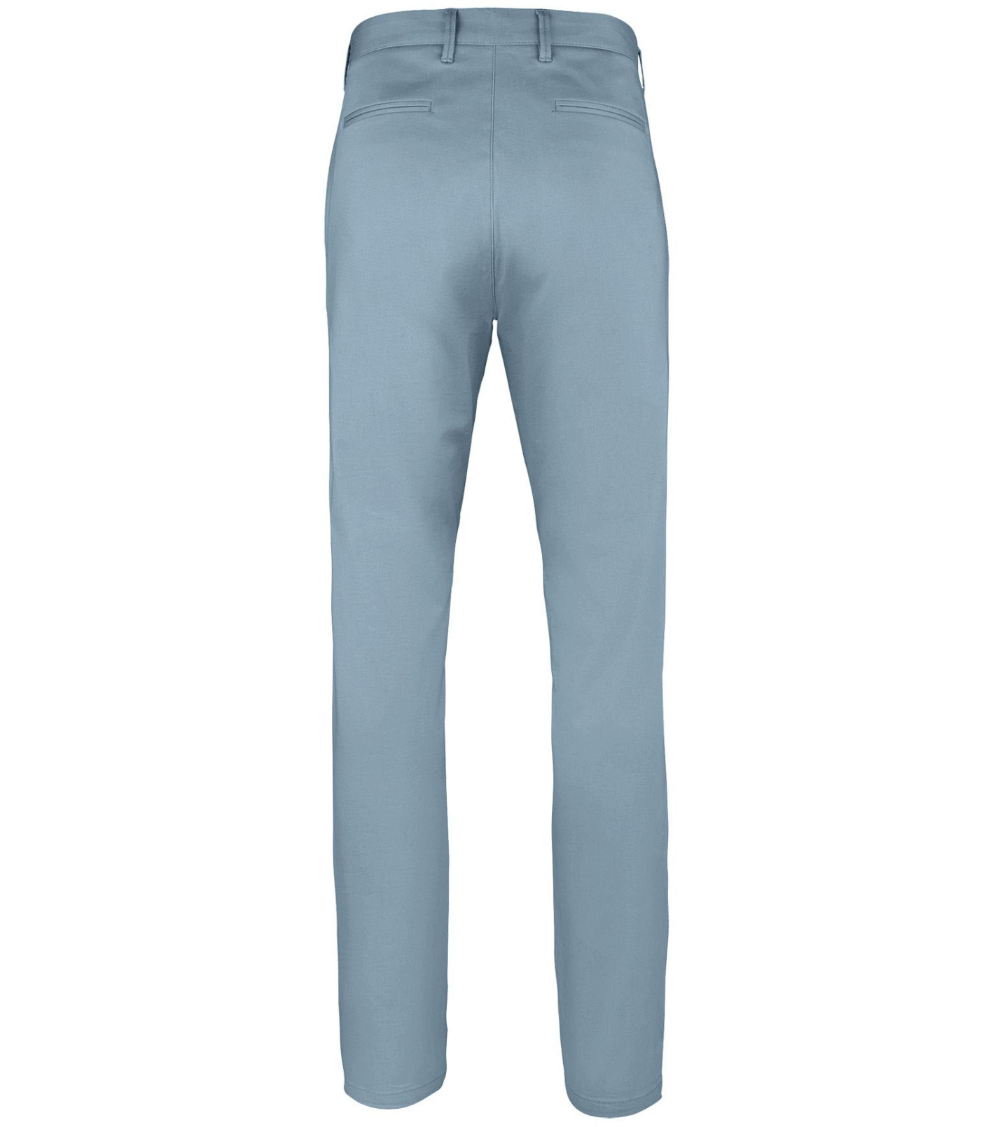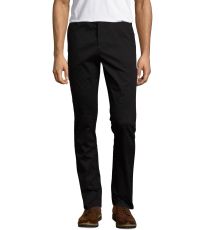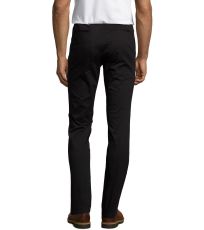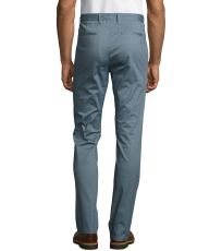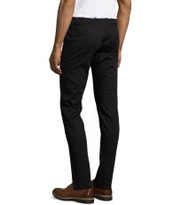 Satynowe spodnie męskie o dopasowanym kroju. Ma dwie kieszenie włoskie z przodu, 2 kieszenie z tyłu, małą kieszonkę oraz szlufki na pasek.
