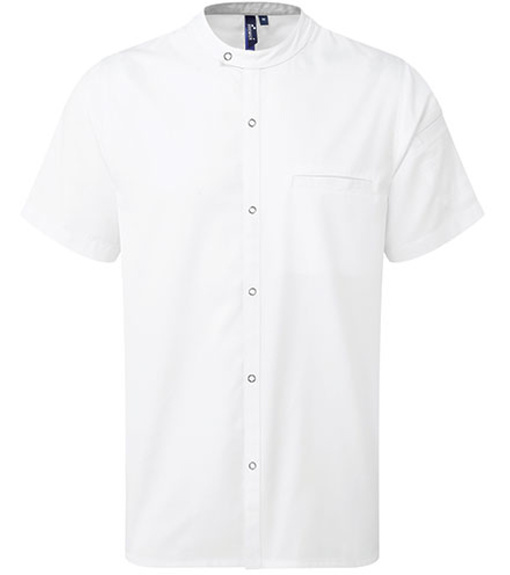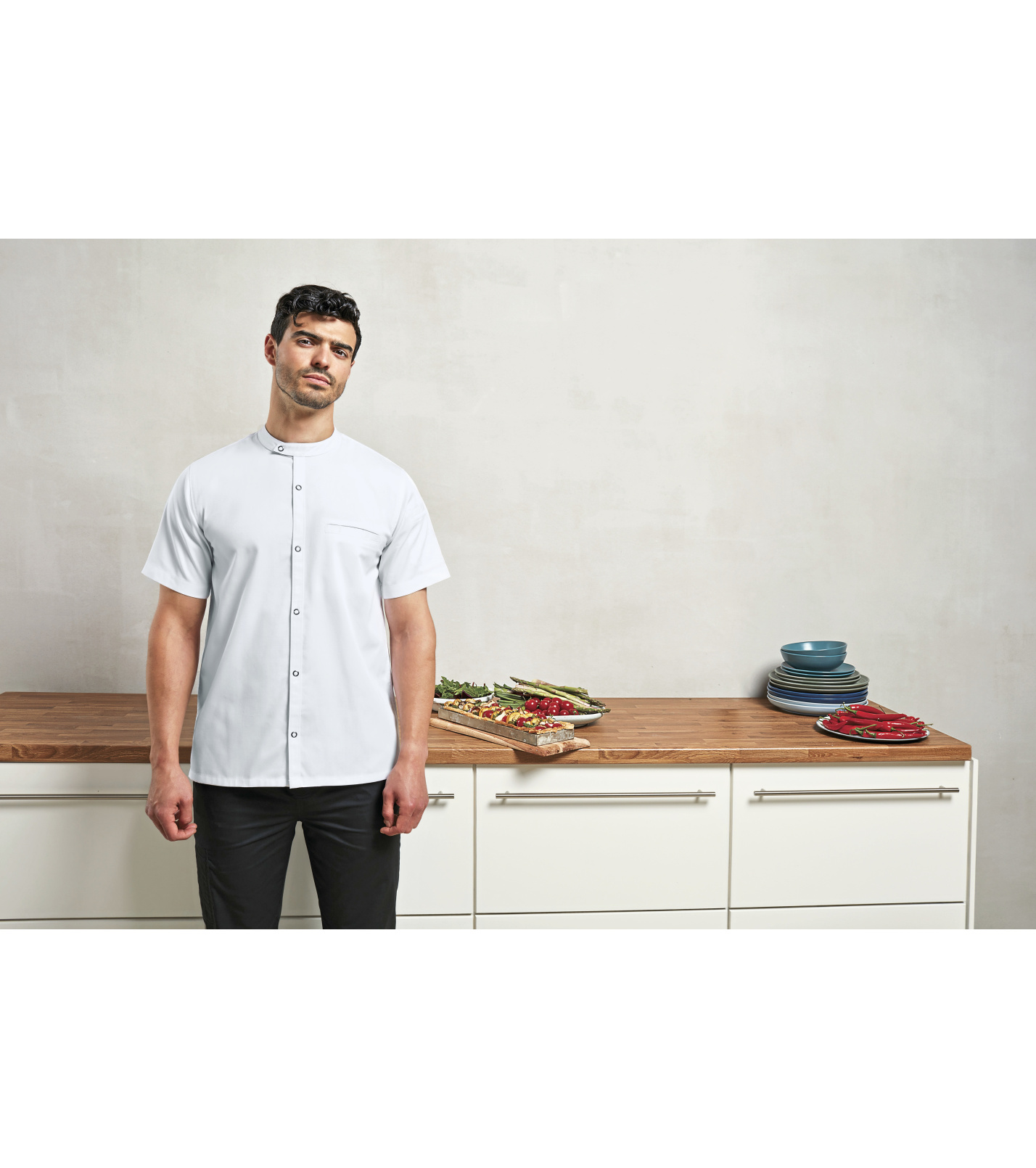 Wykonane w 65% z poliestru pochodzącego z recyklinguKołnierzyk typu mandarin z zapięciem na zatrzaski na środku plisy