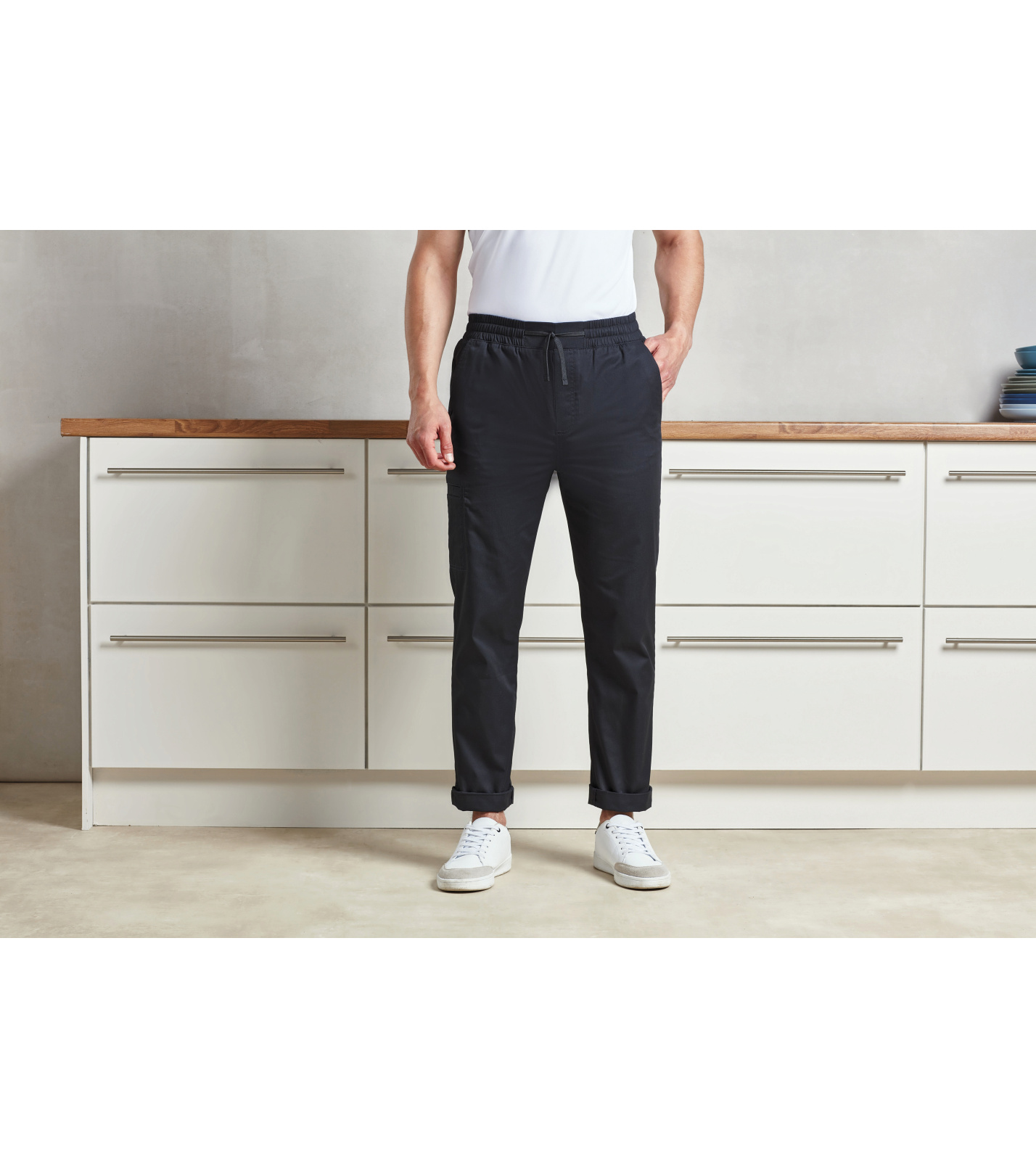 Wykonane w 65% z poliestru pochodzącego z recyklinguZwężana dolna część nogawki z opcjonalnymi podwiniętymi obszyciami