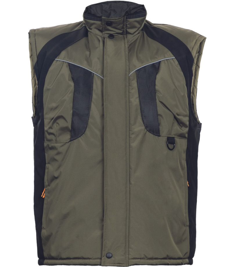 Opis: • wodoodporna, ocieplana kamizelka z wysokim kołnierzem • tkanina wykonana z mieszanki nylonowych włókien, z wykończeniem RipStop • dół kamizelki z możliwością regulacji obwodu za pomocą elastycznego sznurka • dostosowana do haftu maszynowego • elementy odblaskowe • wydłużone tasiemki przy wodzikach