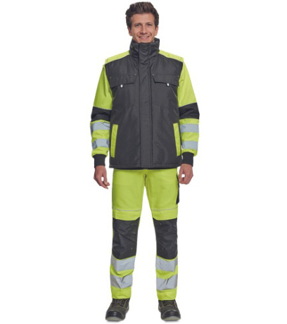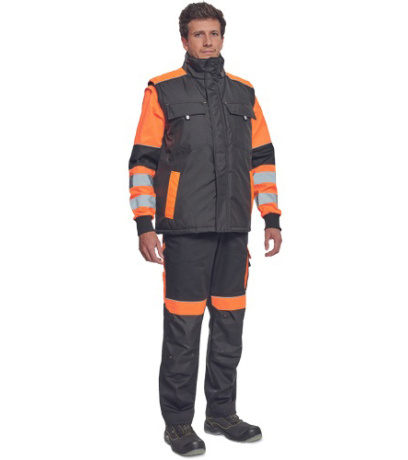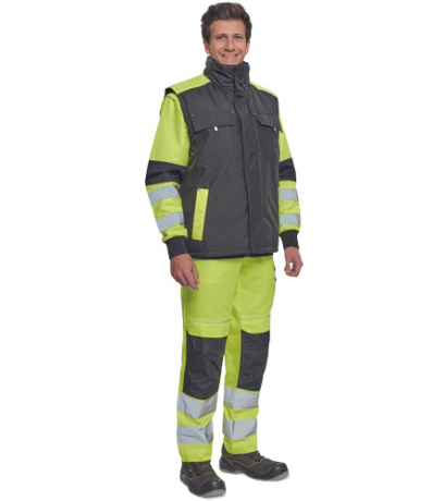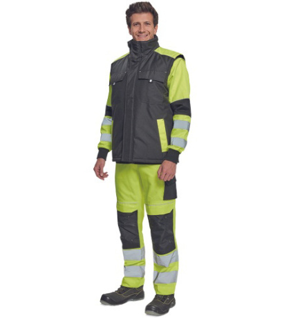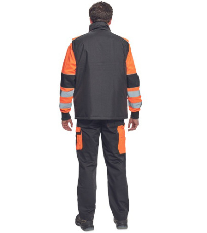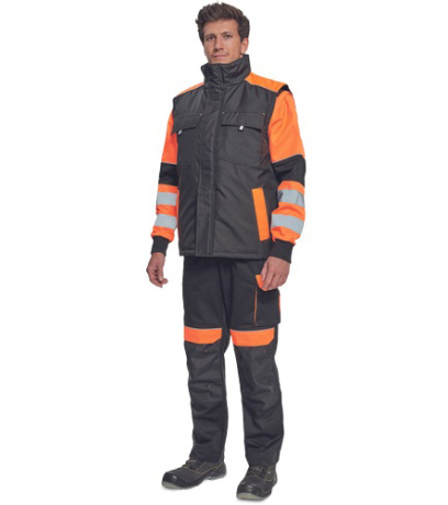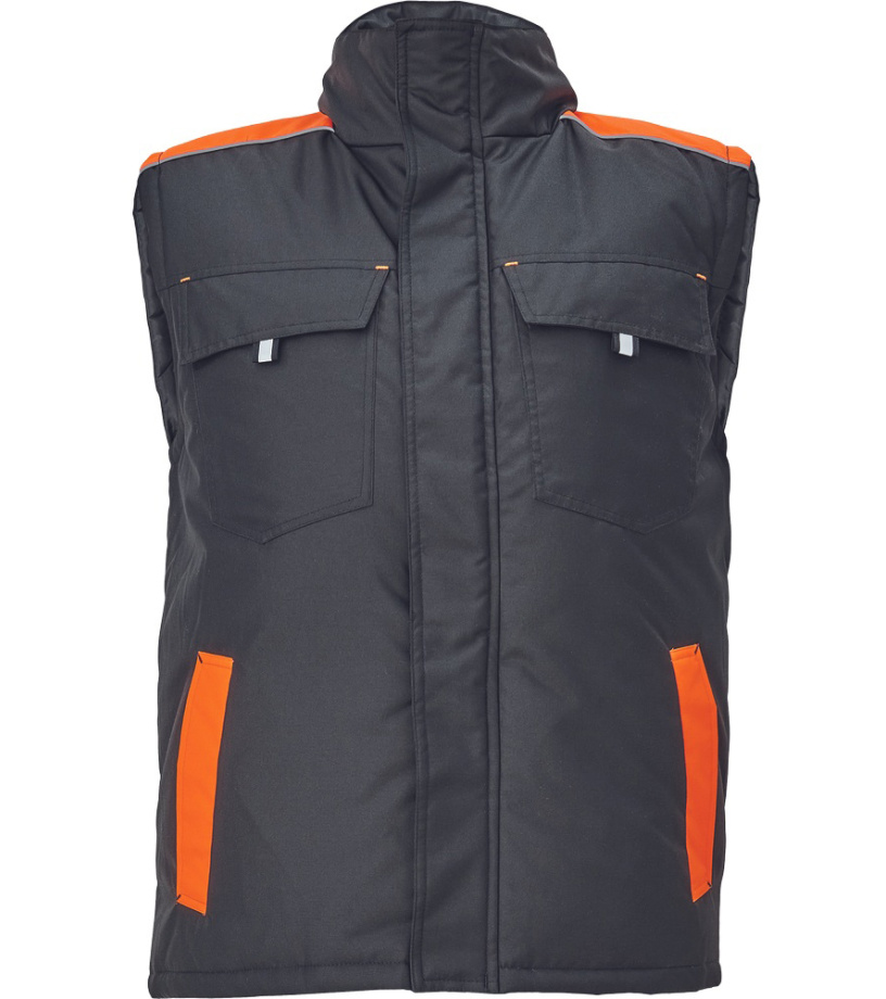 Opis: men´s winter bodywarmer; zipper closure covered by velcro flap; hood integrated in a collar; 2 side pockets, 2 chest pockets; 1 inner cell phone pocket; reflective elements.