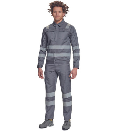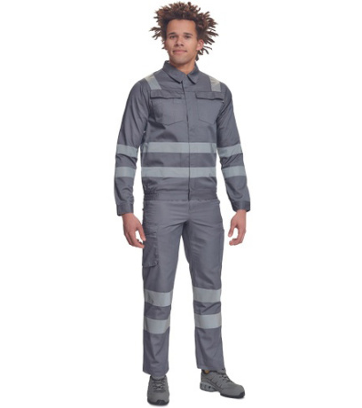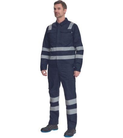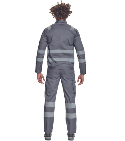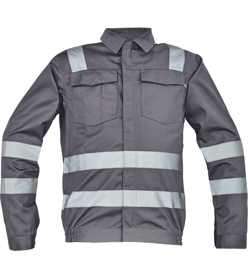 Opis: męska kurtka robocza z odblaskowymi taśmami o szerokości 5 cm; zapinana na suwak zakryty plisą zapinaną na rzep; 2 duże kieszenie napiersiowe z klapką; w dolnej części elastyczne wstawki; mankiety zapinane na rzep