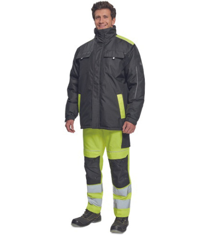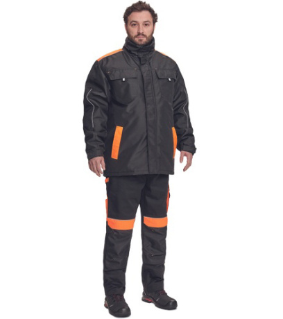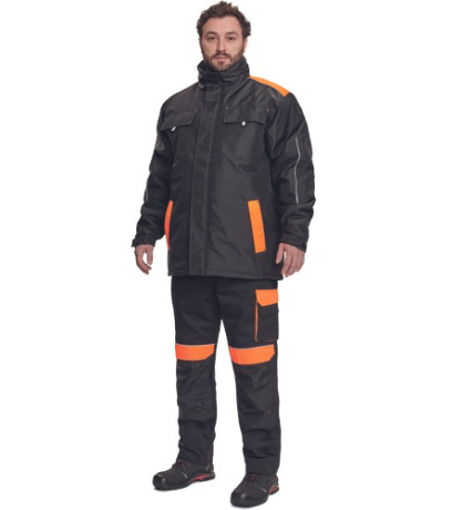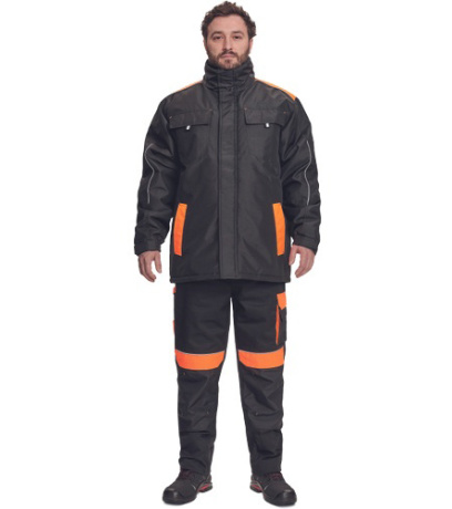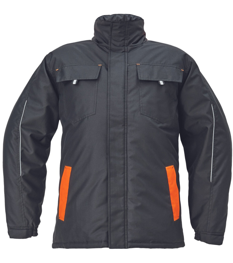 Opis: men´s winter parka; zipper closure covered by velcro flap; hood integrated in a collar; 2 side pockets, 2 chest pockets; 1 inner cell phone pocket; elastic cuffs with velcro adjustment; reflective elements.