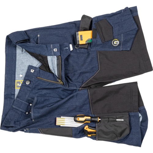 Opis: męskie szorty robocze z elastycznego dżinsu "pre-washed" połączonego z elementami unikalnego, trwałego materiału CORDURA, TrifibetexPRO® i Trifibetex® w miejscach wymagających wzmocnienia, 2 przednie kieszenie klinowe, 2 tylne kieszenie zapinane na rzep, po lewej stronie duża kieszeń wielofunkcyjna, po prawej stronie wielofunkcyjne kieszenie na miarę i nóż + uchwyt na ołówek, metalowy pierścień „D”, paski na narzędzia i patent elastycznego pasa