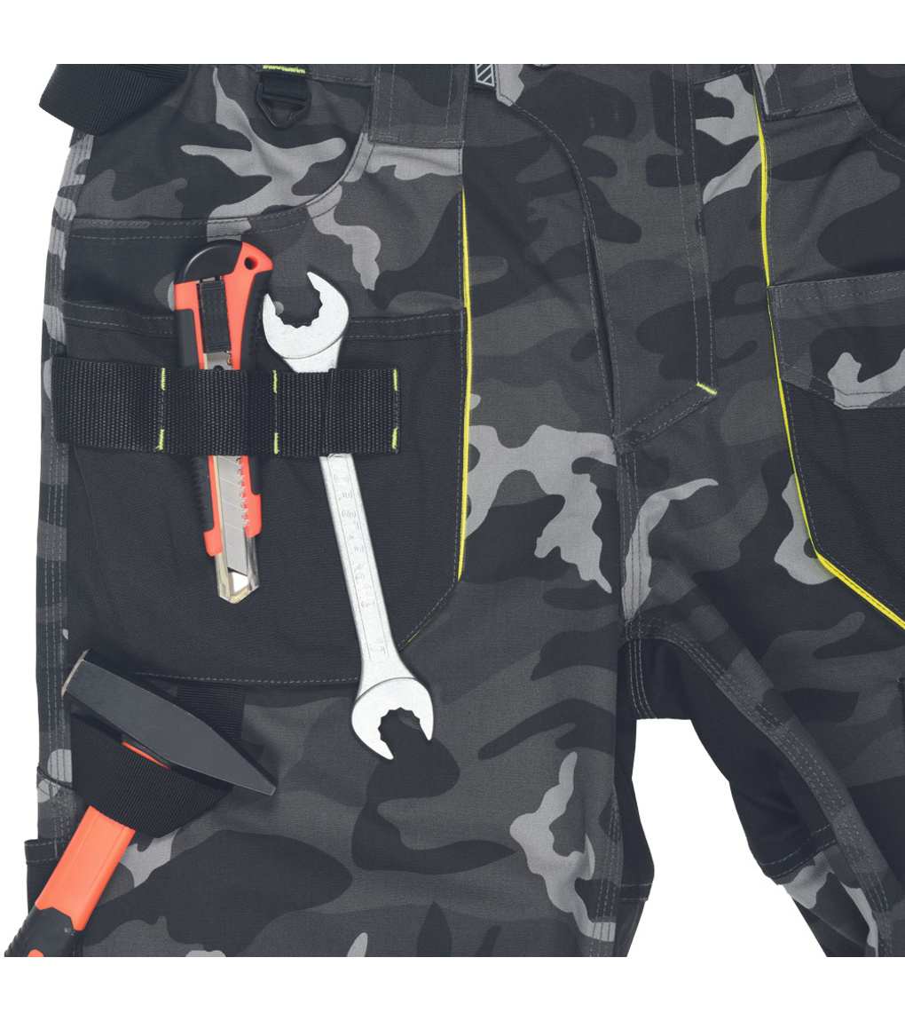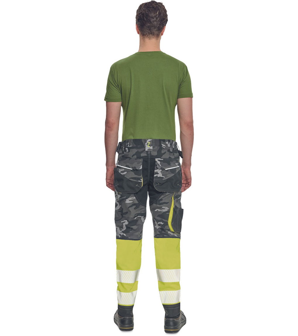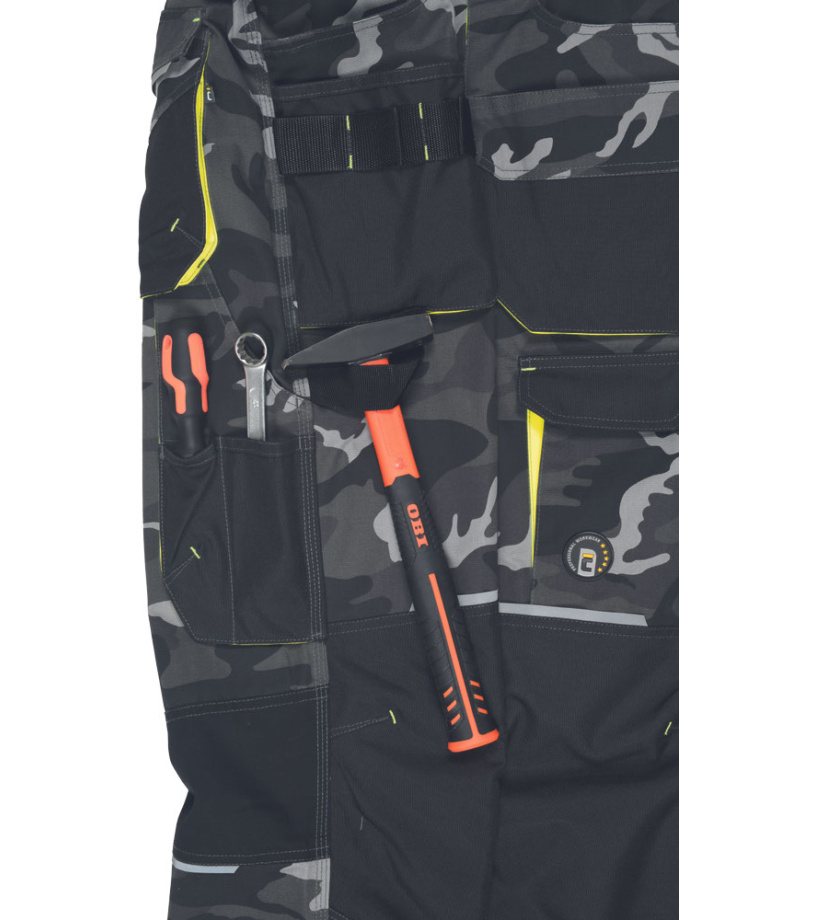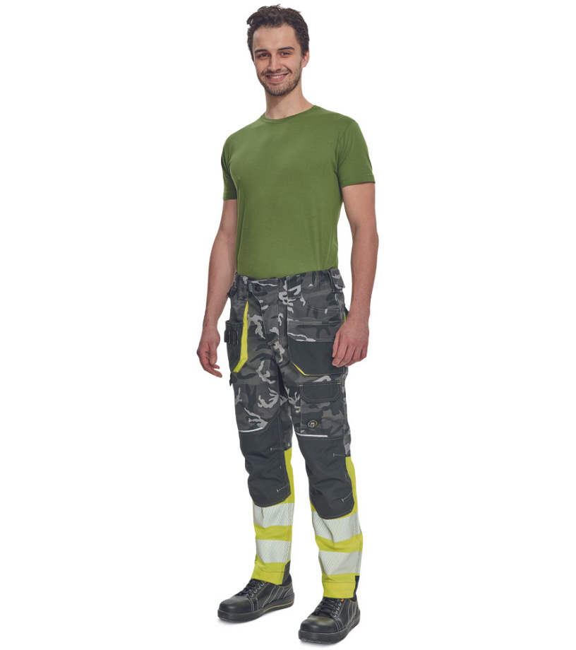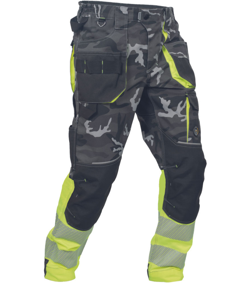 Męskie spodnie robocze HI-VIS z elastyczną talią i wielofunkcyjnymi kieszeniami • w nowoczesnym, szarym kamuflażu • kieszenie na kolanach wzmocnione materiałem Oxford 600D, umożliwiające włożenie nakolanników • trwałe potrójne szwy na nogawkach i siedzisku • 2 odblaskowe, segmentowane paski o szerokości 7 cm w dolnej części nogawek • regulowana długość nogawek