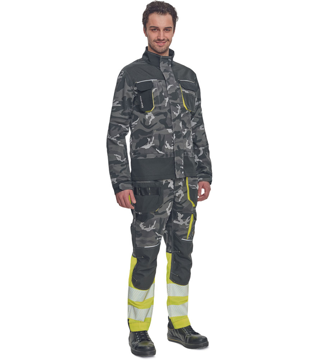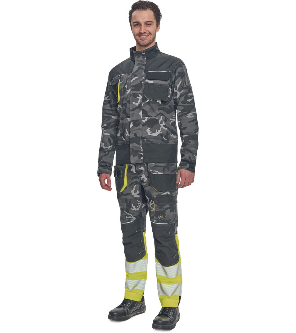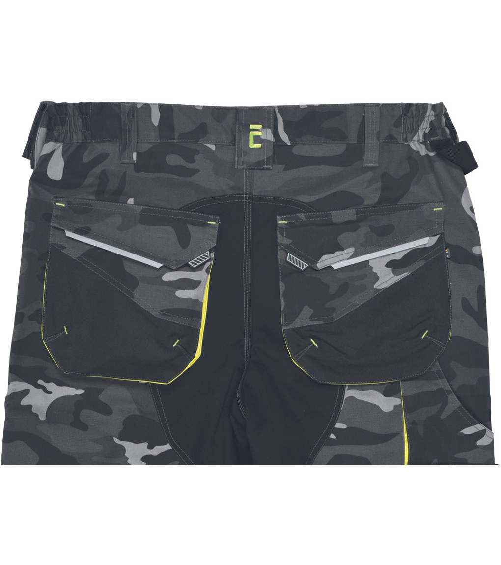 Męskie spodnie robocze HI-VIS z elastyczną talią i wielofunkcyjnymi kieszeniami • w nowoczesnym, szarym kamuflażu • kieszenie na kolanach wzmocnione materiałem Oxford 600D, umożliwiające włożenie nakolanników • trwałe potrójne szwy na nogawkach i siedzisku • 2 odblaskowe, segmentowane paski o szerokości 7 cm w dolnej części nogawek • regulowana długość nogawek